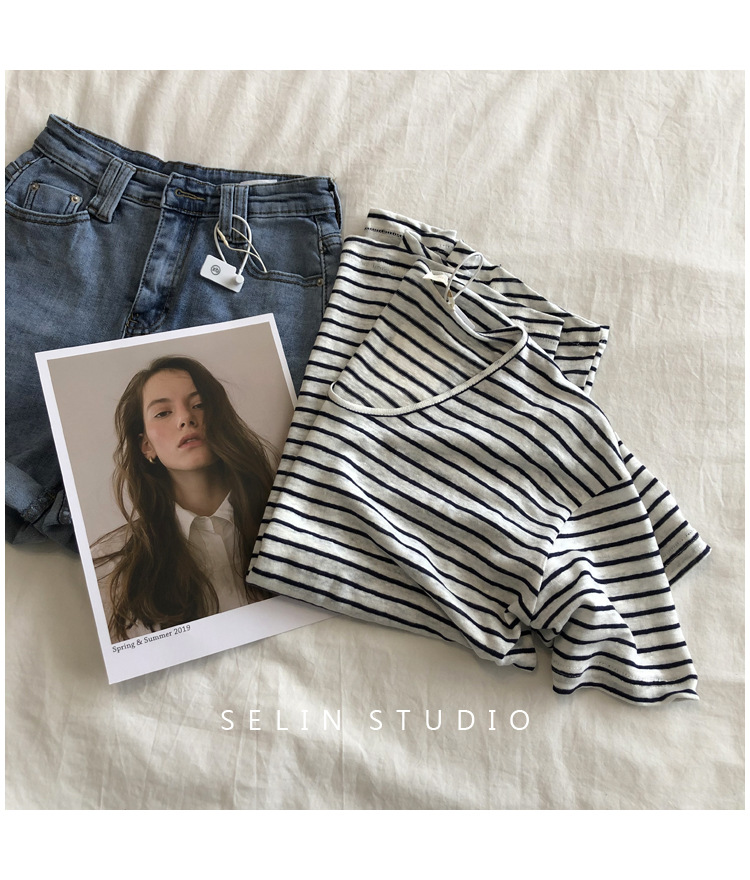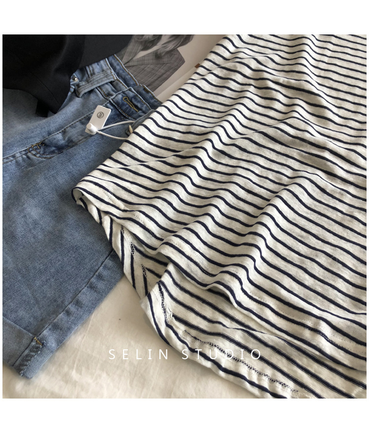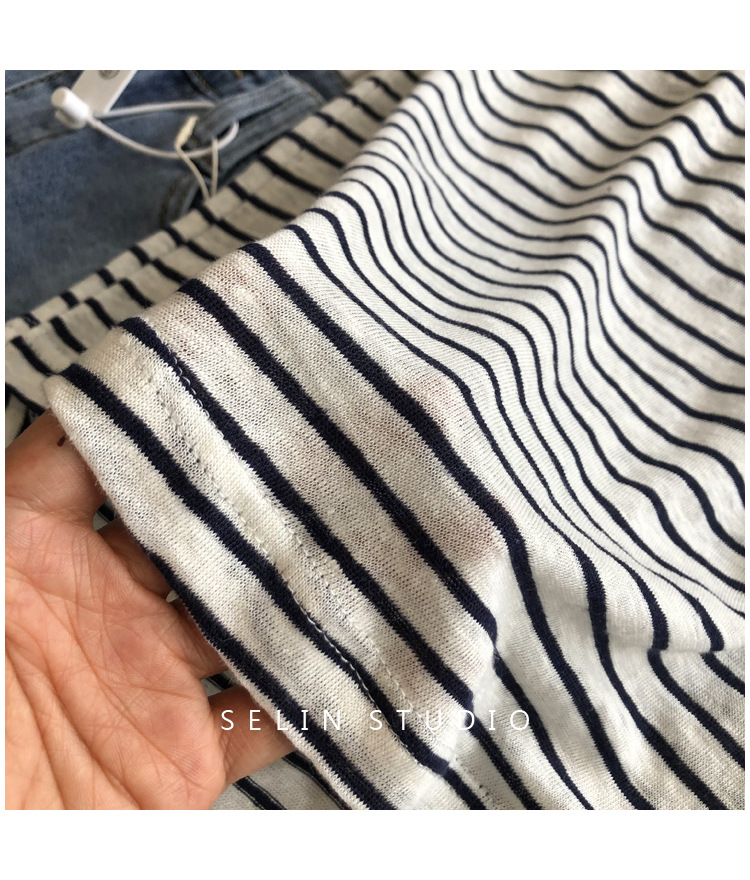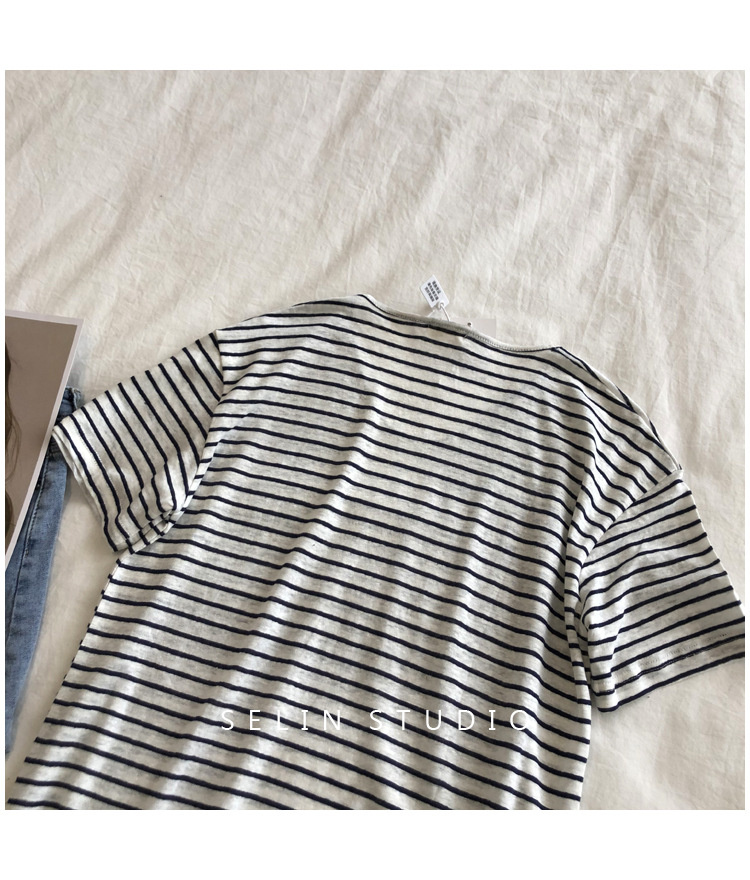 상쾌한 통기성 복고풍 시대-느슨한 게으른 린넨 코튼 스트라이프 라운드 넥 짧은 소매 티셔츠 여성의 다재다능한 슬리밍 탑 여름스토어 가기