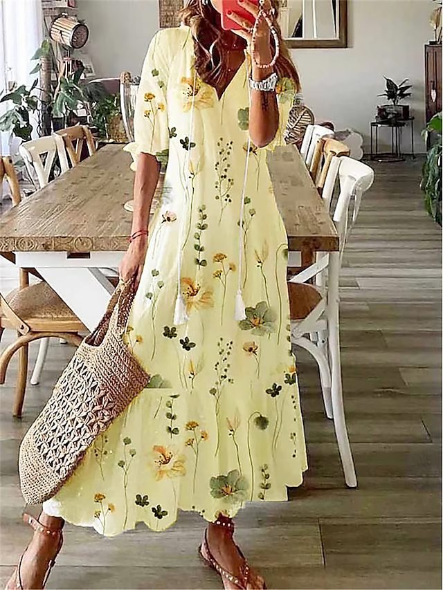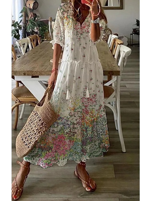 2025 유럽과 미국의 국경 간 뜨거운 판매 캐주얼 달콤한 느슨한 v 넥 인쇄 매달려 수염 중간 소매 긴 드레스 여성 재고 있음스토어 가기
