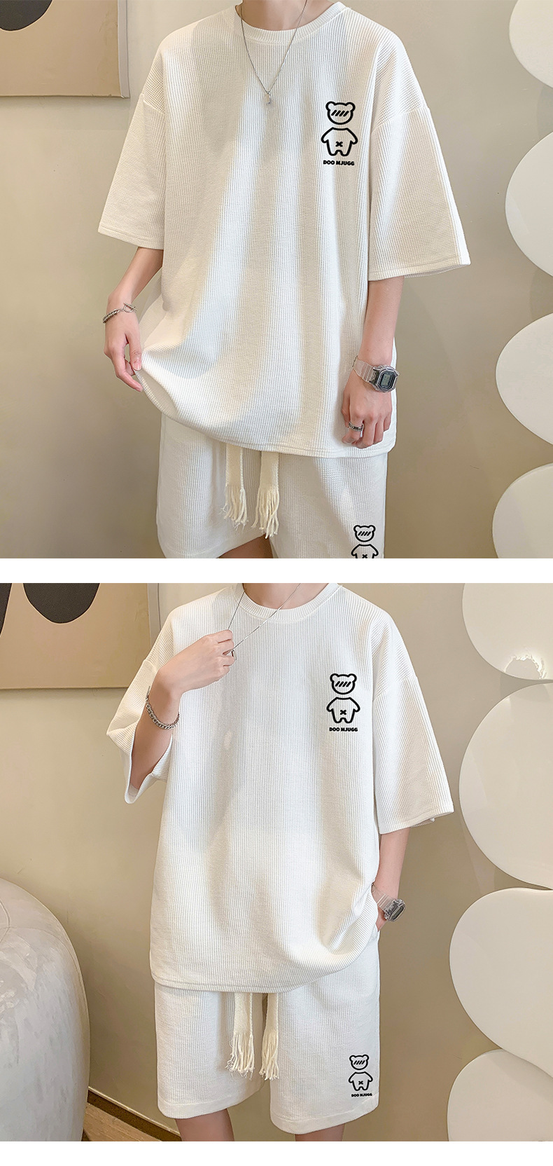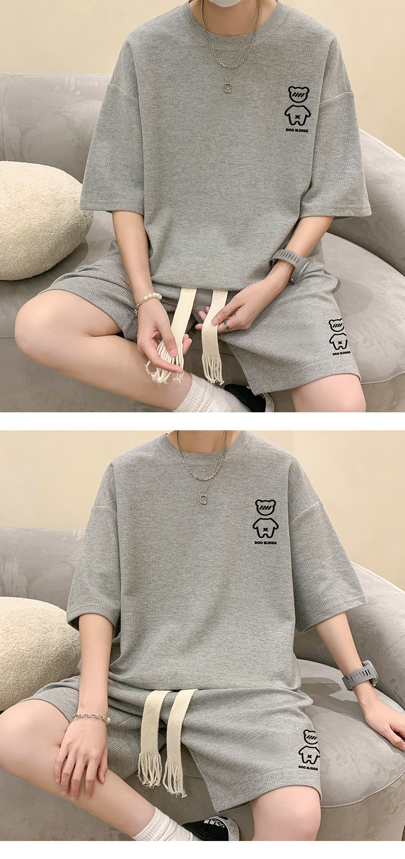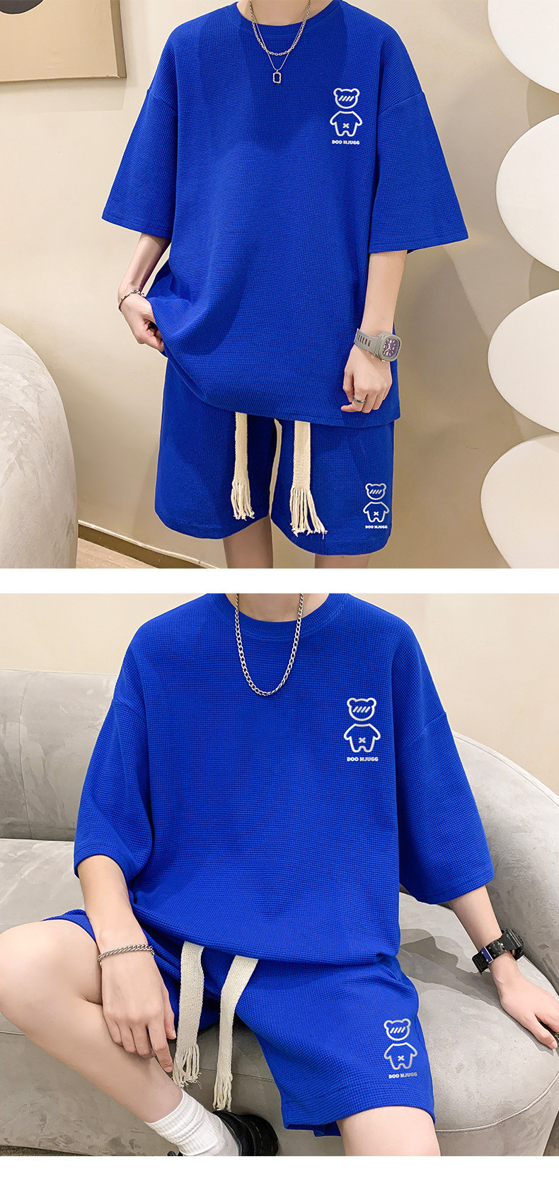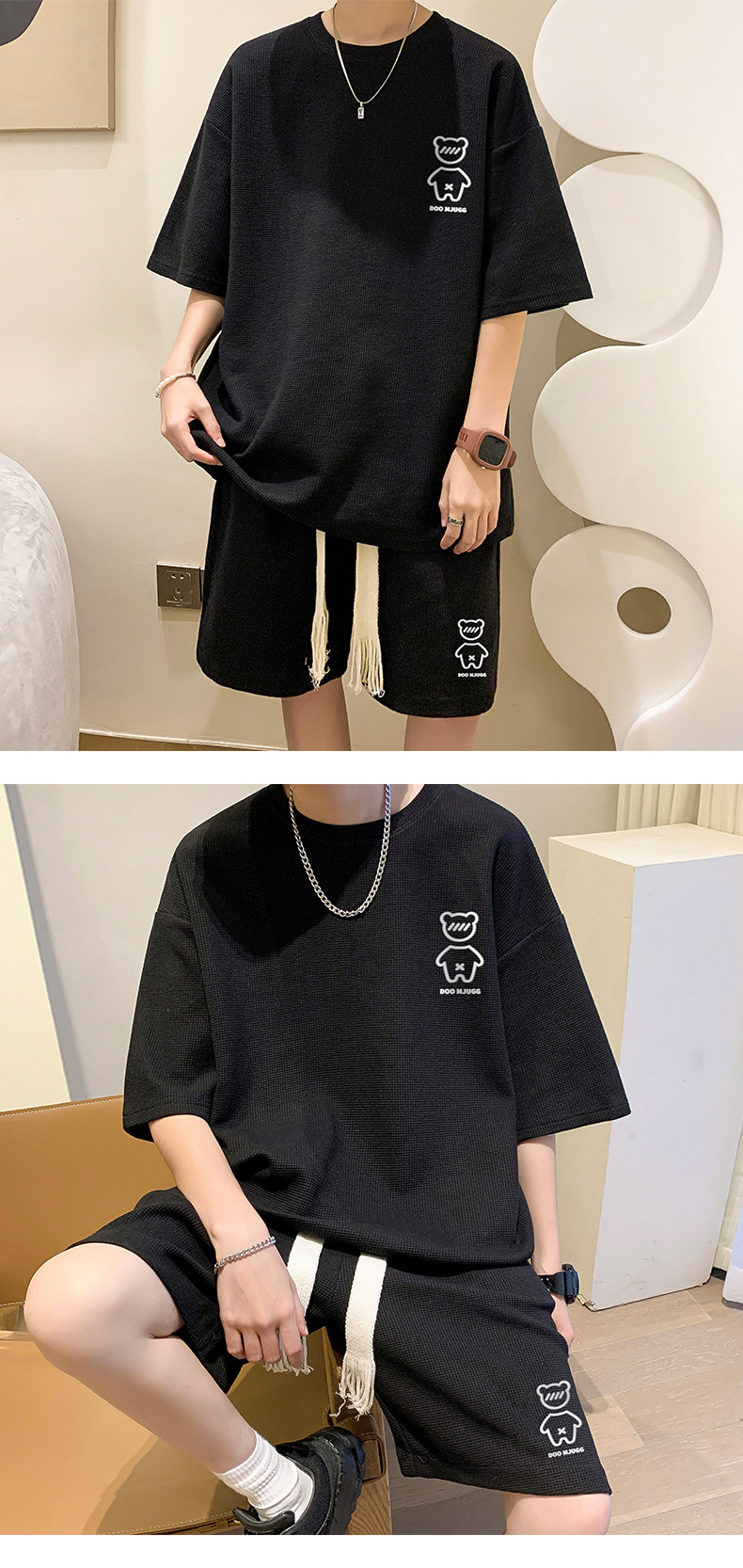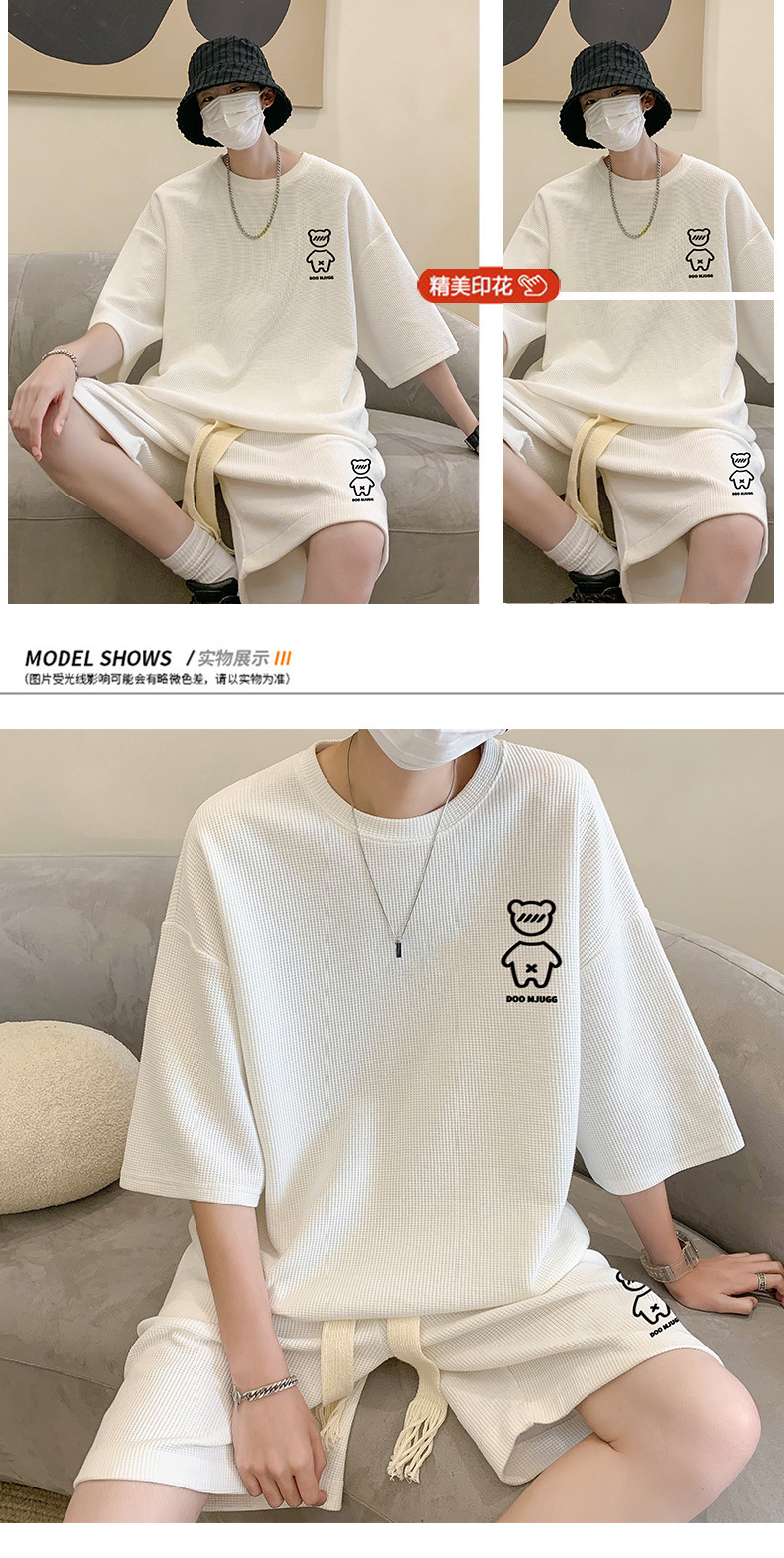 套装 重磅华夫格套装小熊男T恤短裤两件套大码港风