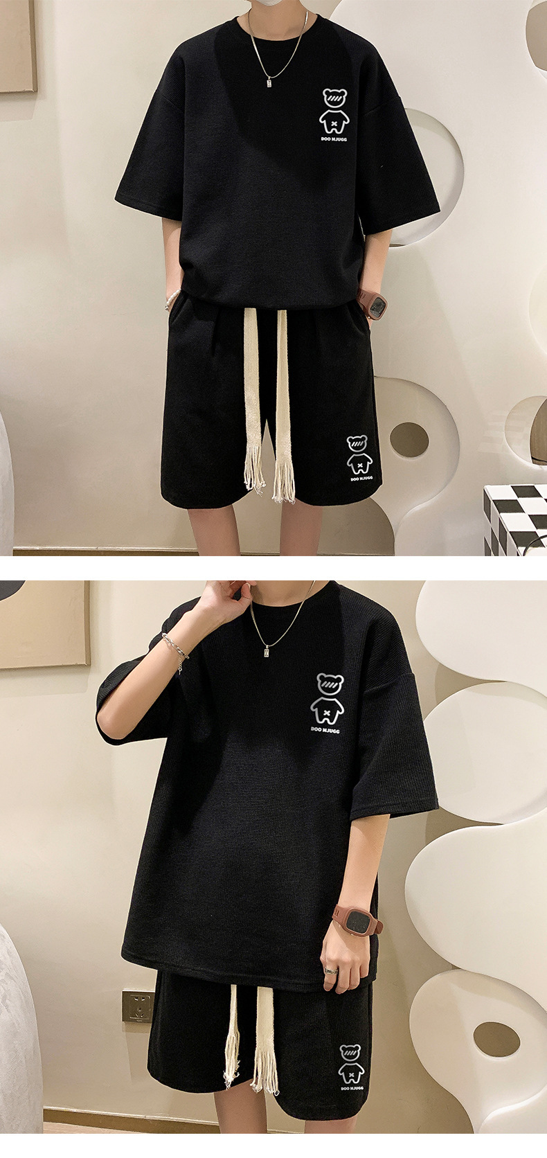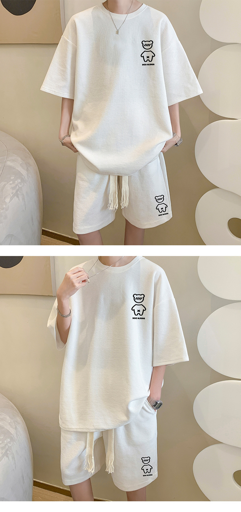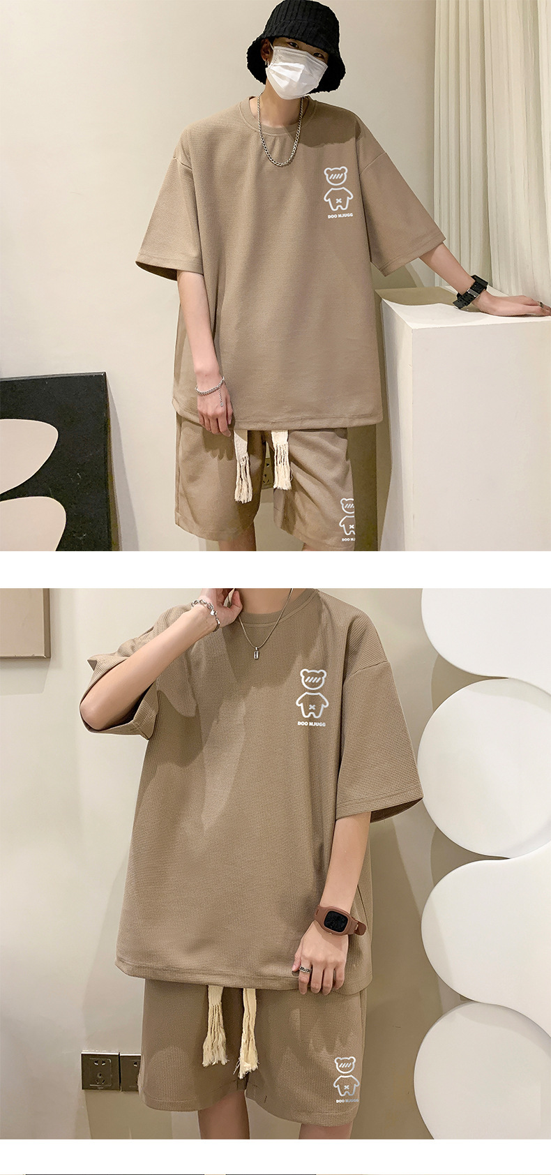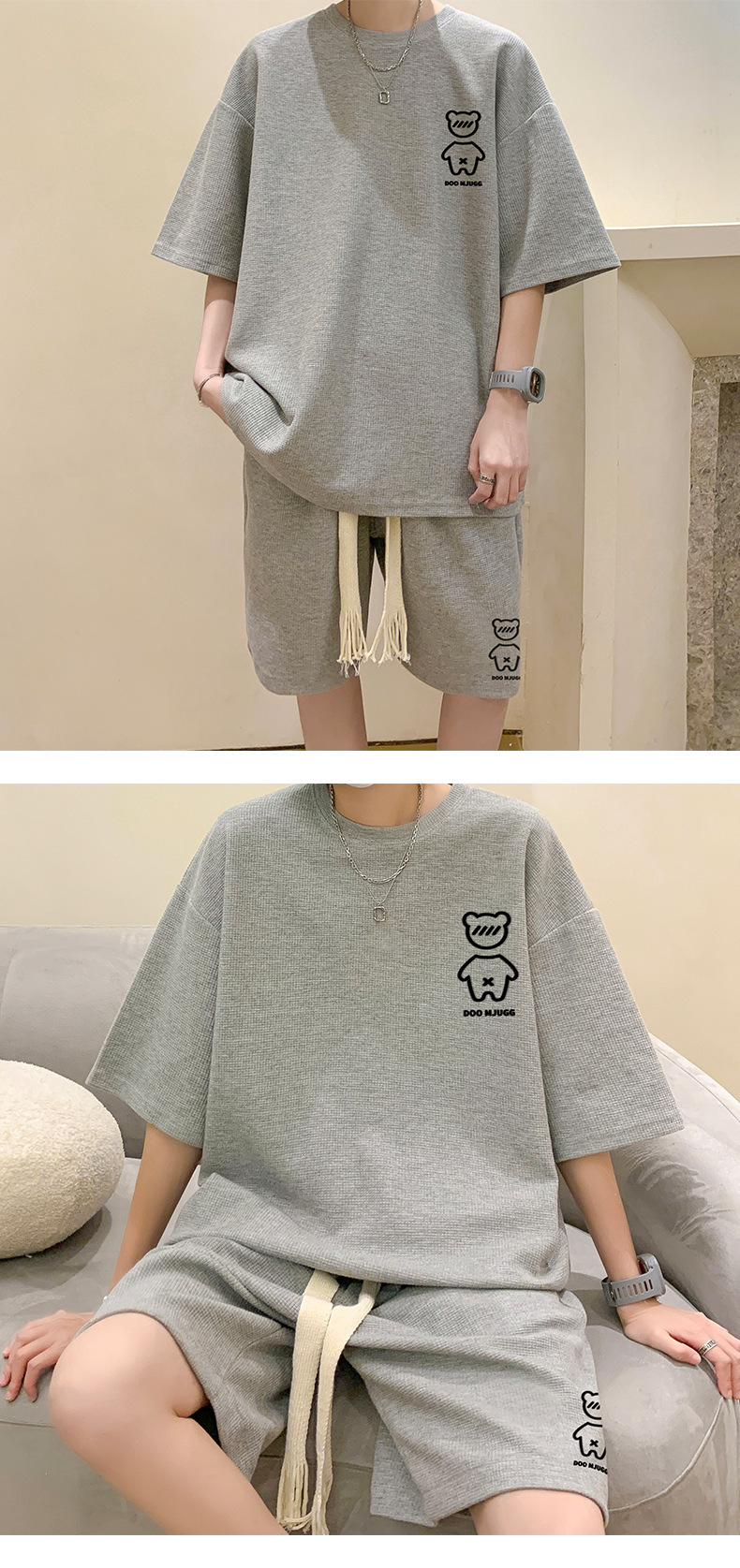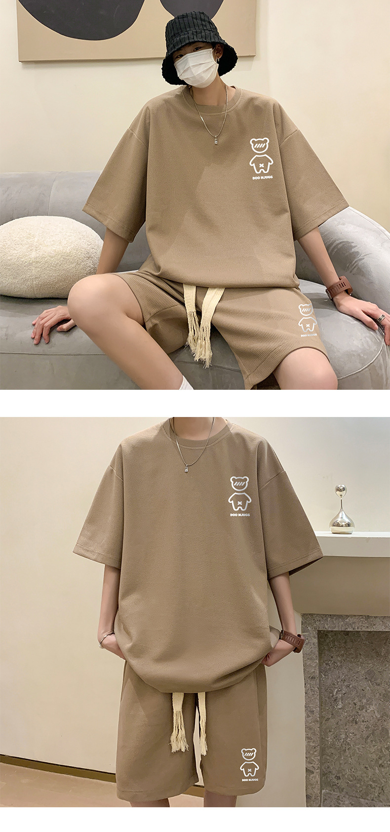 套装 重磅华夫格套装小熊男T恤短裤两件套大码港风