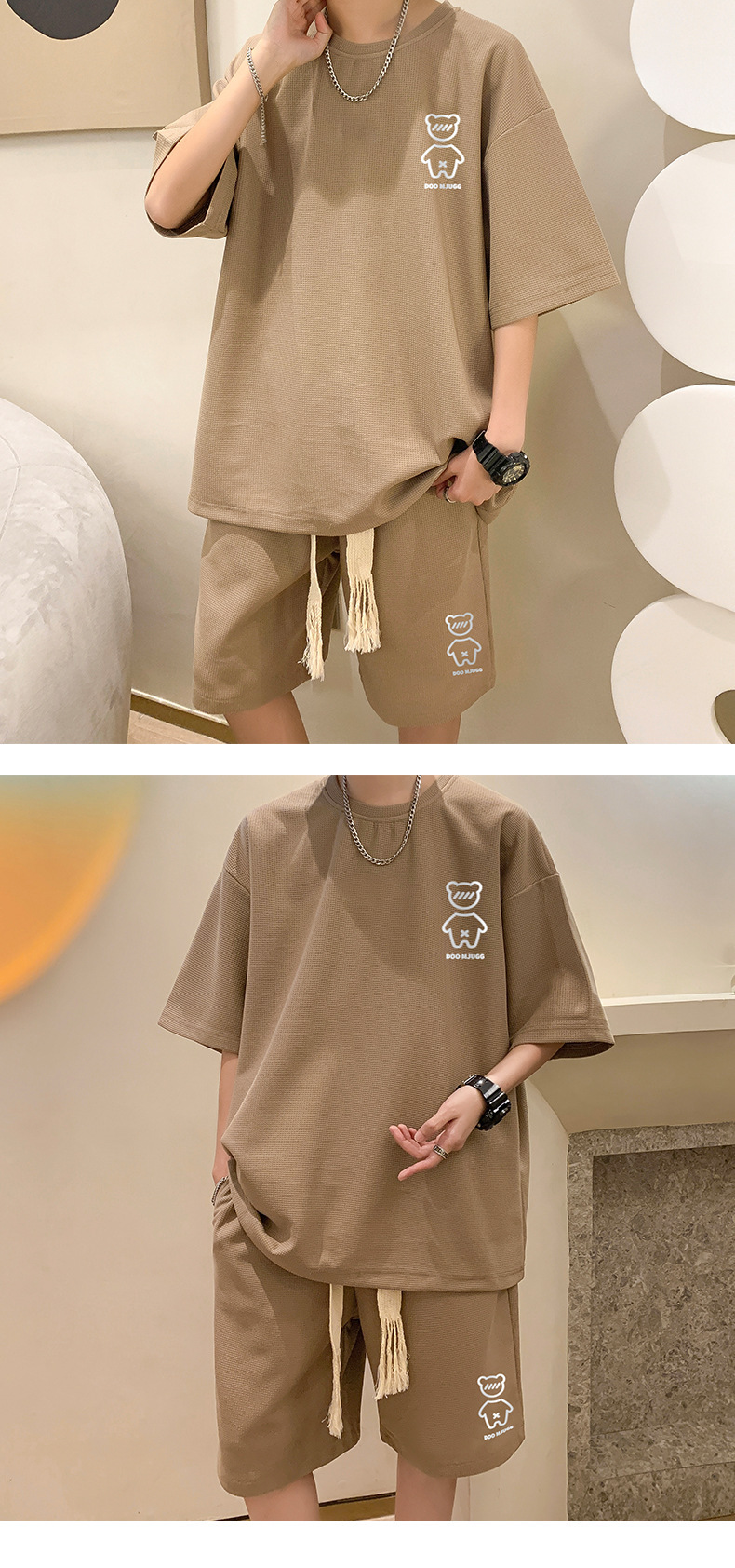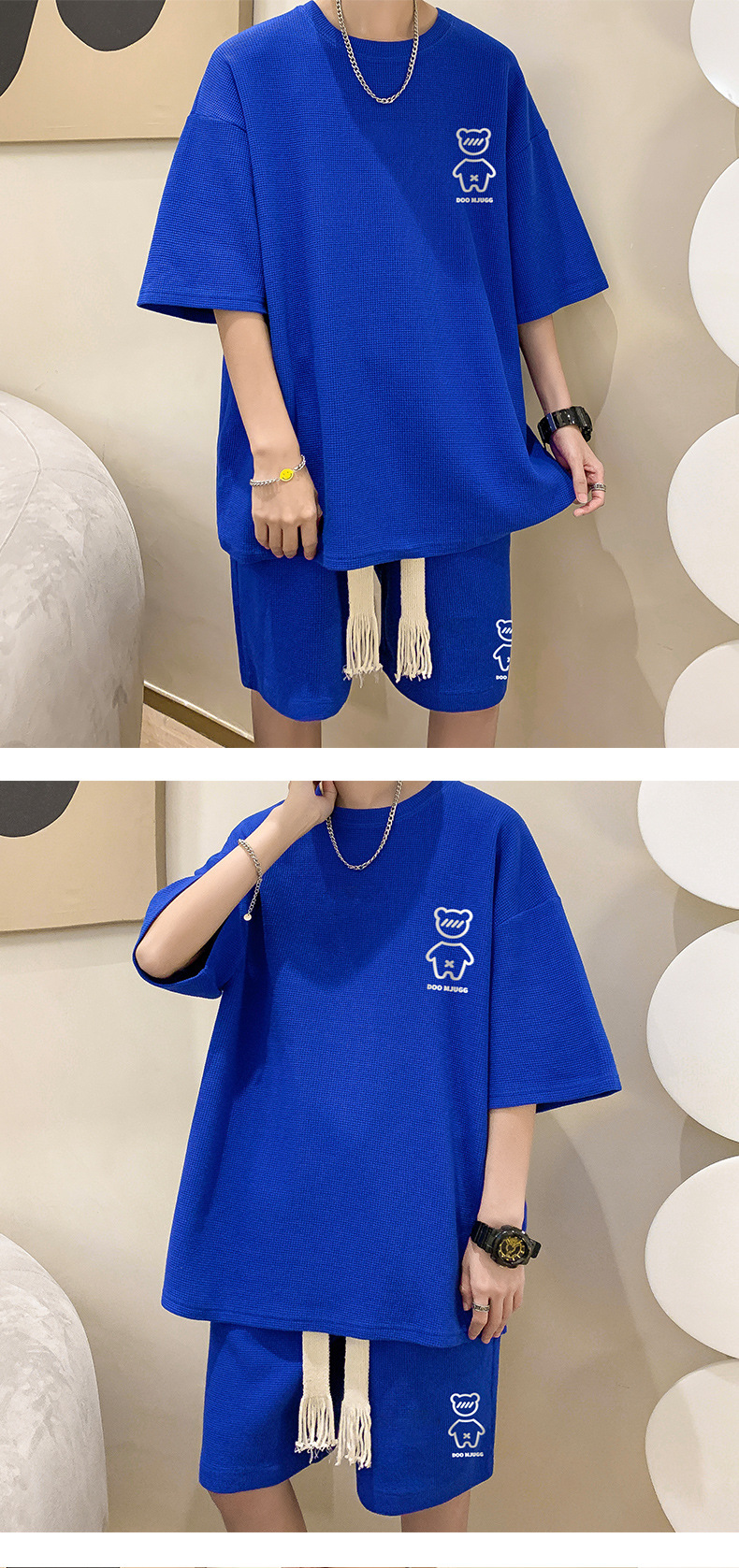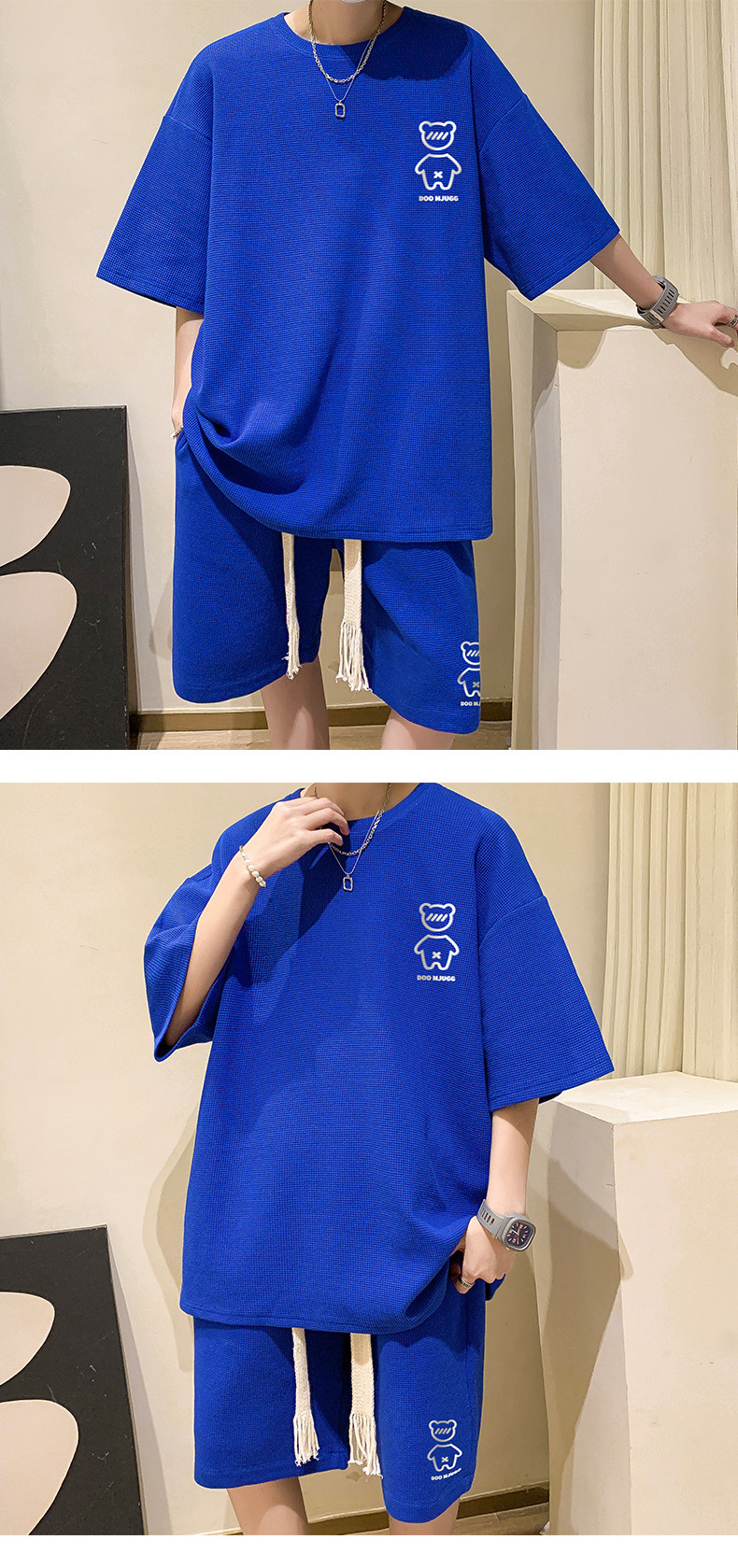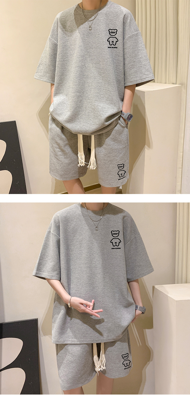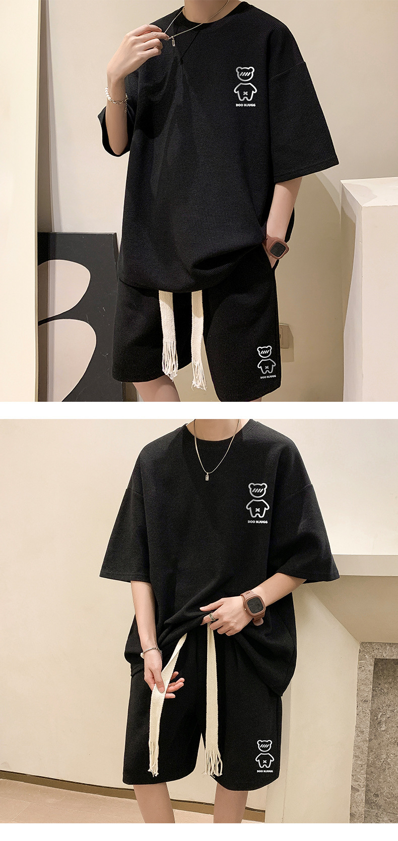套装 重磅华夫格套装小熊男T恤短裤两件套大码港风