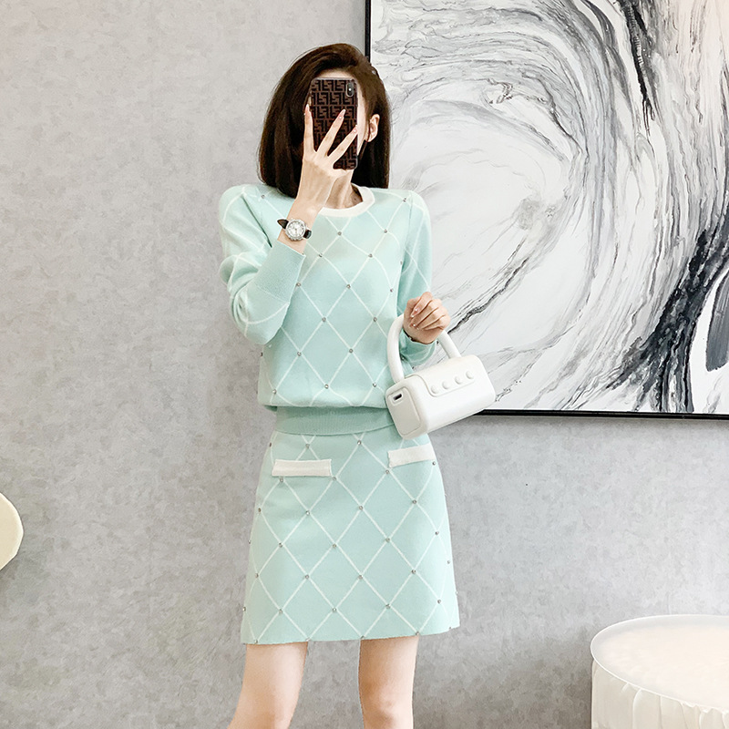 2024 가을 신상 배색 니트 투피스 스커트 여성 긴팔 스웨터 프렌치 스타일 패션 캐주얼 세트스토어 가기