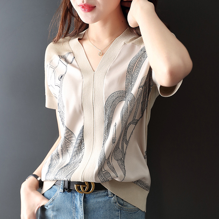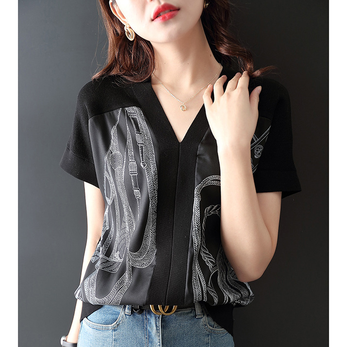 2022 봄과 여름 새로운 유럽 V-넥 프린트 스티칭 티셔츠 여성용 얇은 반팔 니트 쉬폰 셔츠 유행 틈새스토어 가기