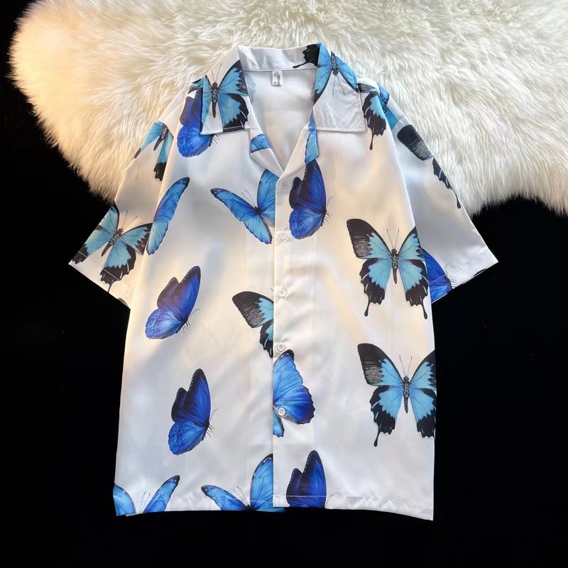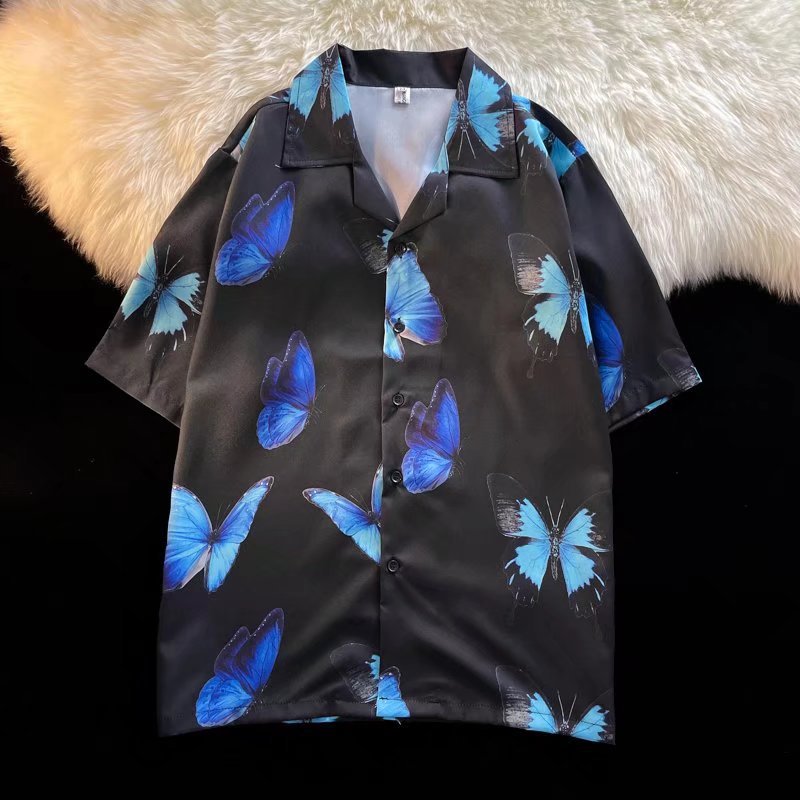 셔츠 남성용 반팔 여름 비치 하와이안 인 올매치 루즈한 일본식 한국식 버터플라이 프린트 셔츠 남성용