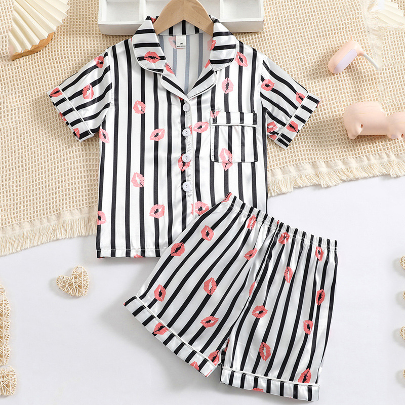 여름 새로운 어린이 잠옷 세트 소녀 실크 반팔 가정 옷 사데 소녀 사랑 에어컨 옷 여름