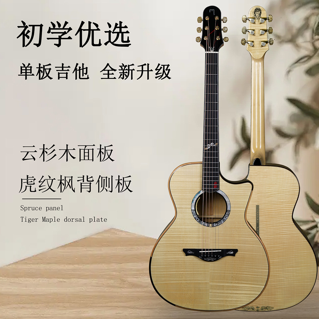 用途/优点:单板吉他 全新升级,桃花芯琴颈,非洲桃花芯,天然多层板的内部结构,使琴颈赋予更大的稳定性,在碳纤维的帮助下,优化了C型琴颈使其更纤薄却更坚固,天然好木,苛刻选材,精选云杉+虎纹枫单板面板,云杉木质纹理清晰,音色富有层次感与虎纹枫的特别搭配能够获得音色透明明亮,漆面设计,新一代聚酯高亮漆面,对琴体保护更加充分,让每一次弹奏,都能享受来自亲肤般的触感,乌木指板,乌木指板比玫瑰木指板强度更高更耐磨,手感更好,有效增加手感的同时,使琴颈也更加坚固,使用寿命也更长。
