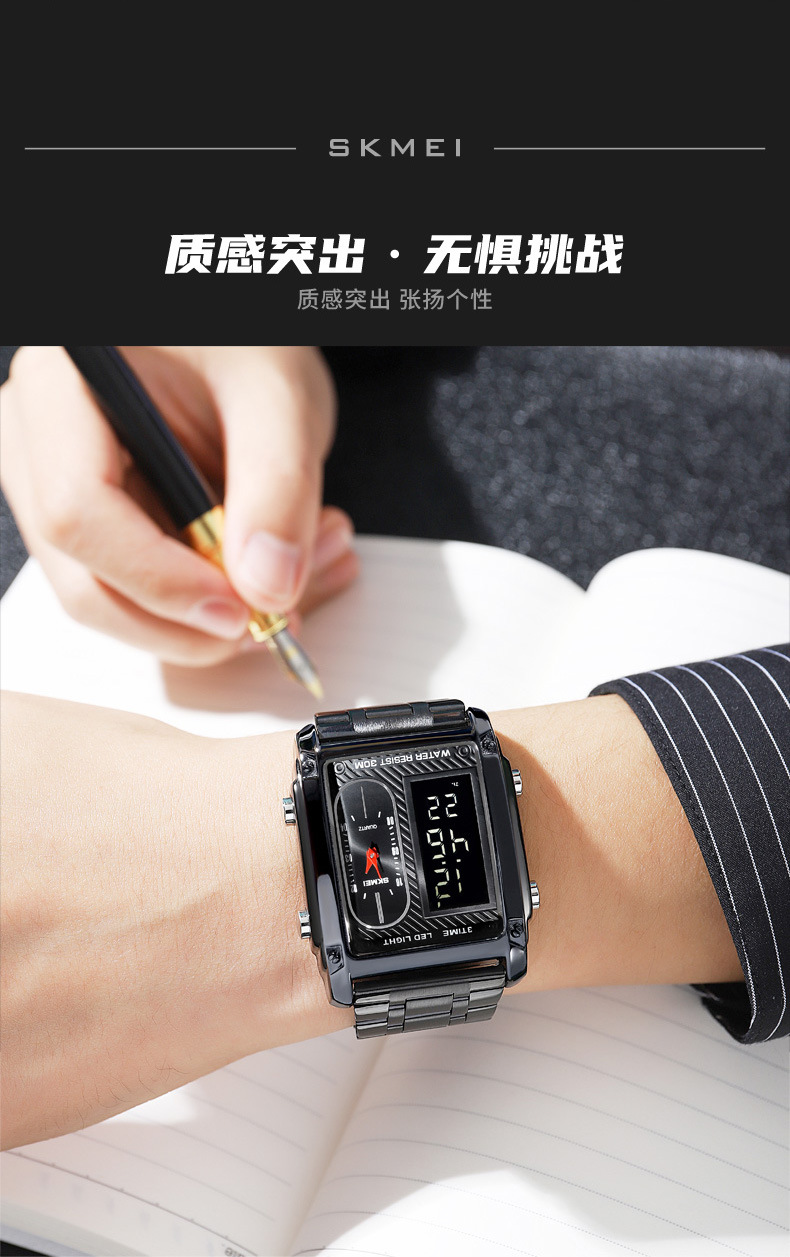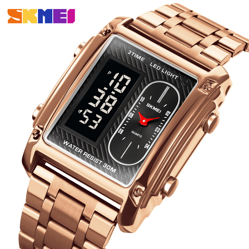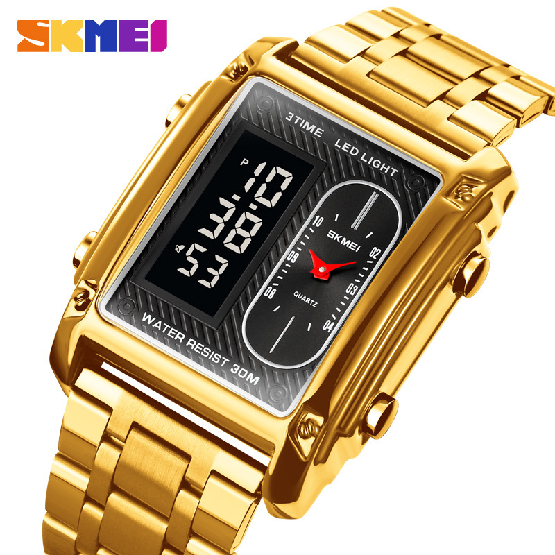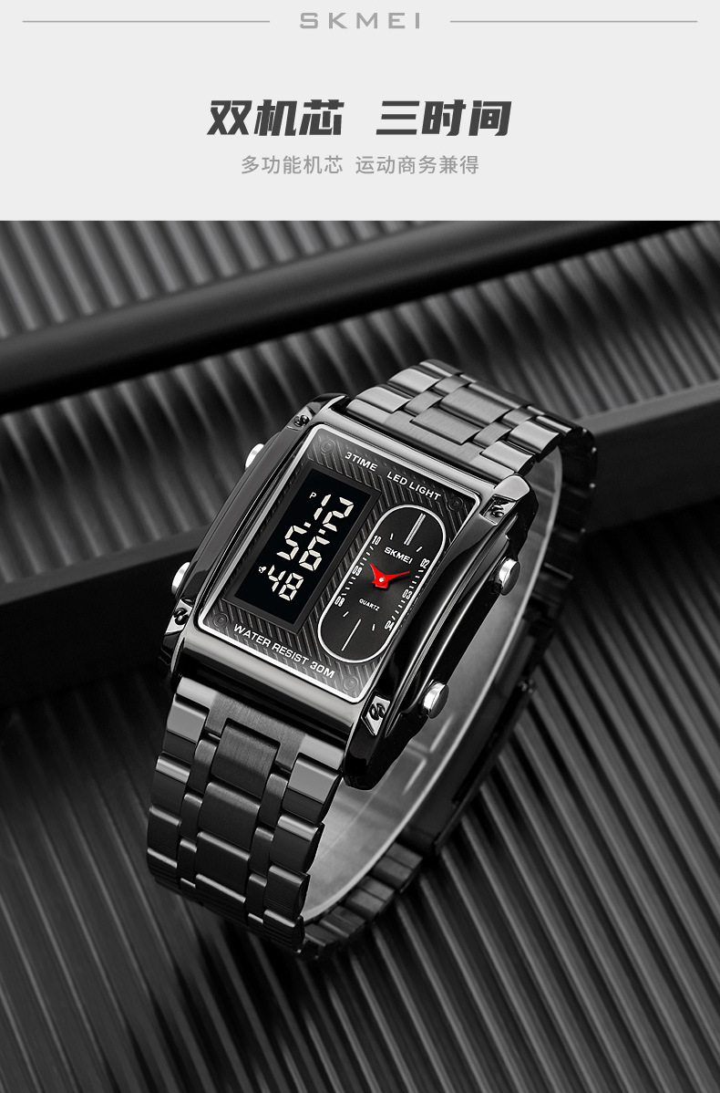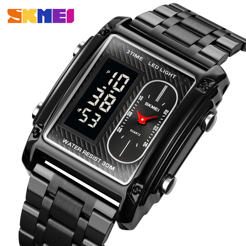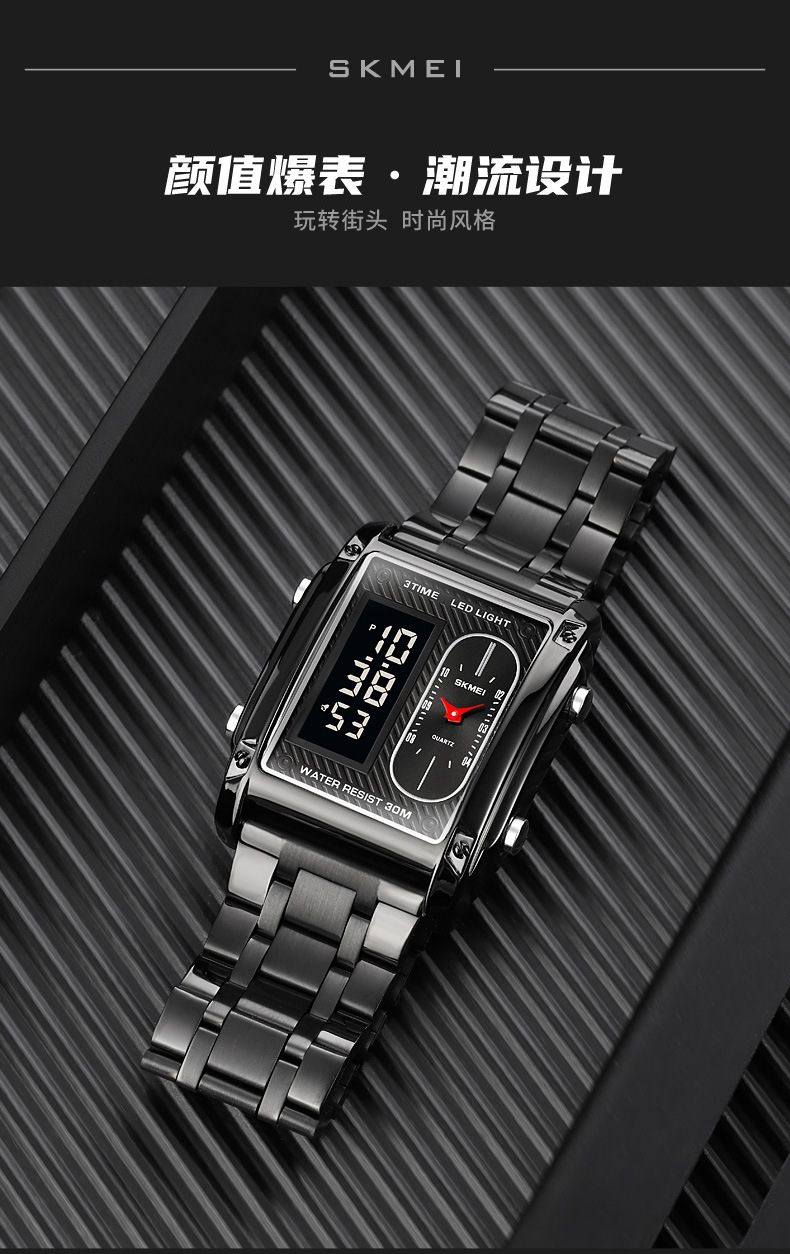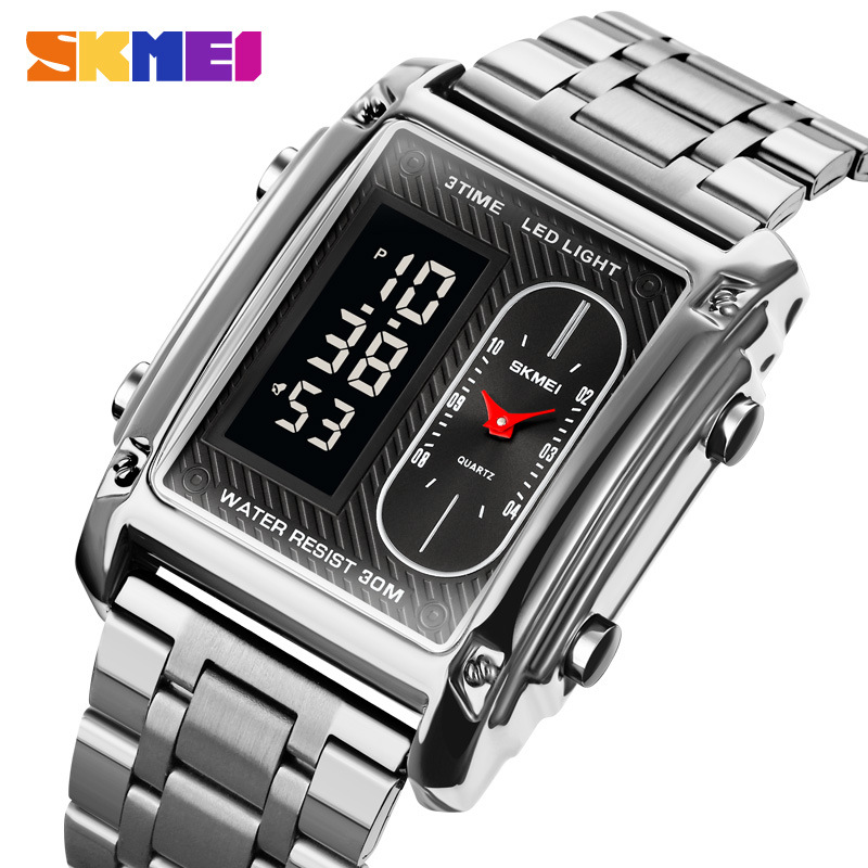 국경 간 뜨거운 판매 시간표 미국 시계 사각 듀얼 디스플레이 다기능 전자 시계 패션 남성용 벨트 스틸 밴드 손목 시계