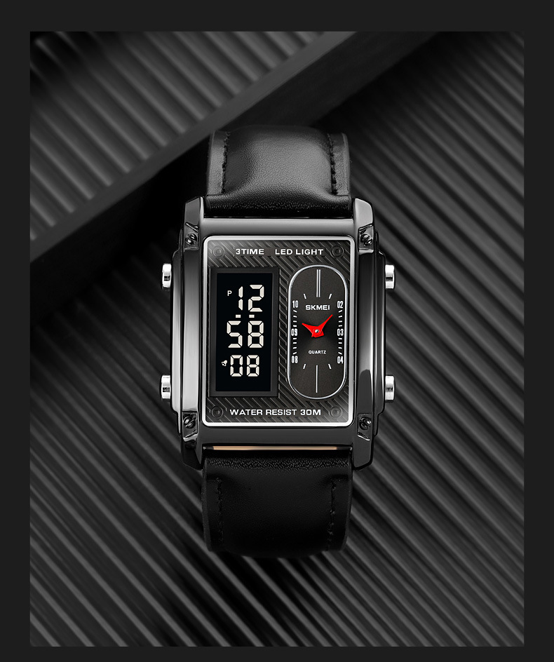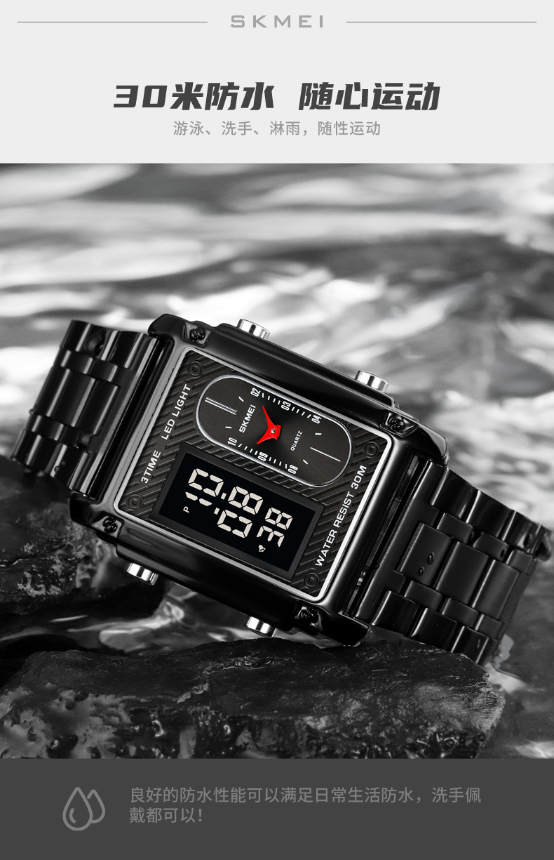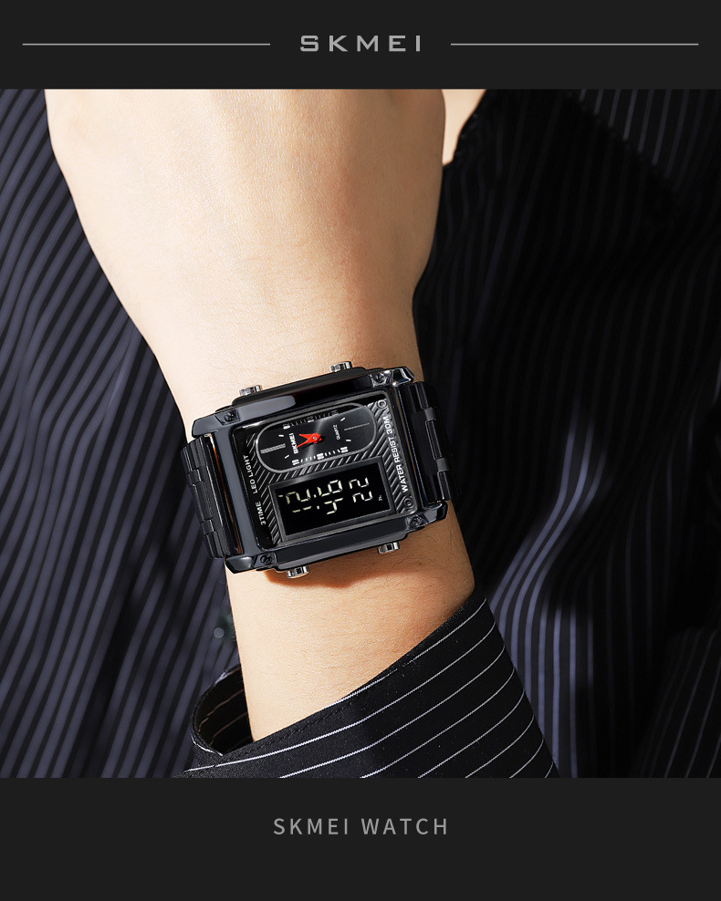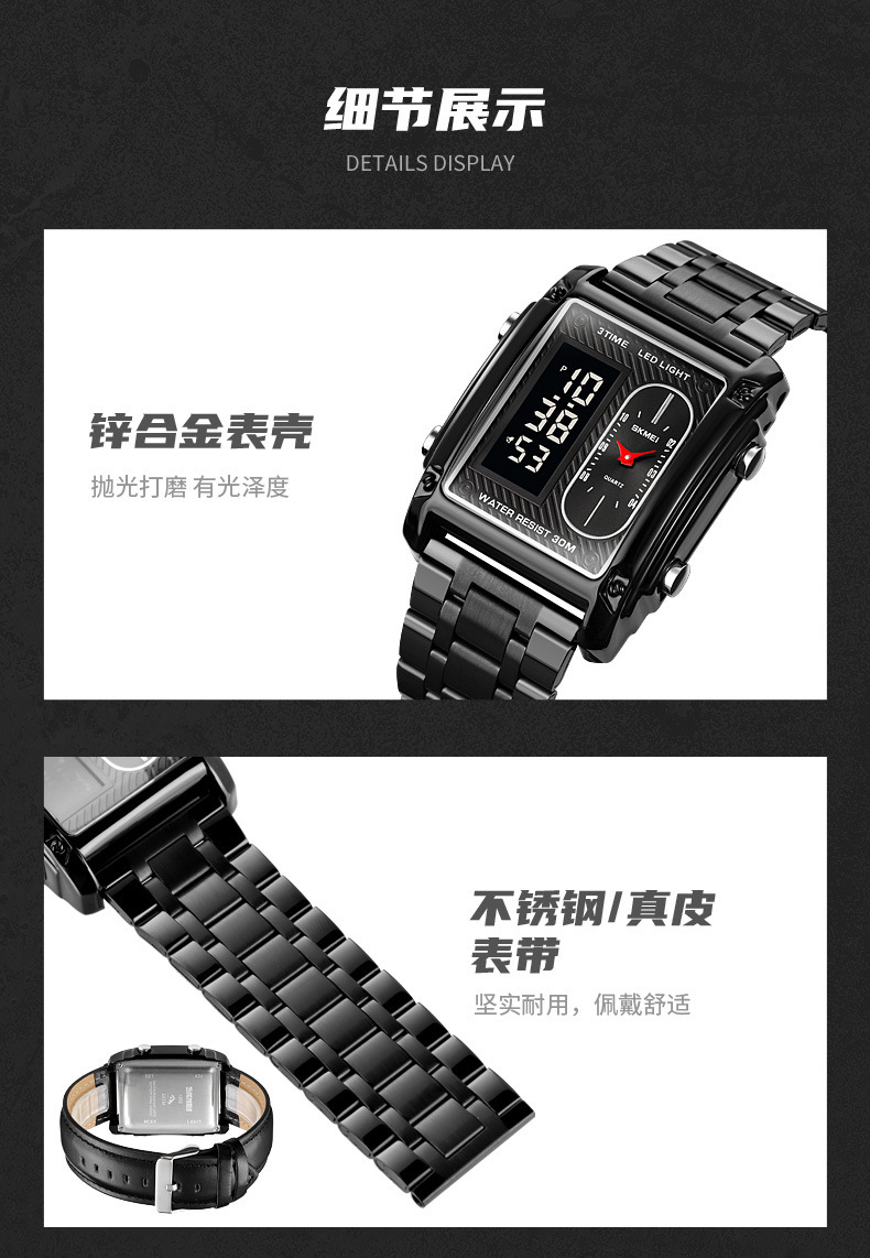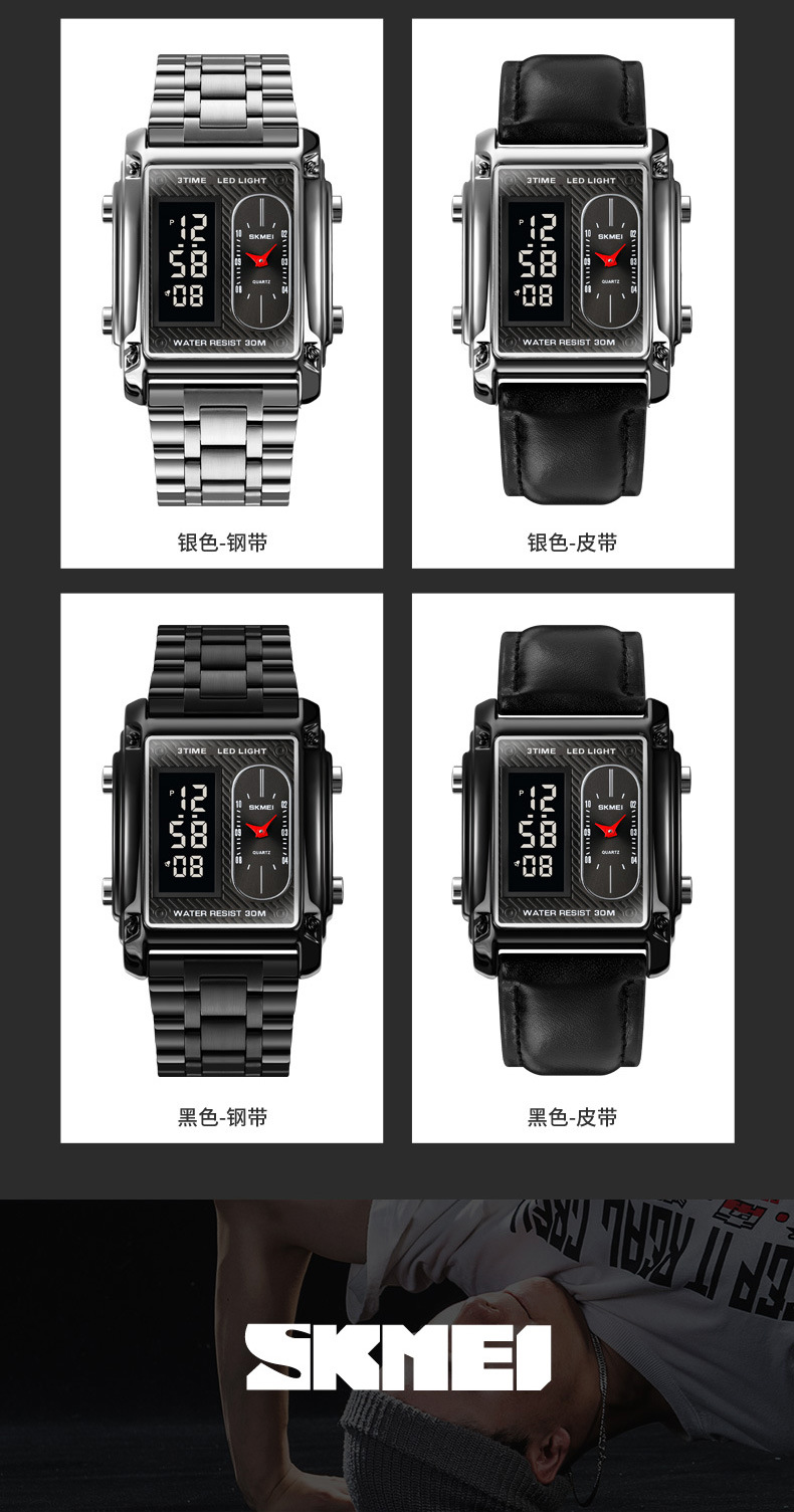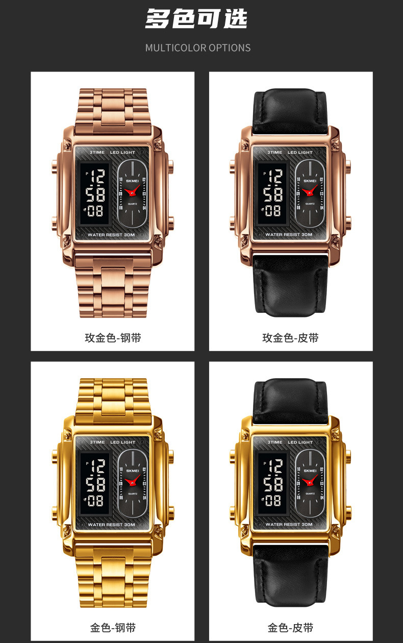 국경 간 뜨거운 판매 시간표 미국 시계 사각 듀얼 디스플레이 다기능 전자 시계 패션 남성용 벨트 스틸 밴드 손목 시계