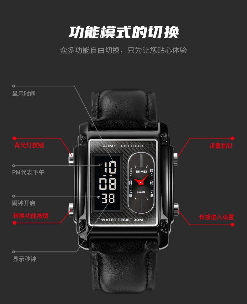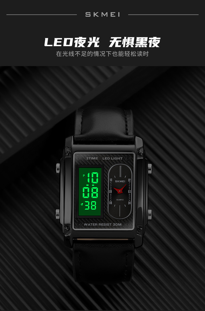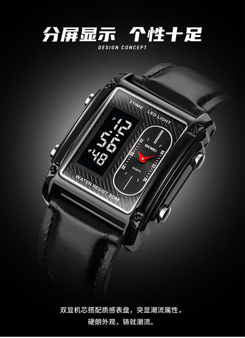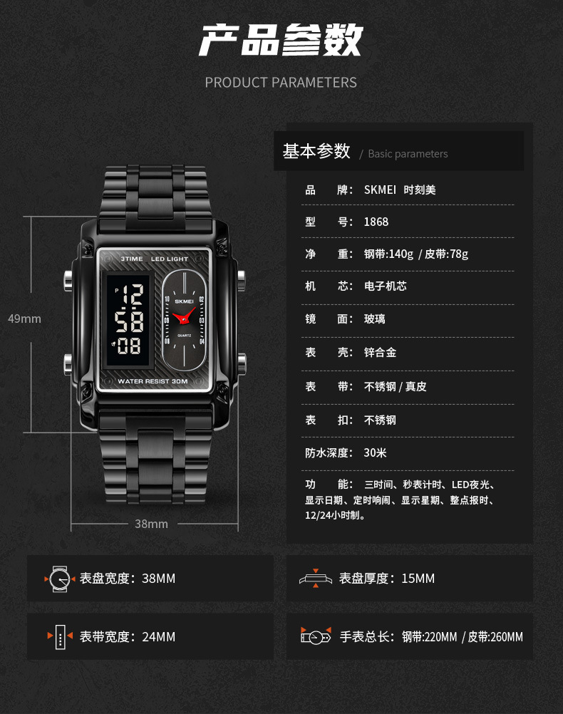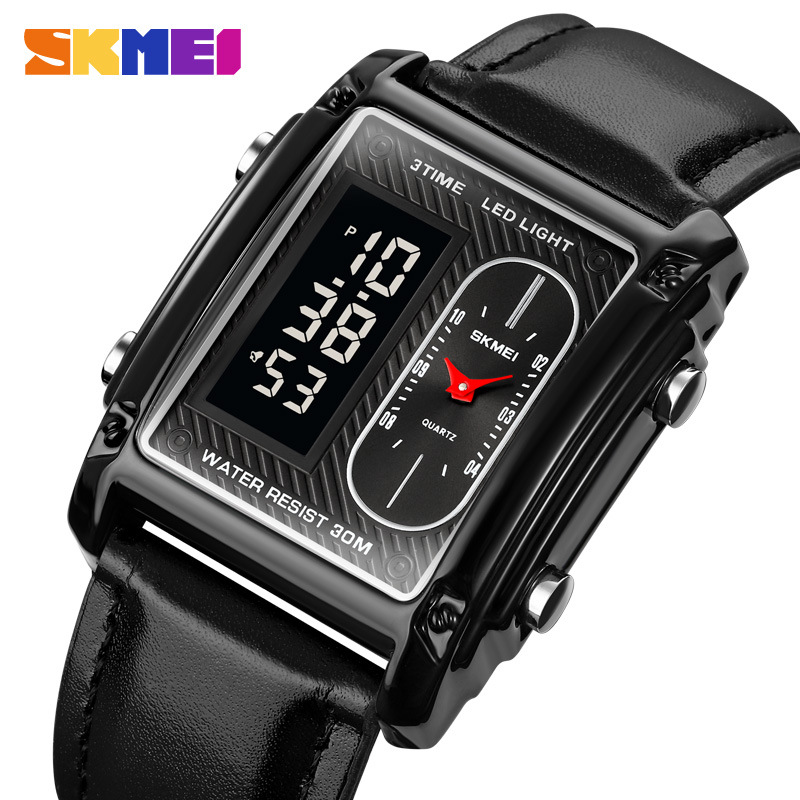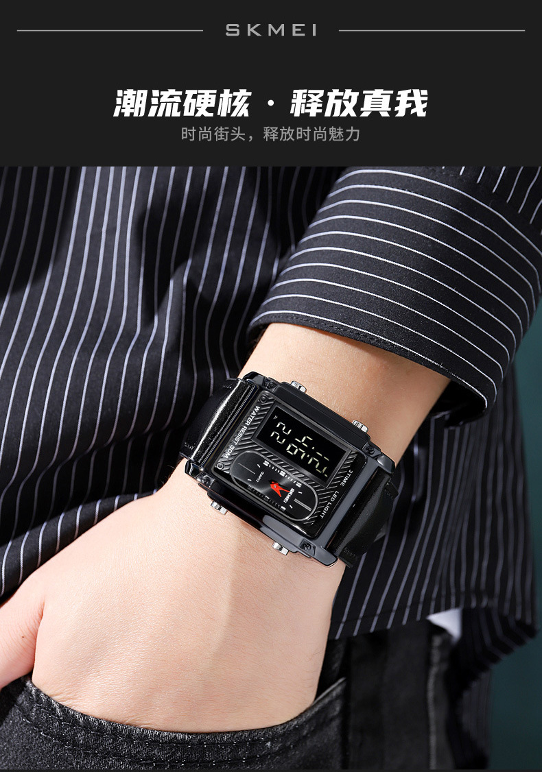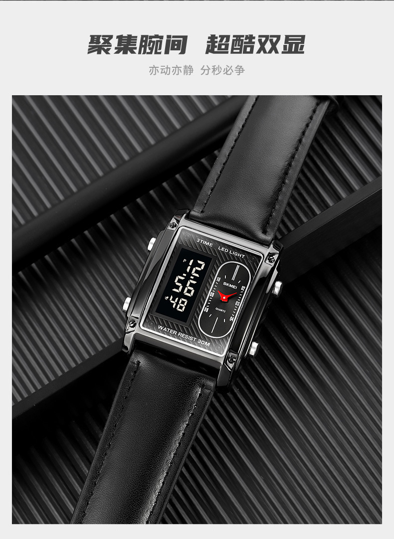 국경 간 뜨거운 판매 시간표 미국 시계 사각 듀얼 디스플레이 다기능 전자 시계 패션 남성용 벨트 스틸 밴드 손목 시계