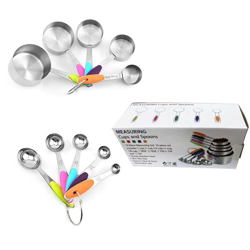 스테인리스 실리콘 손잡이 계량컵 계량스푼 10 개 세트 크로스보더 베이킹툴 계량컵 계량스푼 10 개 세트