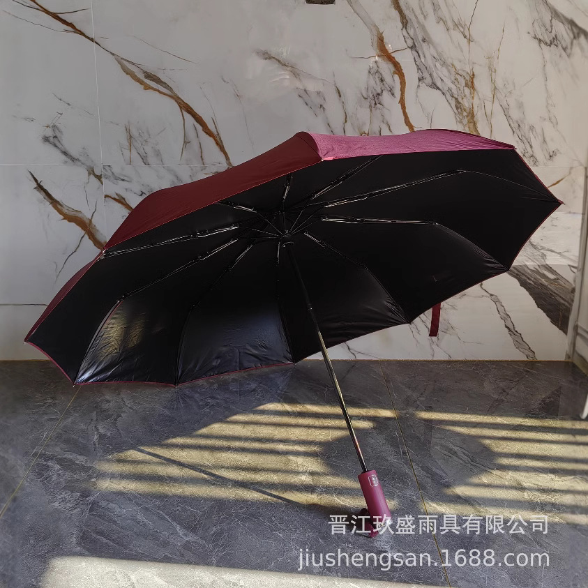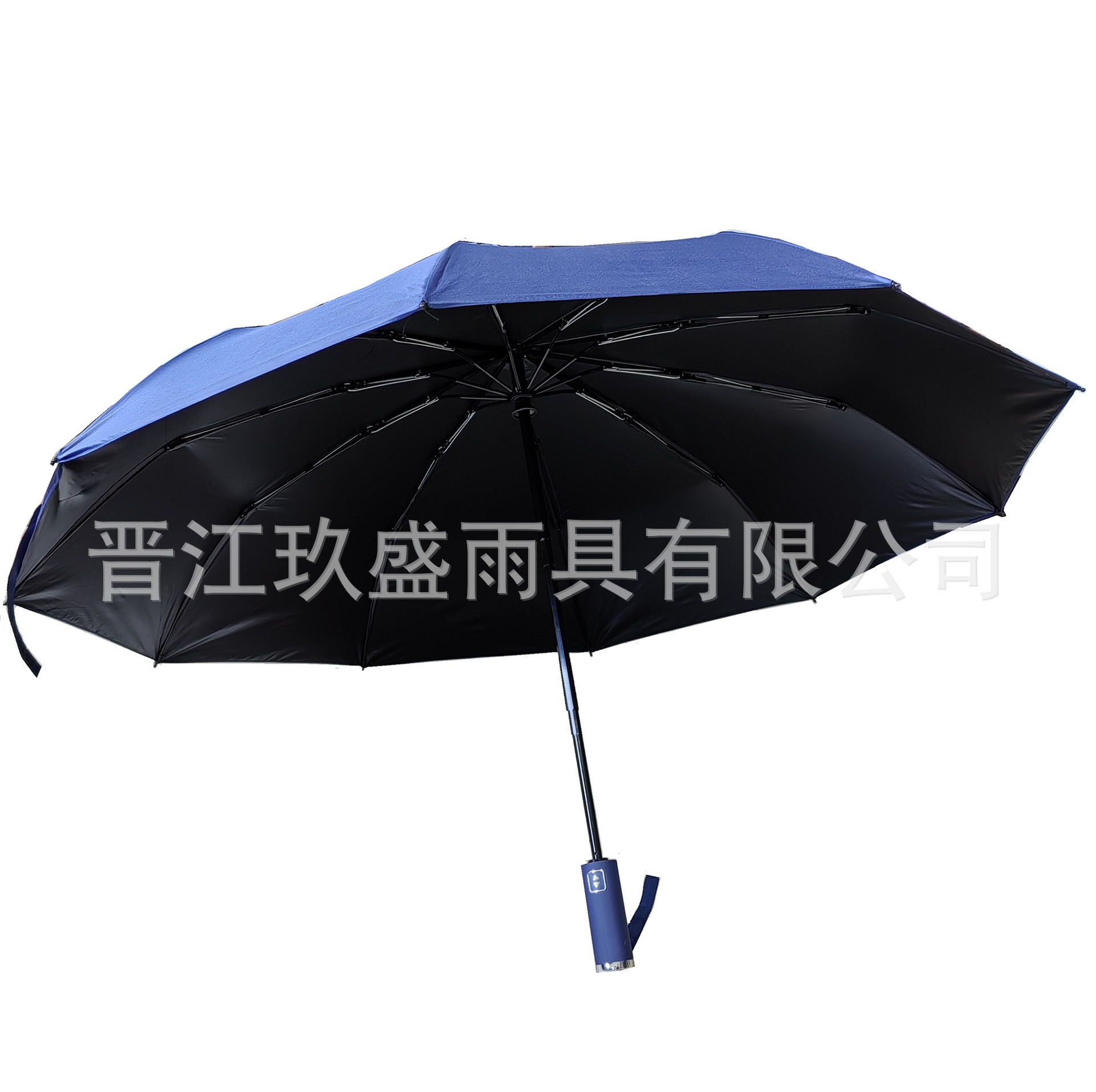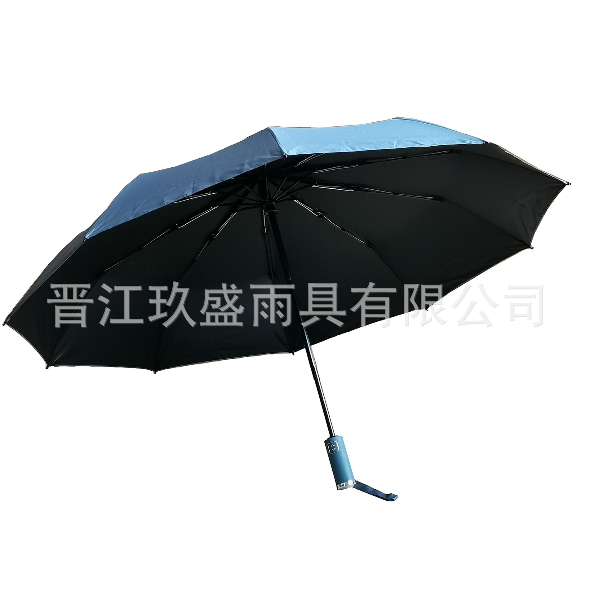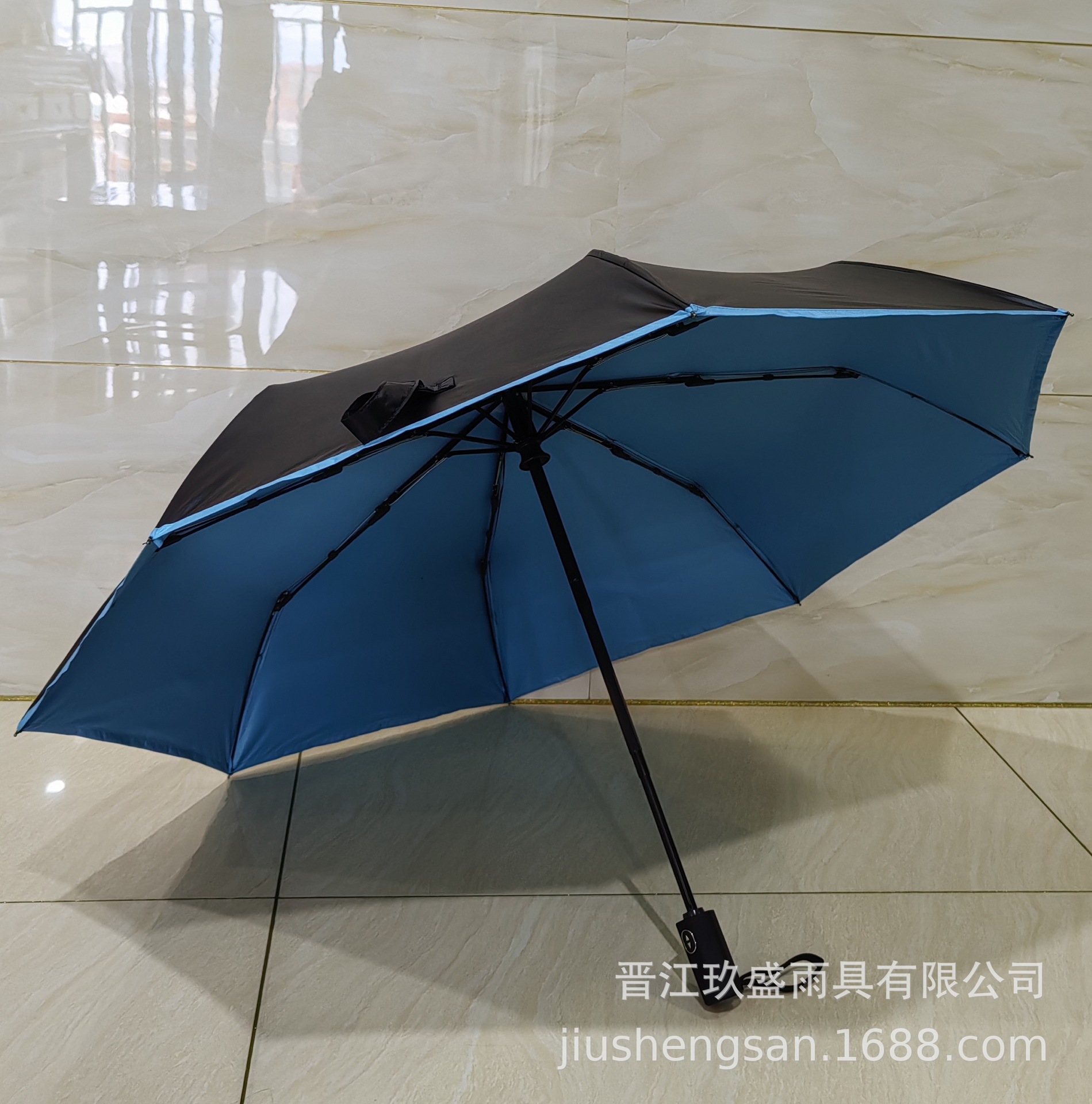 23寸10骨 3折自动开收安全式节节收雨伞 黑色金属中杆 纤维防风伞架 210T黑胶PU防水防UV布料 塑料手把 本布套