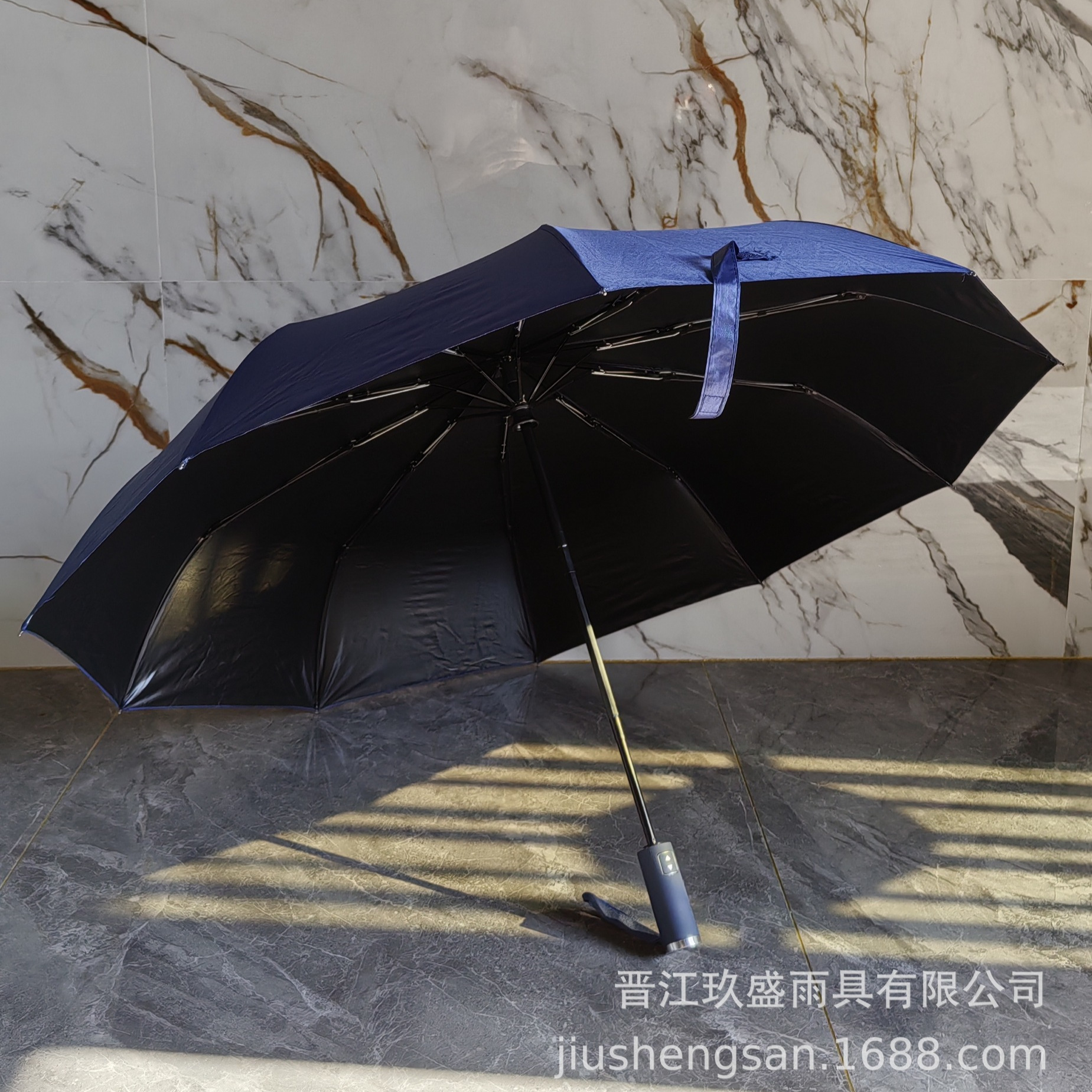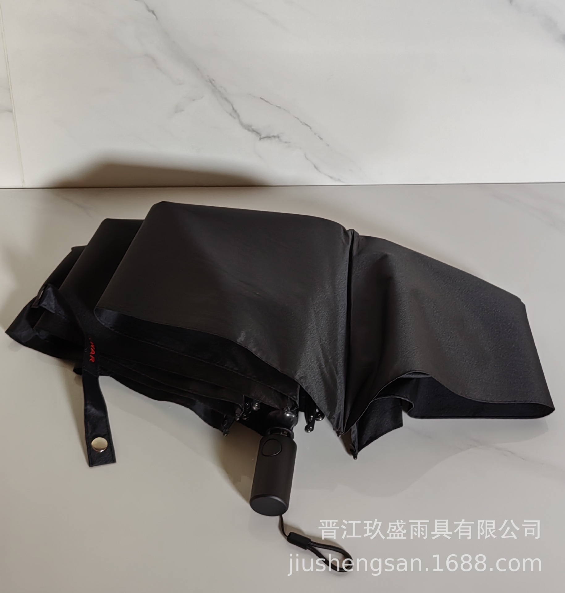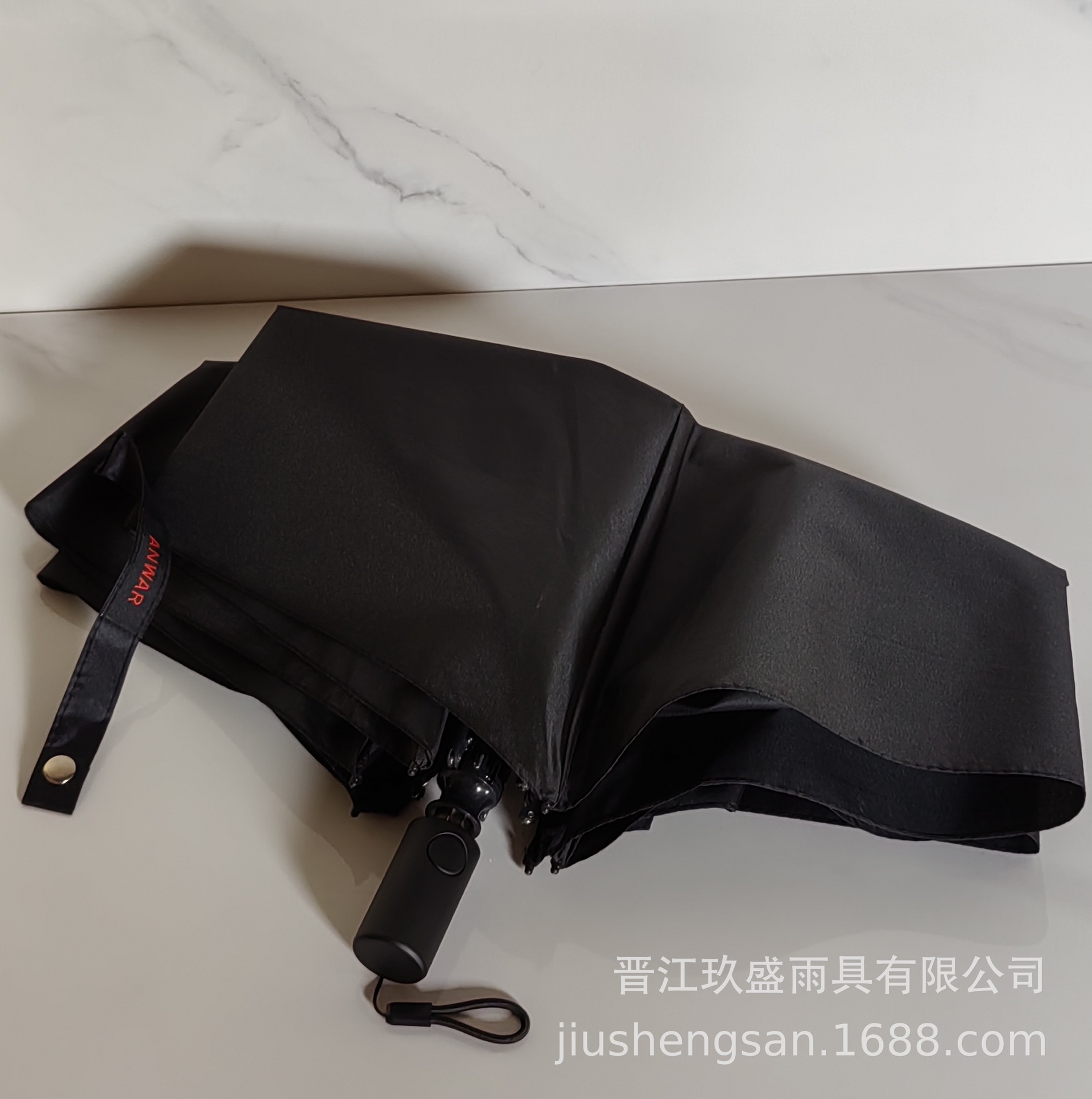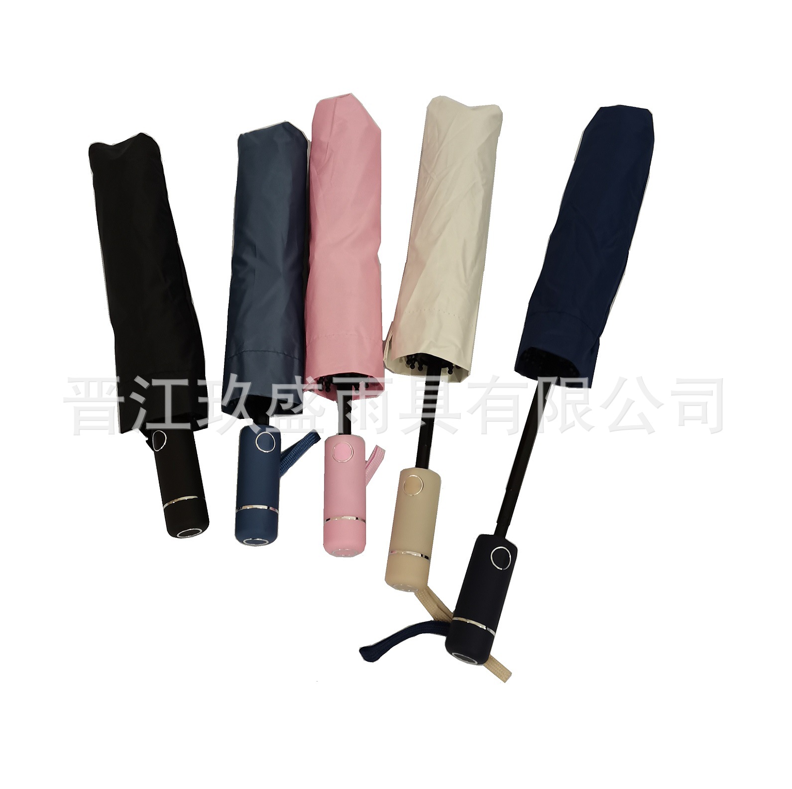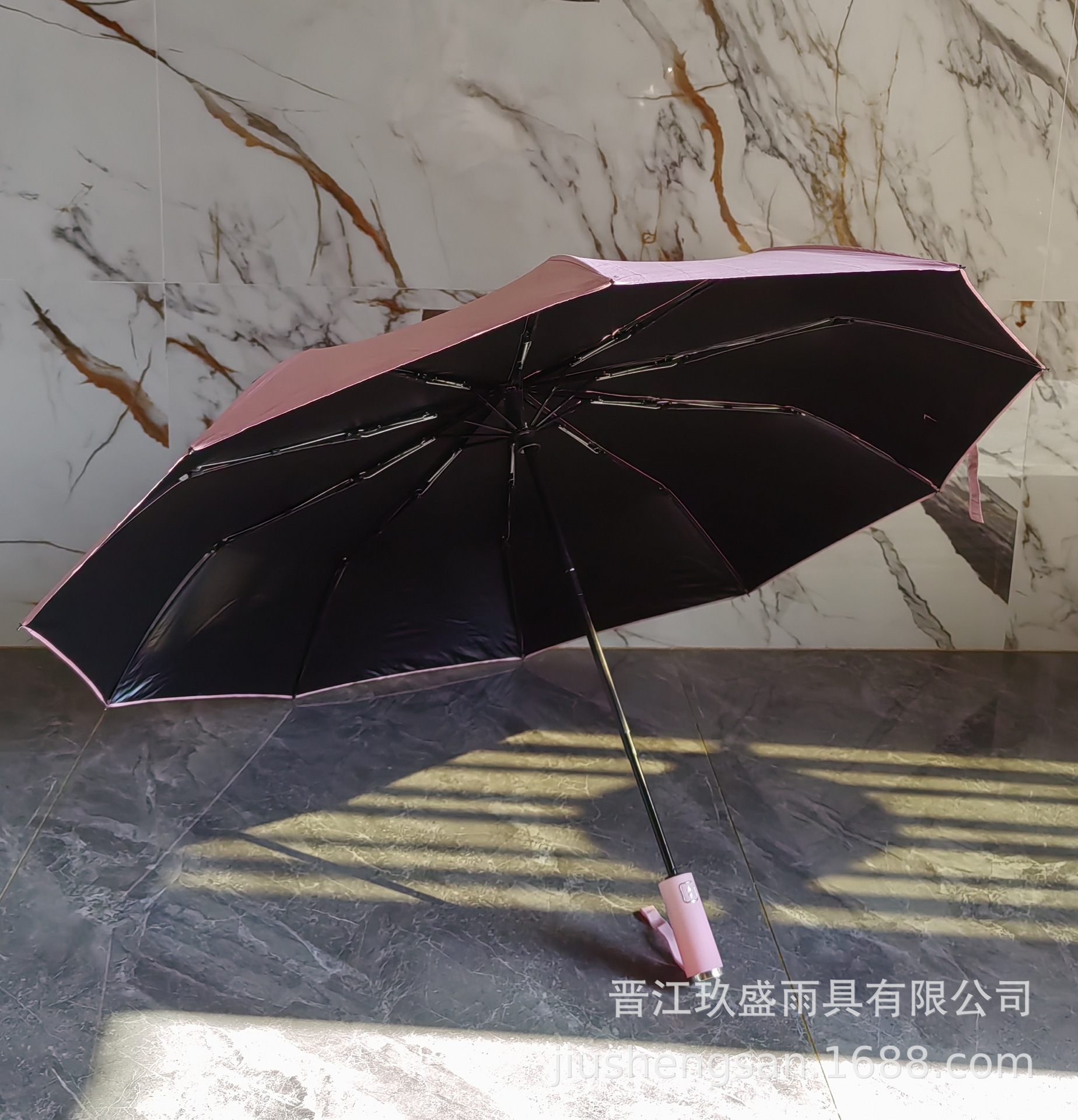 23寸10骨 3折自动开收安全式节节收雨伞 黑色金属中杆 纤维防风伞架 210T黑胶PU防水防UV布料 塑料手把 本布套