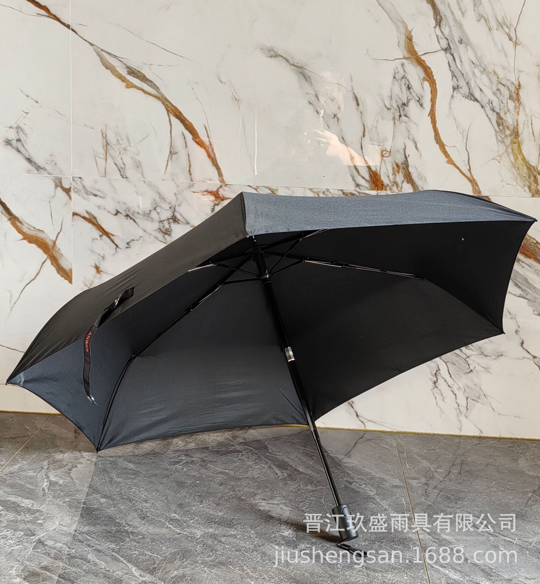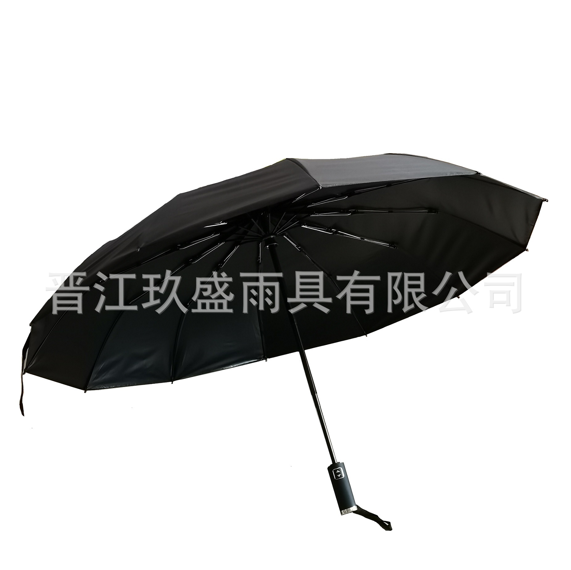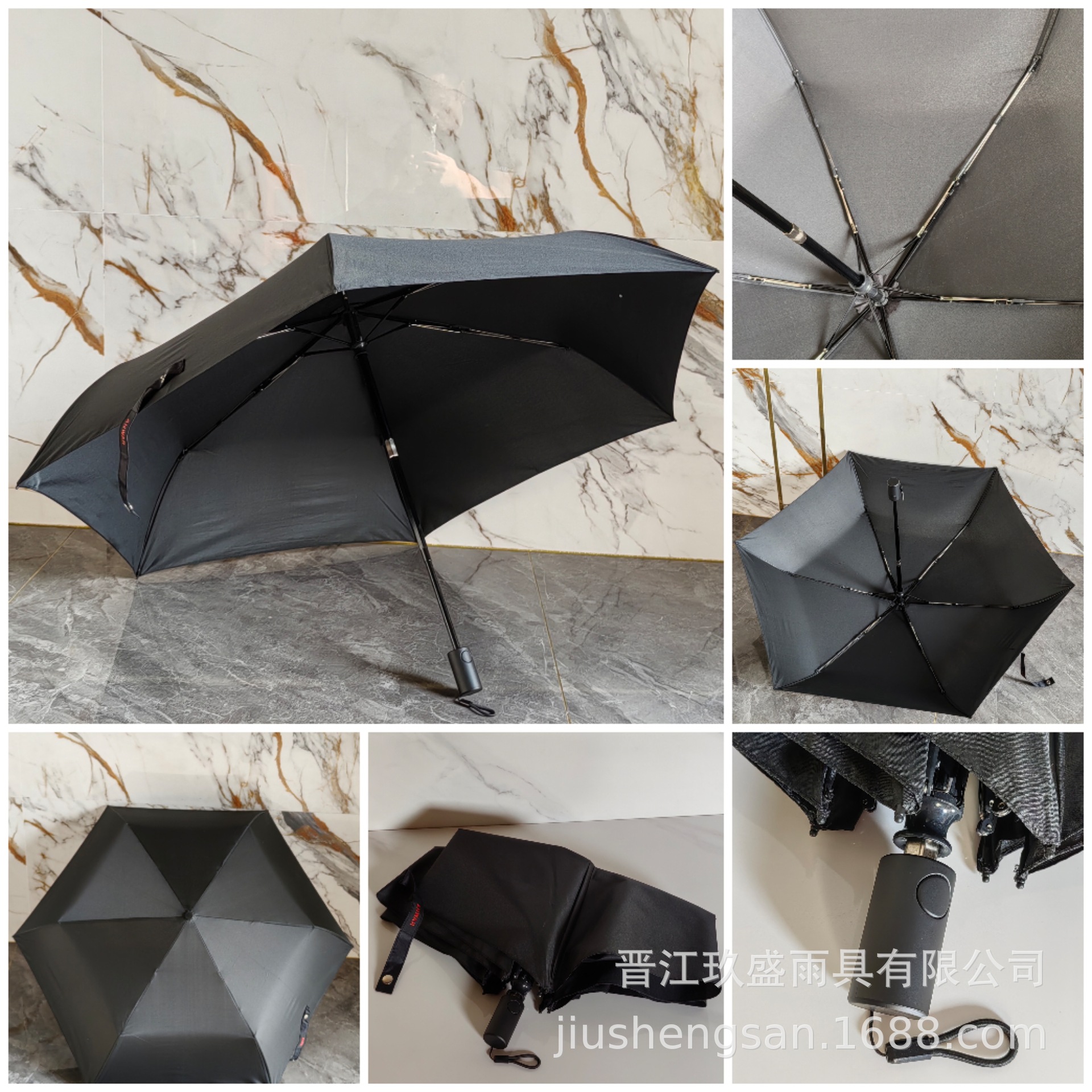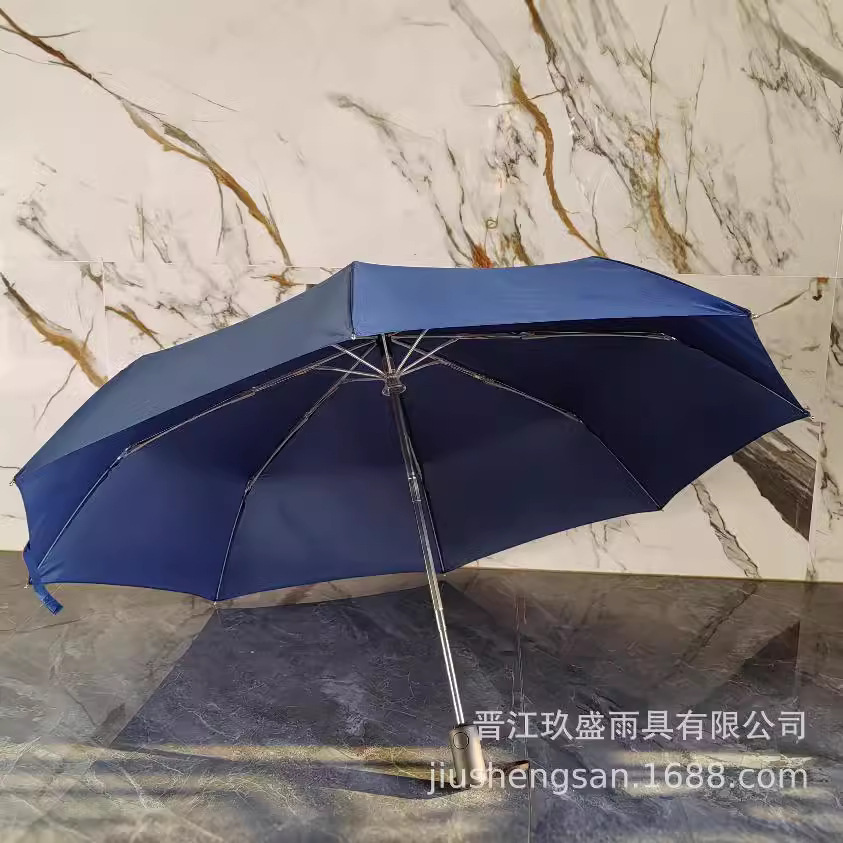 23寸10骨 3折自动开收安全式节节收雨伞 黑色金属中杆 纤维防风伞架 210T黑胶PU防水防UV布料 塑料手把 本布套