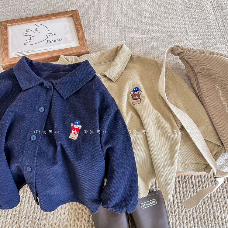 어린이 코듀로이 셔츠 2023 가을 남녀 한국식 곰 자수 캐주얼 셔츠 어린이 라펠 탑스토어 가기