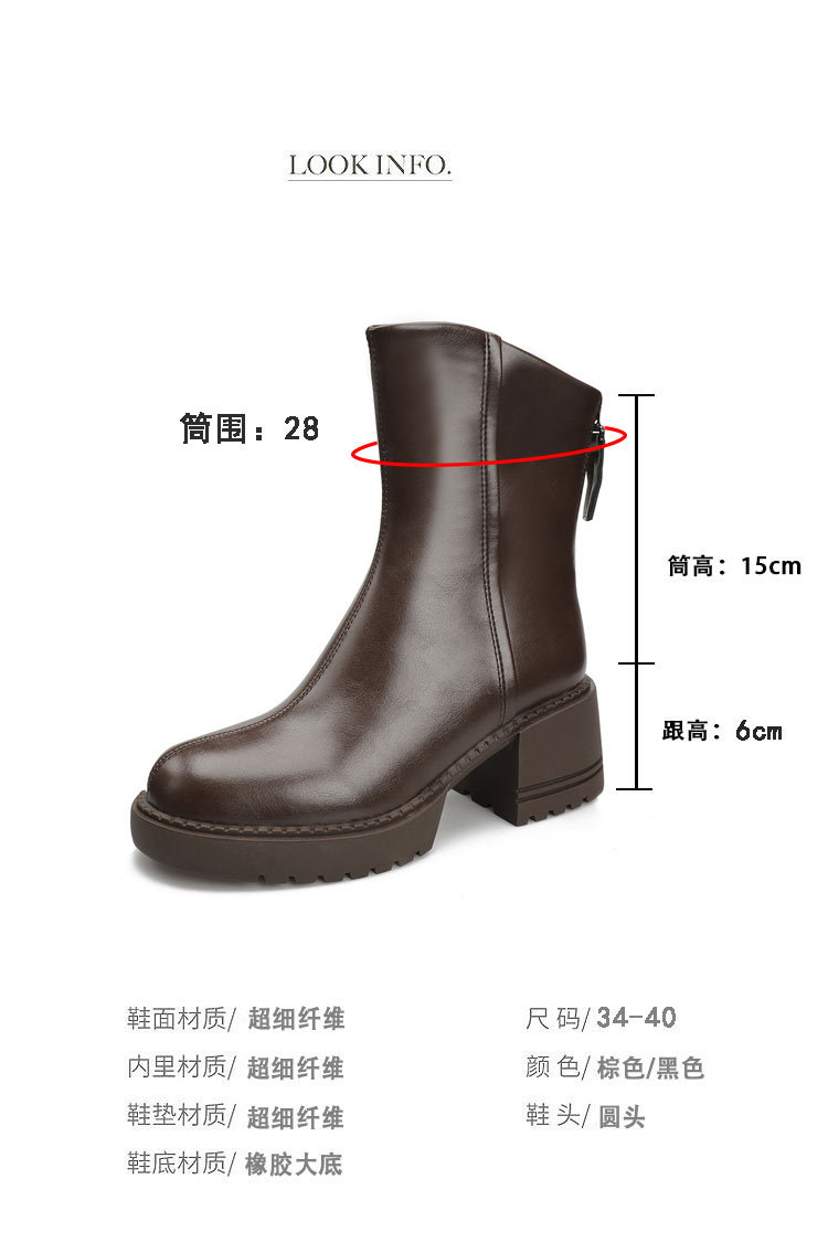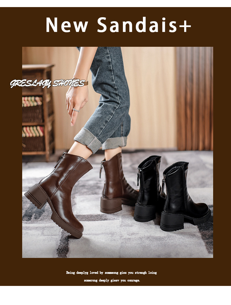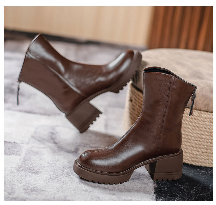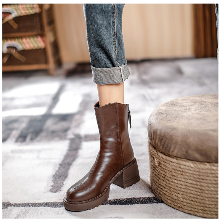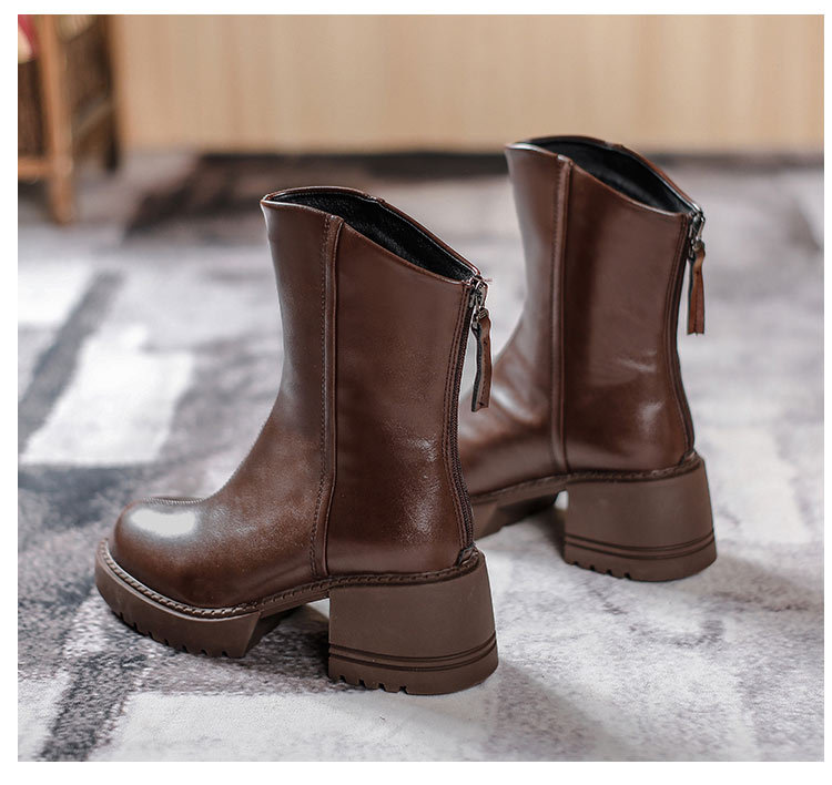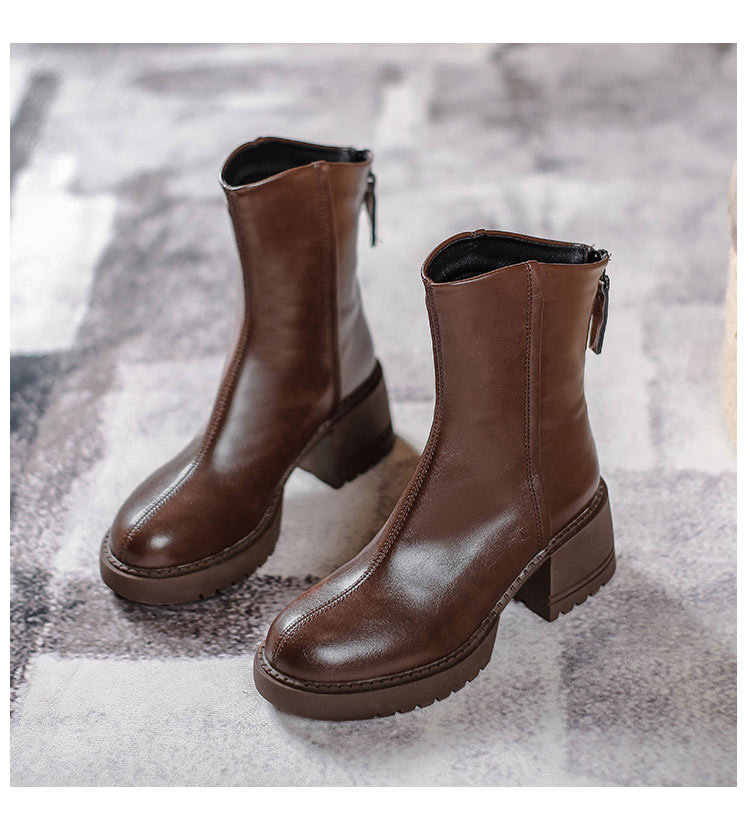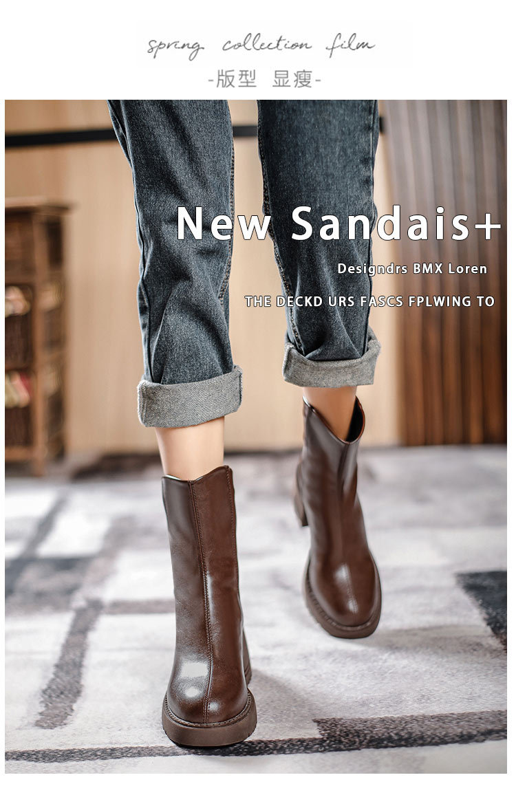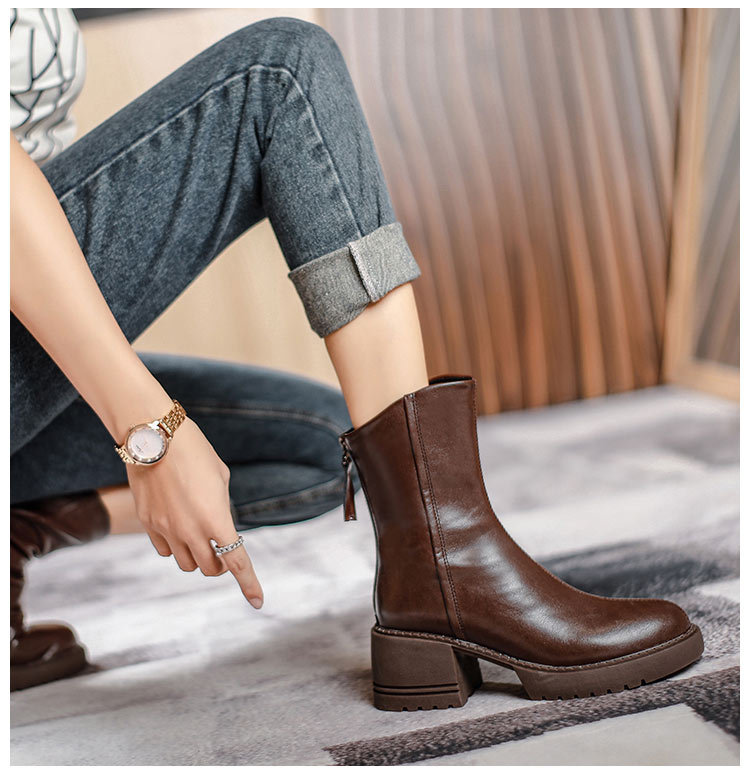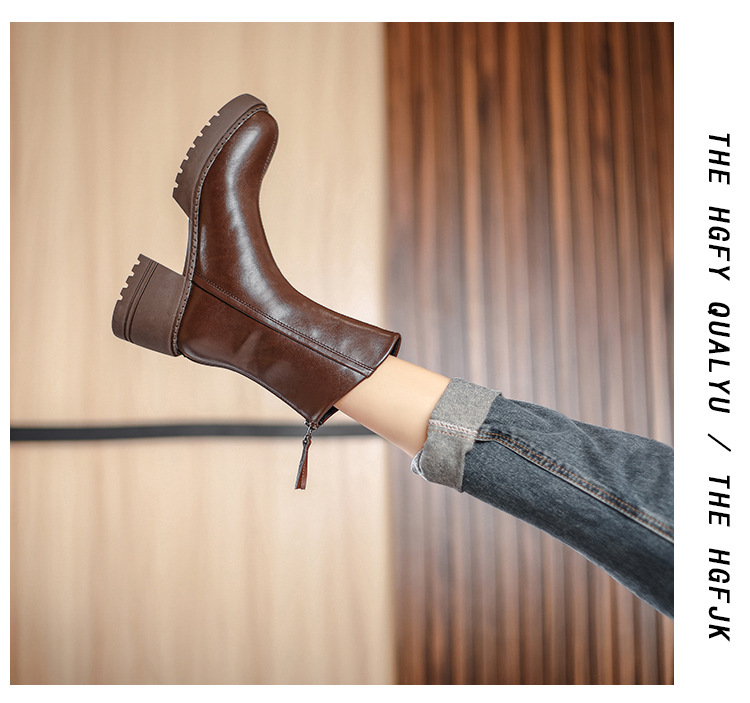 여성용 숏부츠, 두꺼운 굽, 두꺼운 밑창, 브리티시 스타일, 2024 신상 마틴 부츠, 하이힐, 중간 길이, 브라운, 레트로, 봄, 가을 싱글 부츠스토어 가기