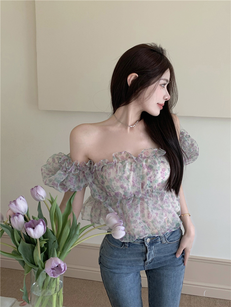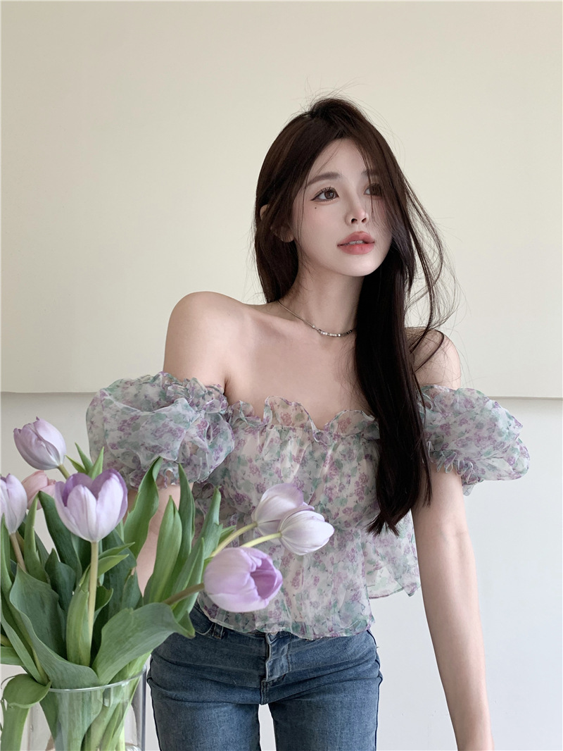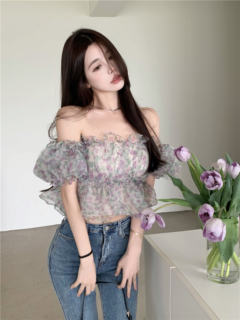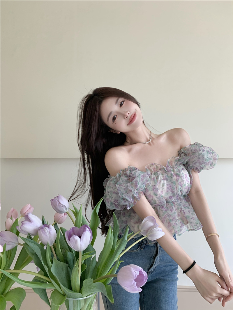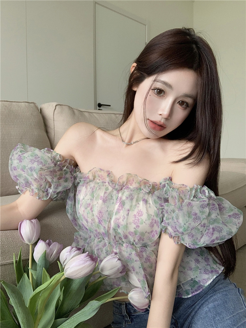 스위트 플로럴 반팔 셔츠 여성용 여름 스파이스 걸 오프 숄더 버블 슬리브 디자인 틈새 쇼트 탑 여성 의류스토어 가기