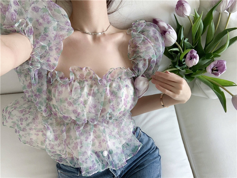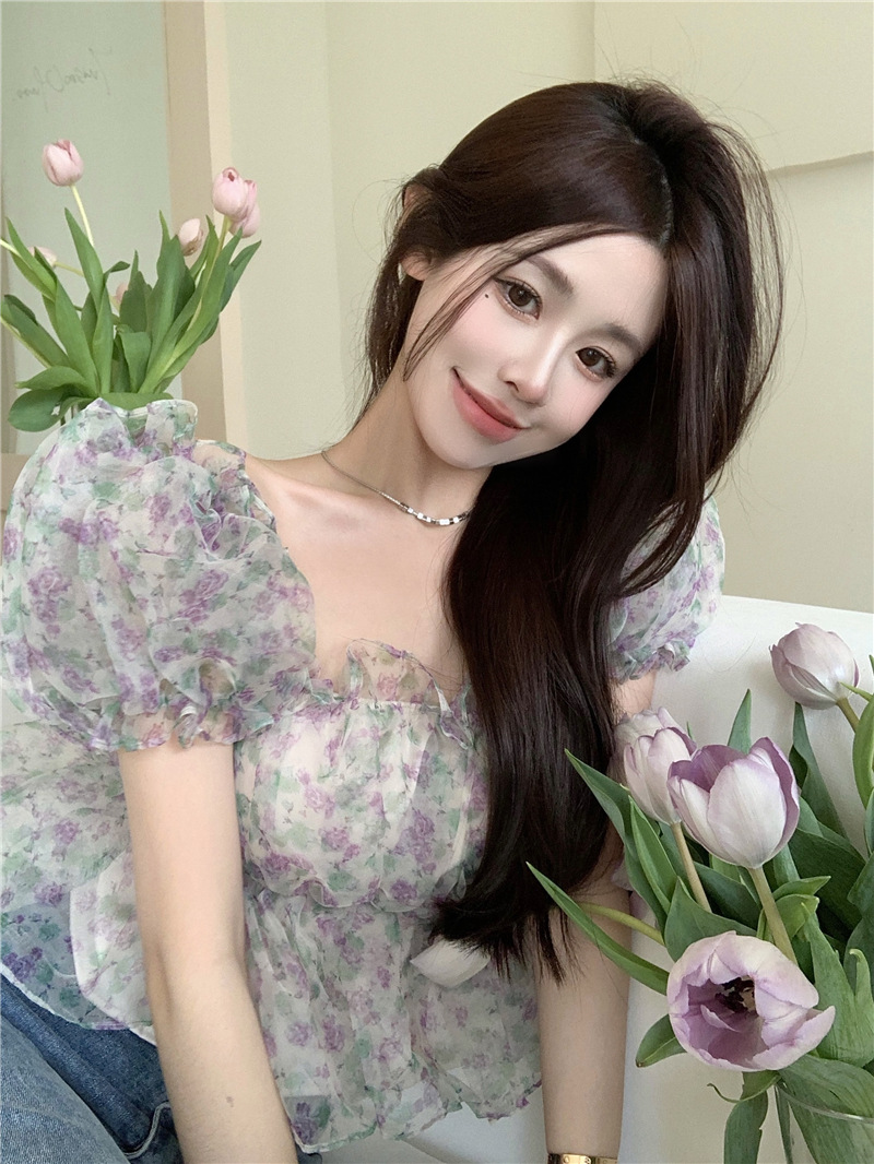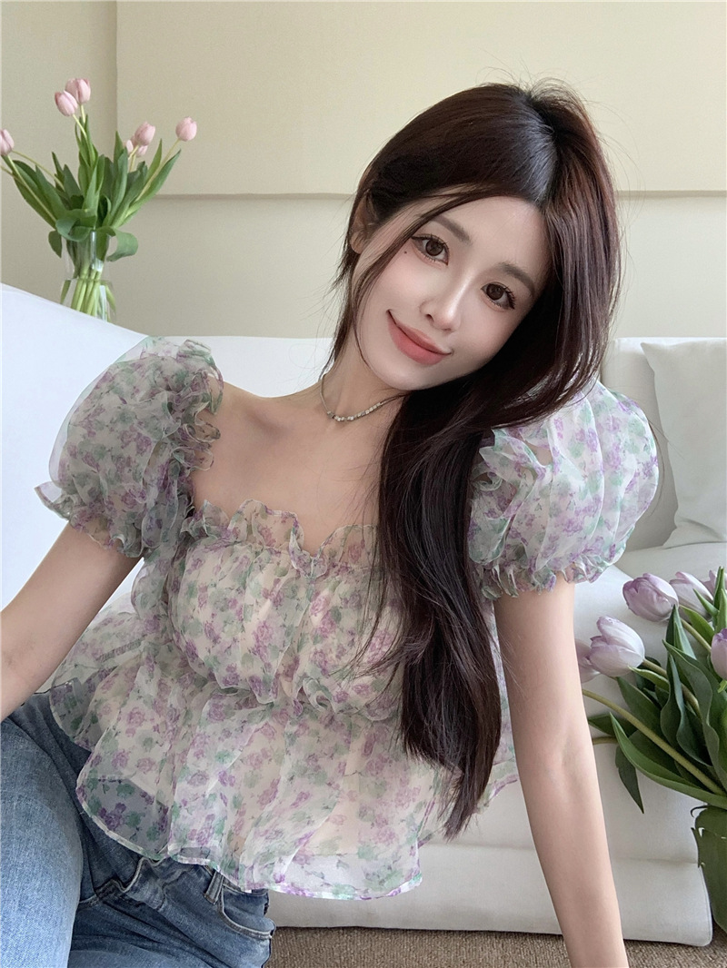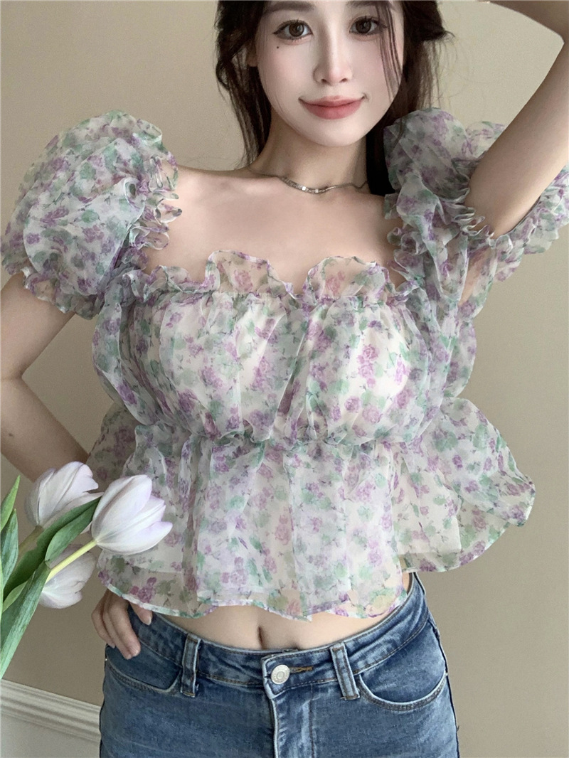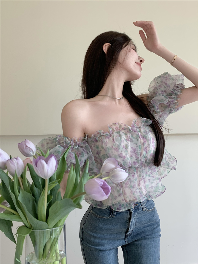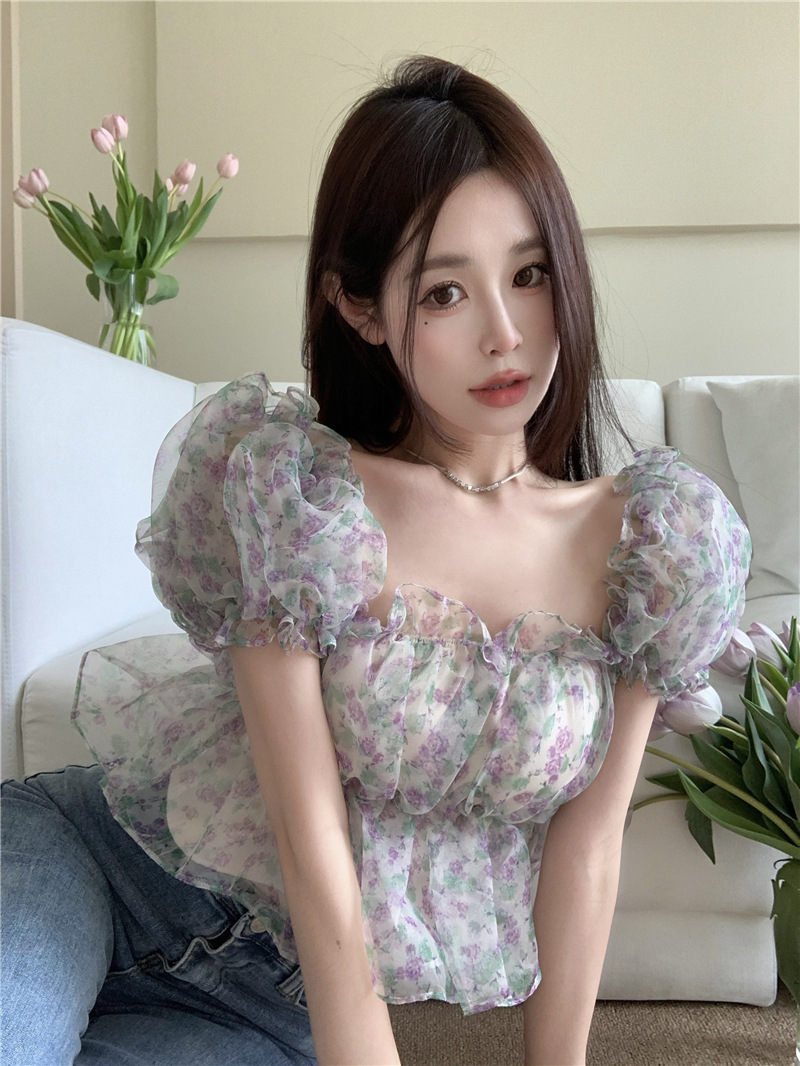 스위트 플로럴 반팔 셔츠 여성용 여름 스파이스 걸 오프 숄더 버블 슬리브 디자인 틈새 쇼트 탑 여성 의류스토어 가기