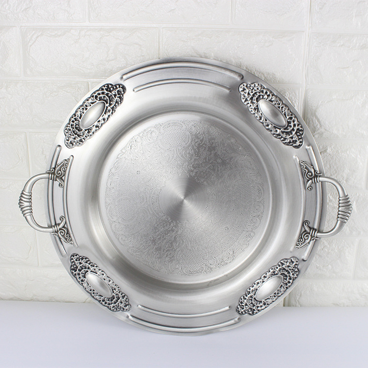 핸들이 있는 호텔용 크로스보더 복고풍 스테인레스 스틸 원형 트레이, 레스토랑 식기, 찻잔 보관 트레이