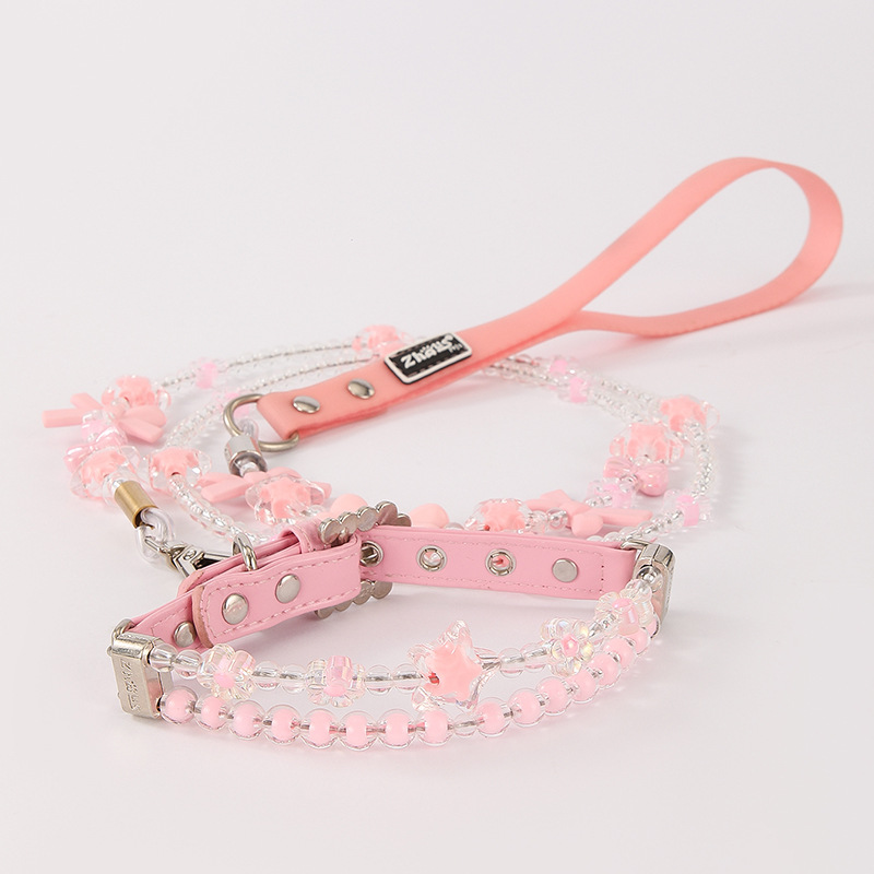 ZHOUS 새로운 애완 동물 강철 와이어 로프 착용 구슬 고리 견인 로프 세트 작은 고양이 개 특별 견인 벨트