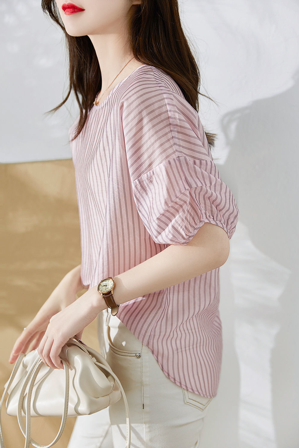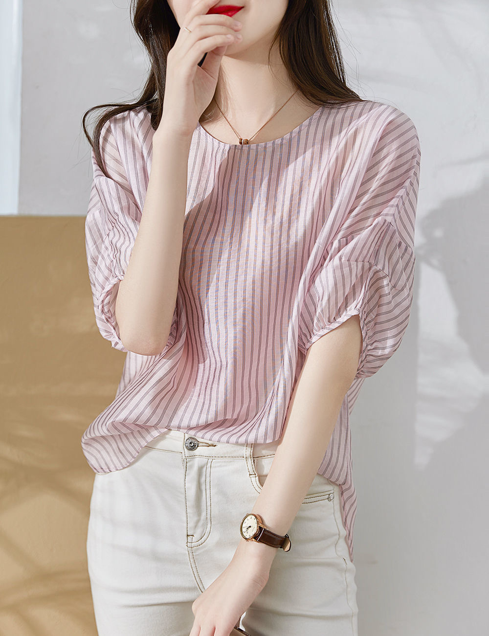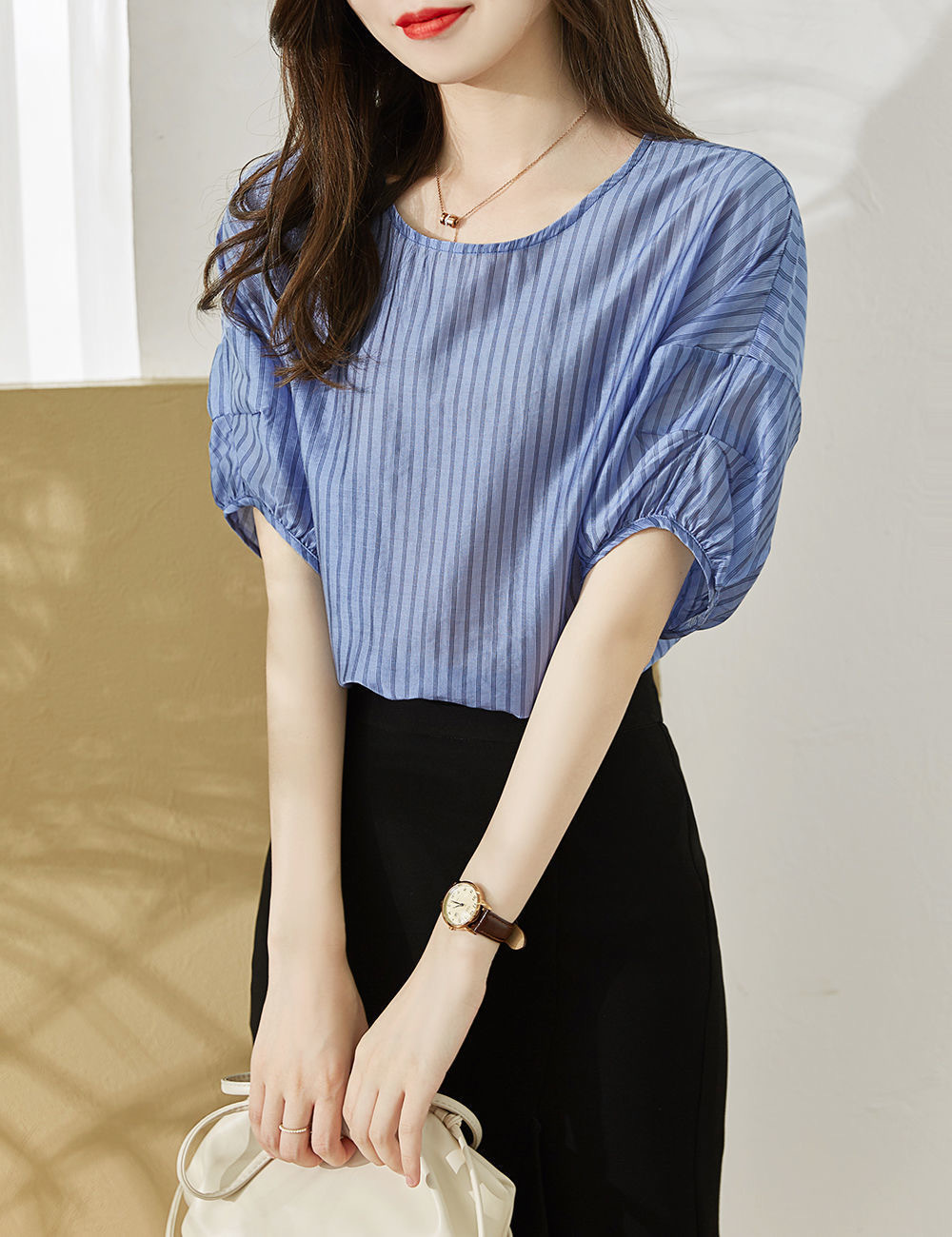디자인감 있는 반팔 스트라이프 셔츠 여성용 2026 여름 캐주얼 루즈핏 드레이프 탑 슬리밍 여성복스토어 가기