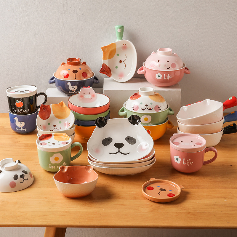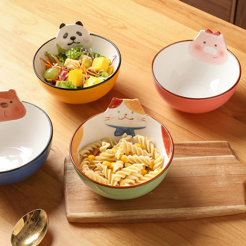작은 농가 도자기 라면 그릇, 귀여운 뚜껑이 있는 만화 일본식 손잡이 그릇, 유약 밑 색상 식기, 밥그릇, 샐러드 그릇