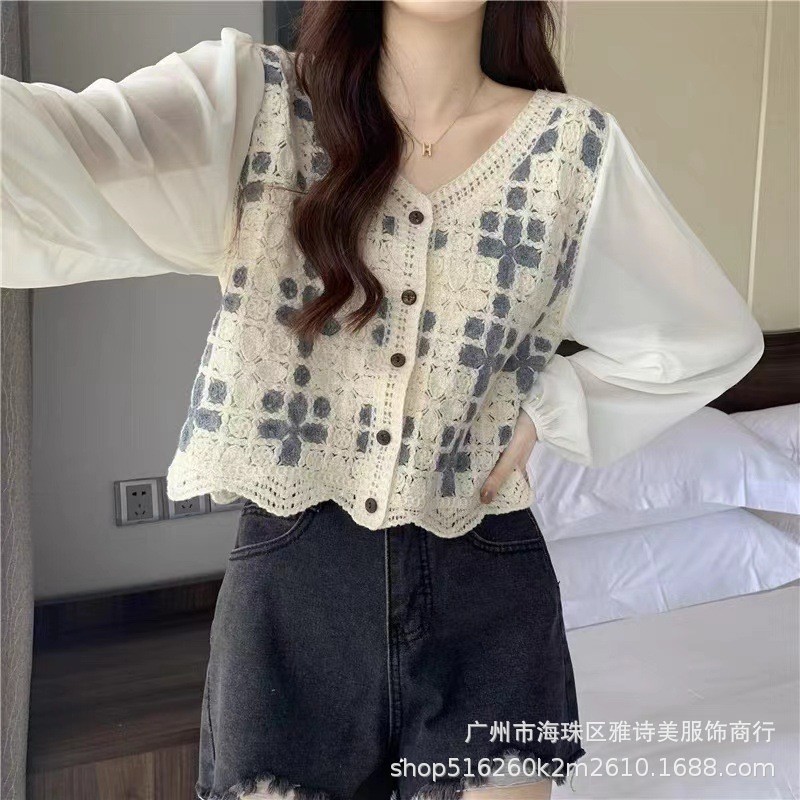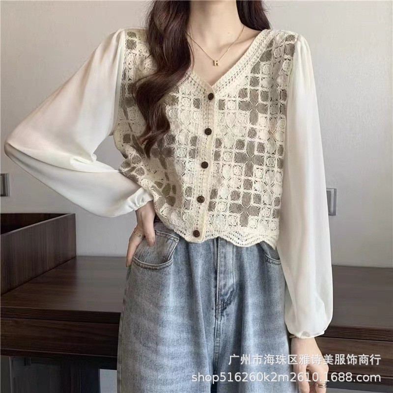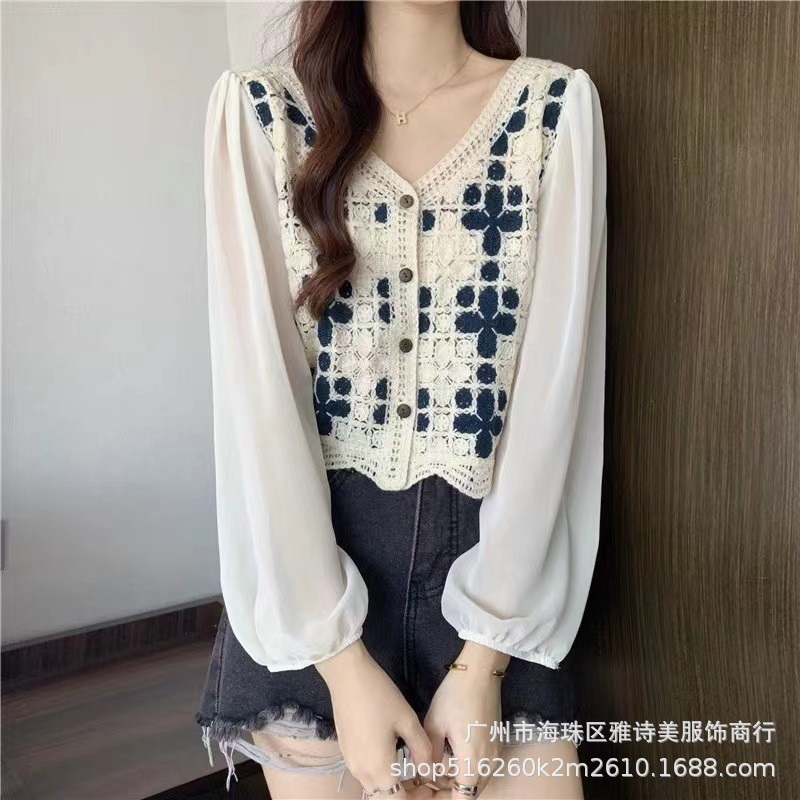 프랑스 자수 스티치 쉬폰 셔츠 여성의 가을 디자인 틈새 느슨한 달콤한 짧은 긴 소매 시크 트렌디 탑