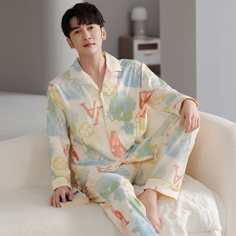새로운 하이 퀄리티 커플 잠옷 봄과 가을 와플 순면 가정복 여름 가디건 긴팔 남성과 여성의 세트스토어 가기