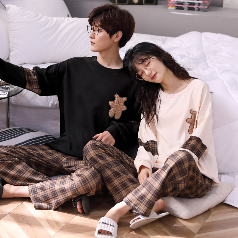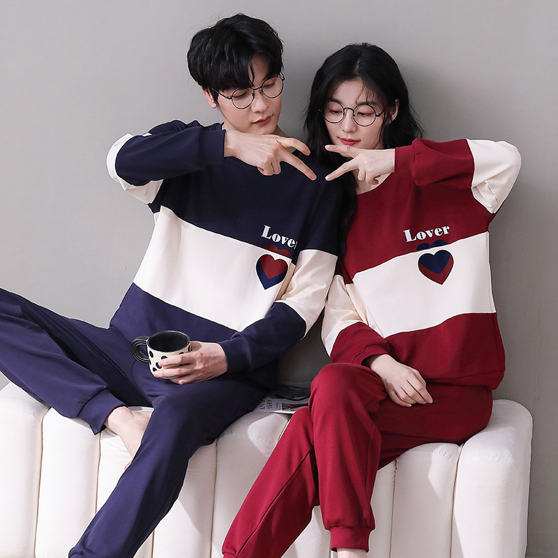 여성용 봄, 가을 순면 커플 잠옷, 한국식 패셔너블한 라운드 넥 홈웨어, 남성용 캐주얼 루즈 웨어러블 슈트스토어 가기