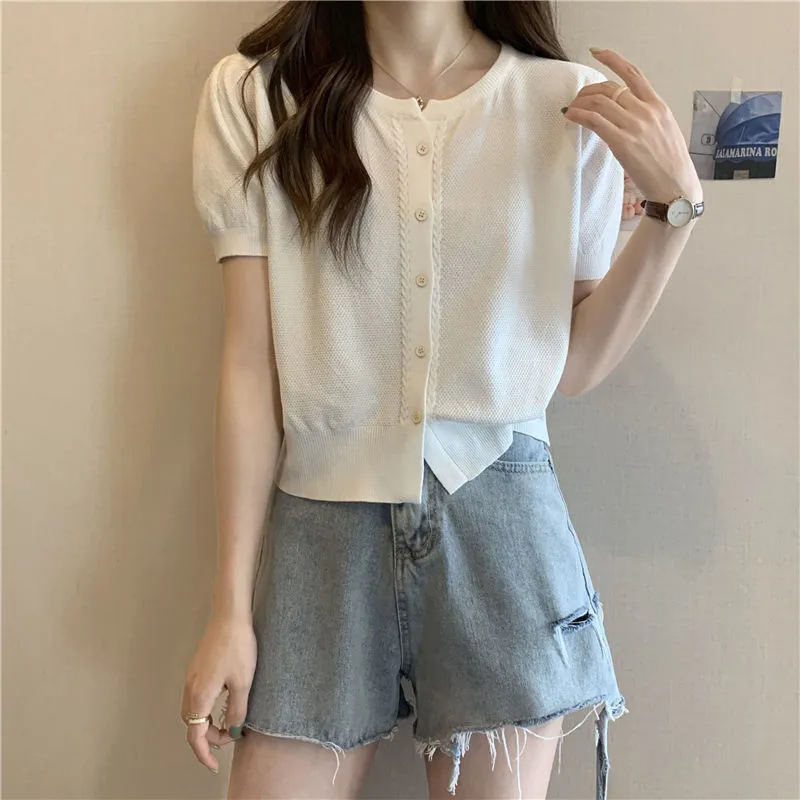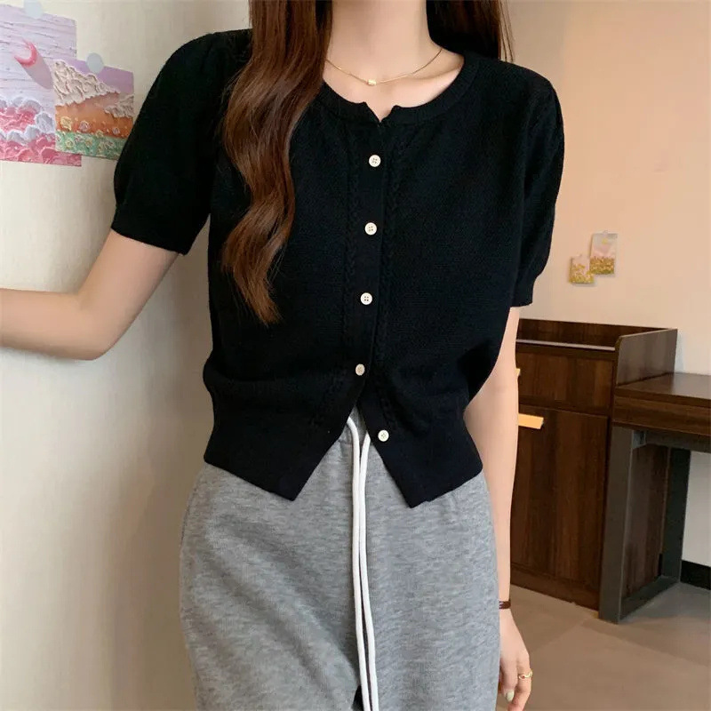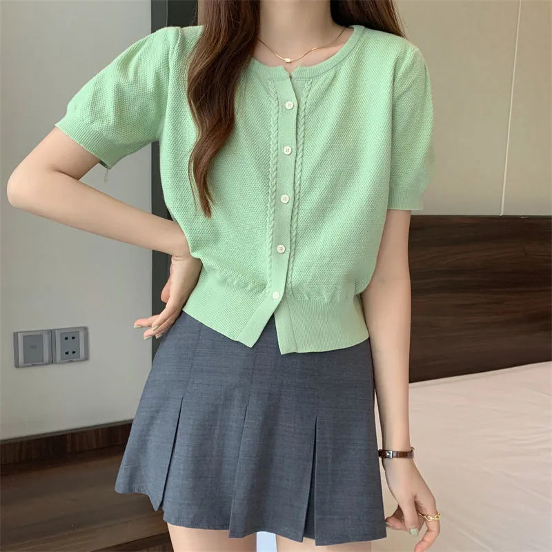홍콩 스타일 빈티지 라운드 넥 반팔 스웨터 여성용 여름 얇은 디자인 센스 슬림핏 짧은 슬림핏 트렌디 가디건 탑