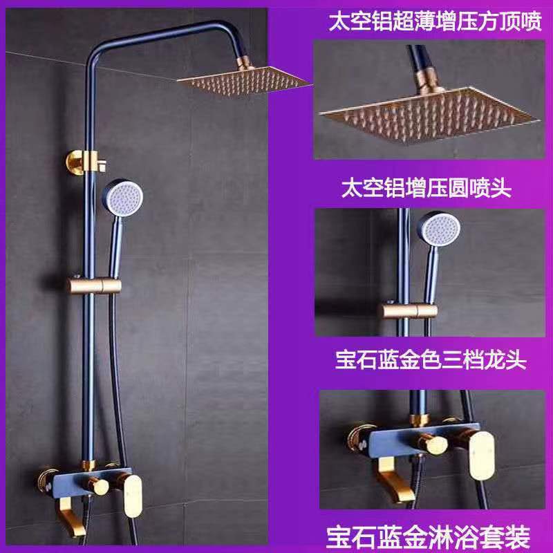 공간 알루미늄 블루 골드 샤워 세트 리프팅 뜨거운 차가운 사각형 욕실 비 부스터 샤워 헤드