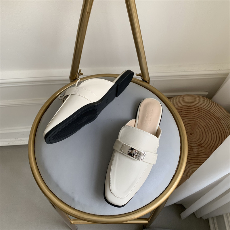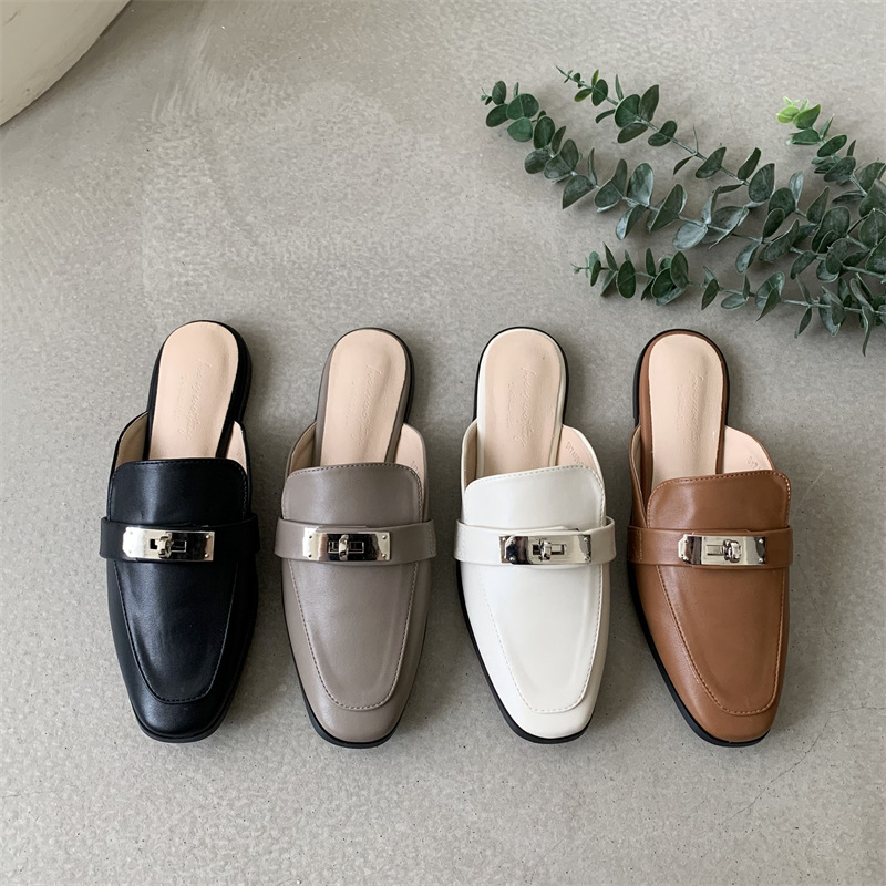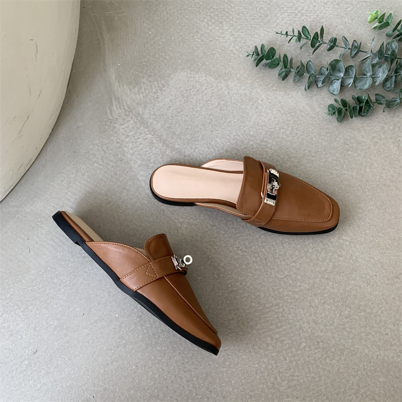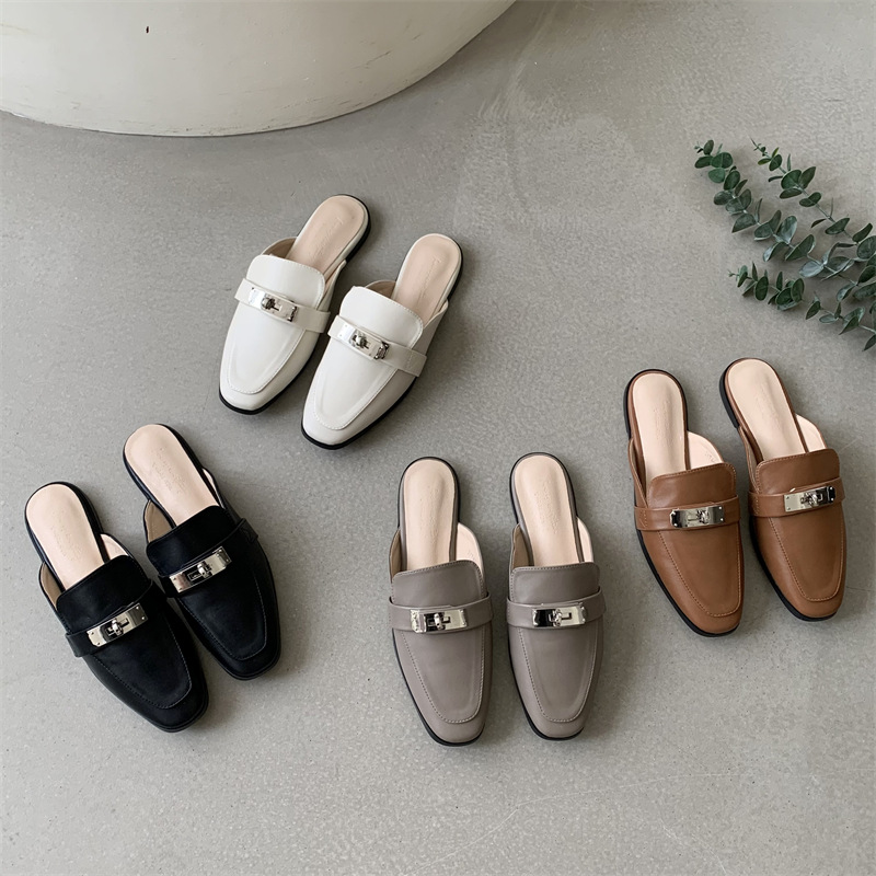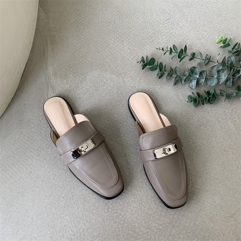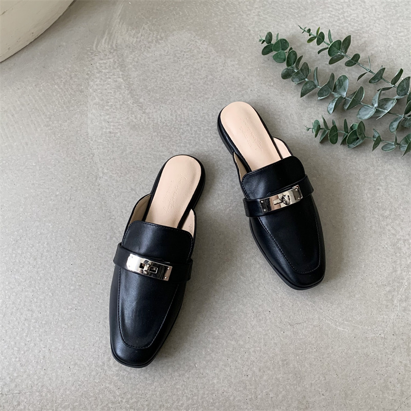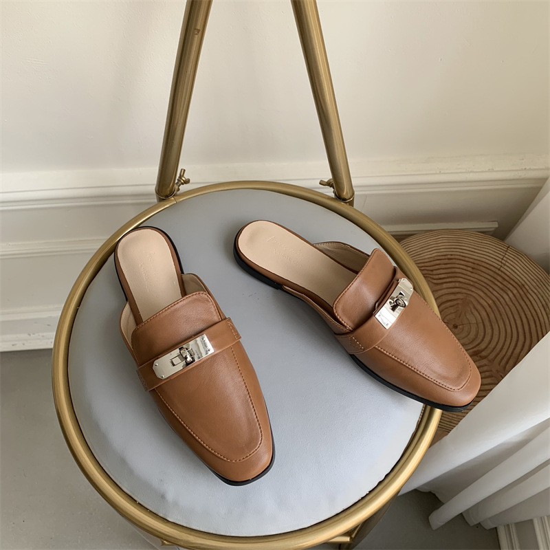 여성용 여름 슬리퍼 2025 새로운 복고풍 스퀘어 토 로우 힐 작은 가죽 신발 금속 버클 인터넷 연예인 Baotou Muller 반 슬리퍼스토어 가기