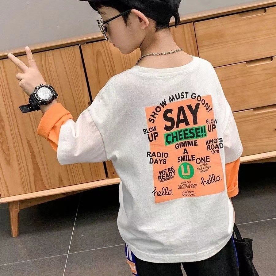 남학생 긴팔 티셔츠 2024 가을 새 어린이 봄과 가을 가짜 투피스 베이스 셔츠 큰 어린이 최고 서양 스타일 트렌디