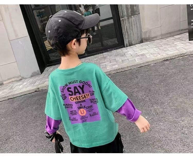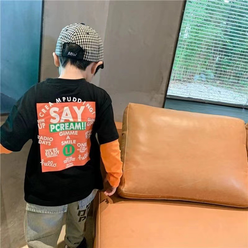 남학생 긴팔 티셔츠 2024 가을 새 어린이 봄과 가을 가짜 투피스 베이스 셔츠 큰 어린이 최고 서양 스타일 트렌디스토어 가기