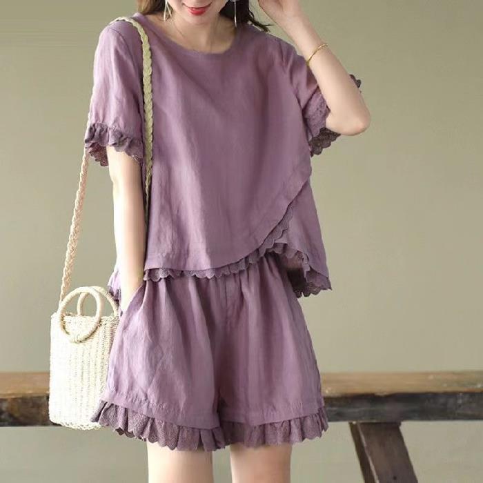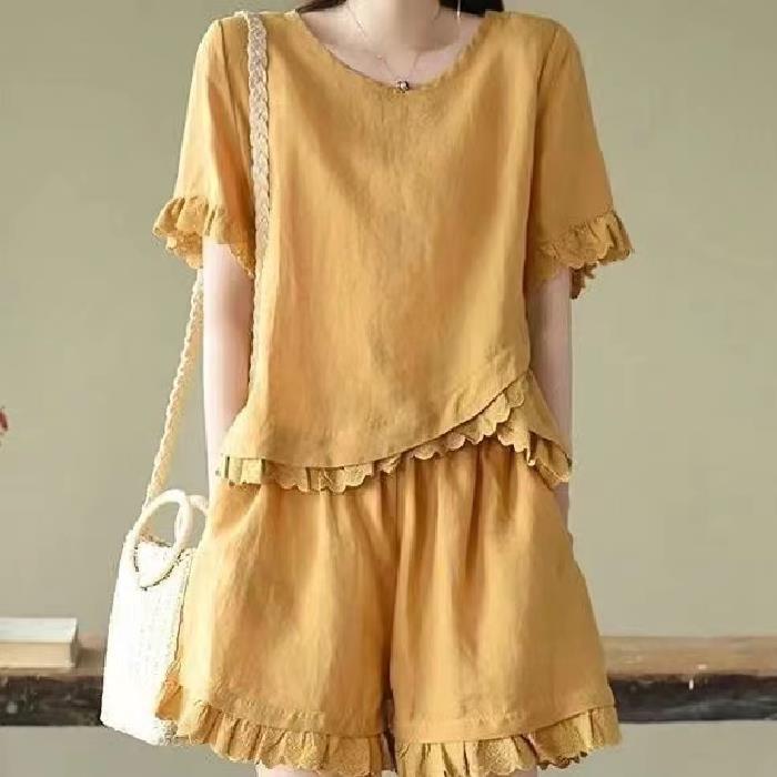 순수 코튼 슈트 2024 여름 불규칙한 코튼과 린넨 루즈 탑 대형 캐주얼 와이드 레그 반바지 예술적 투피스 세트스토어 가기