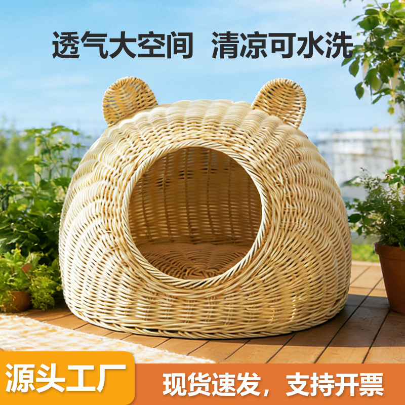 사계절 사용 가능한 세탁 가능한 짠 고양이 둥지, 반밀폐형 고양이 여름 애완 동물 둥지, 통기성 등나무 고양이 둥지스토어 가기