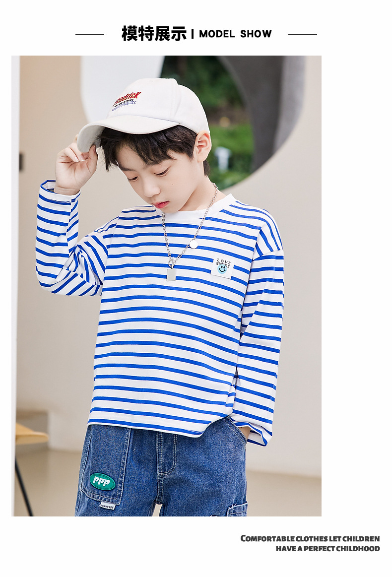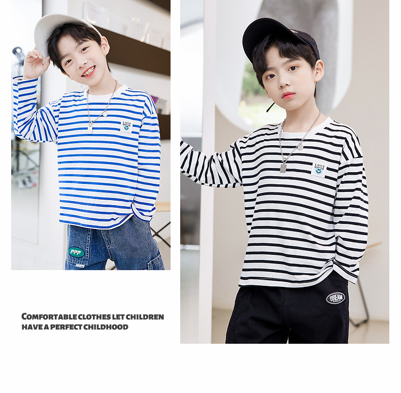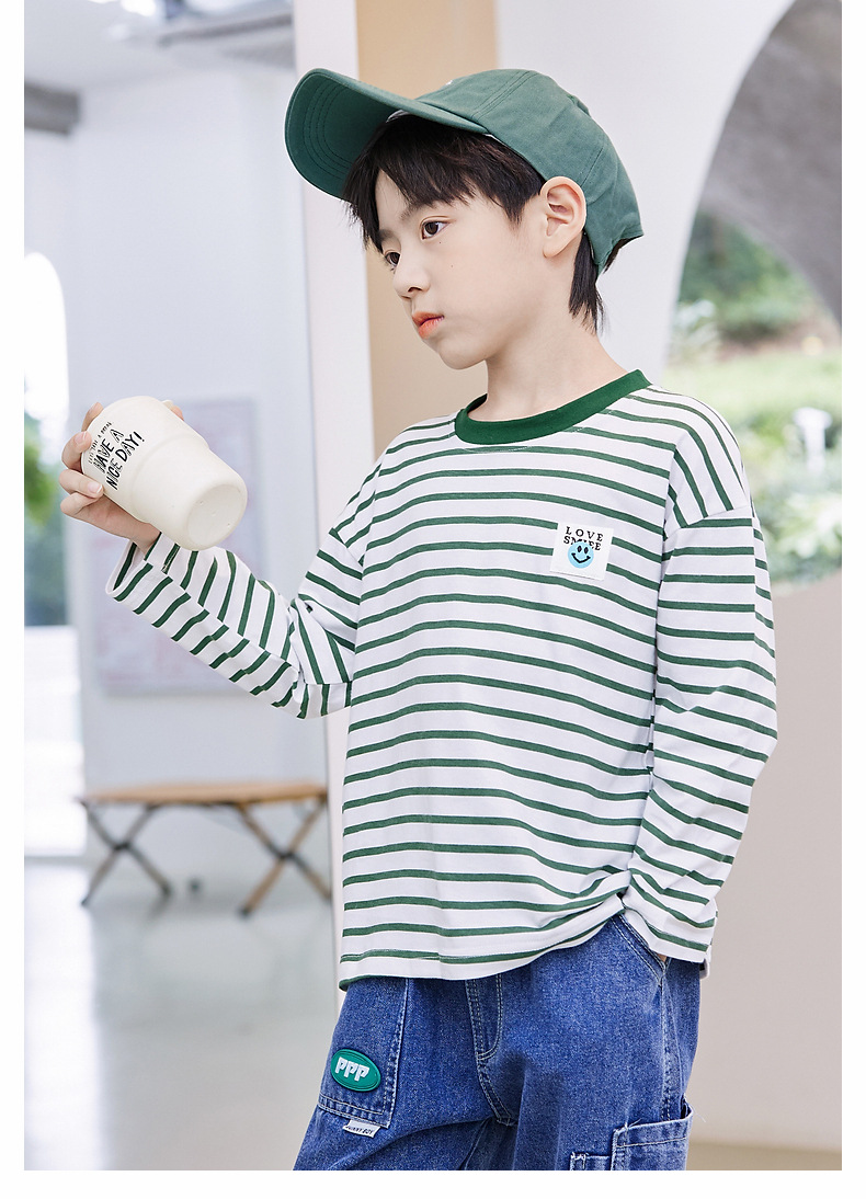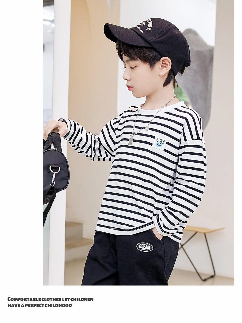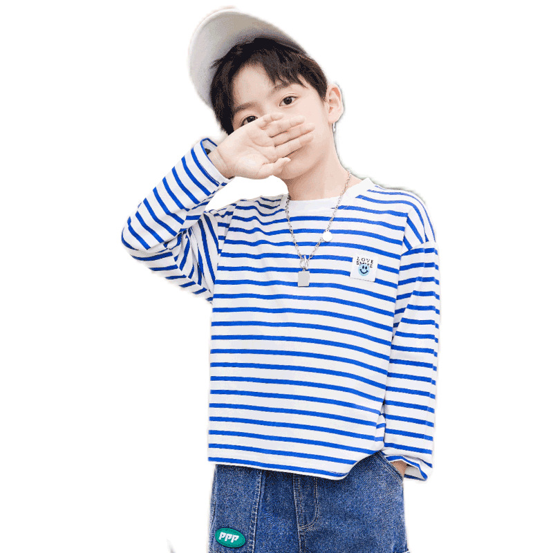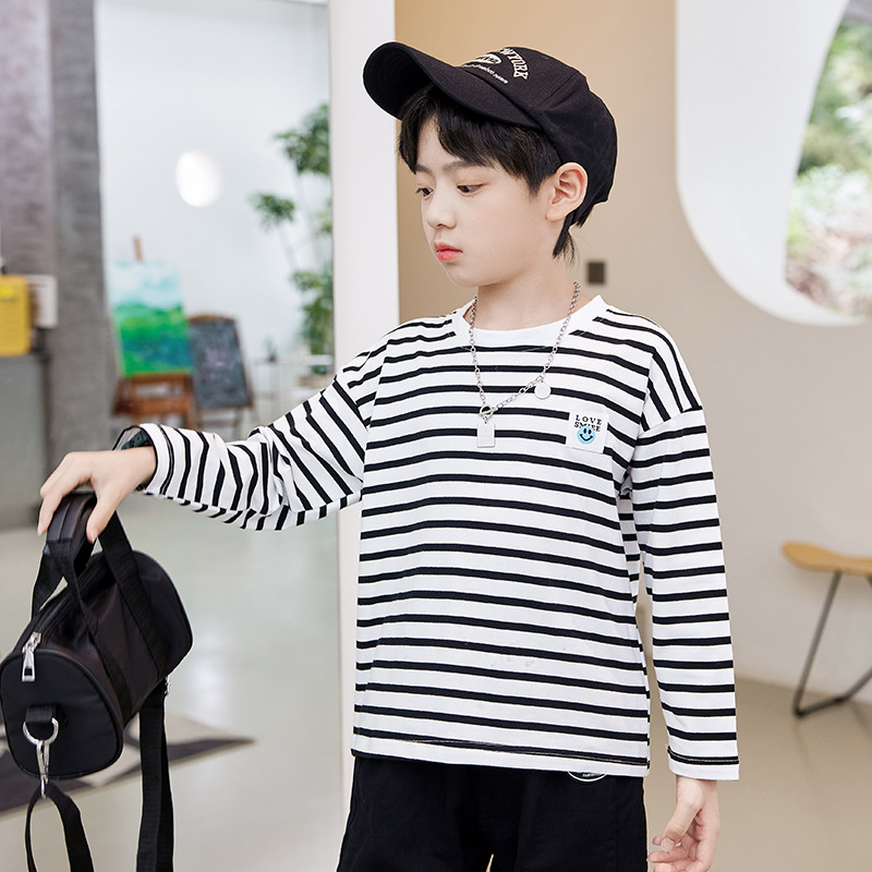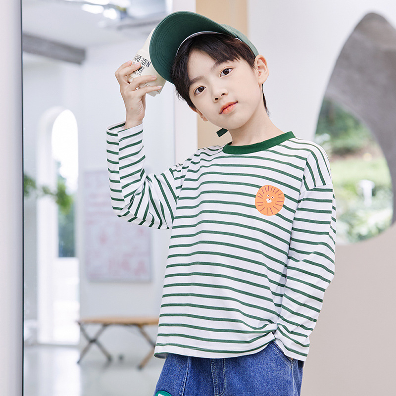 한국판 스트라이프 프린트 아동용 긴팔 티셔츠, 면 100% 라운드넥 남아용 봄 상의, 아동복 공장 직배송스토어 가기