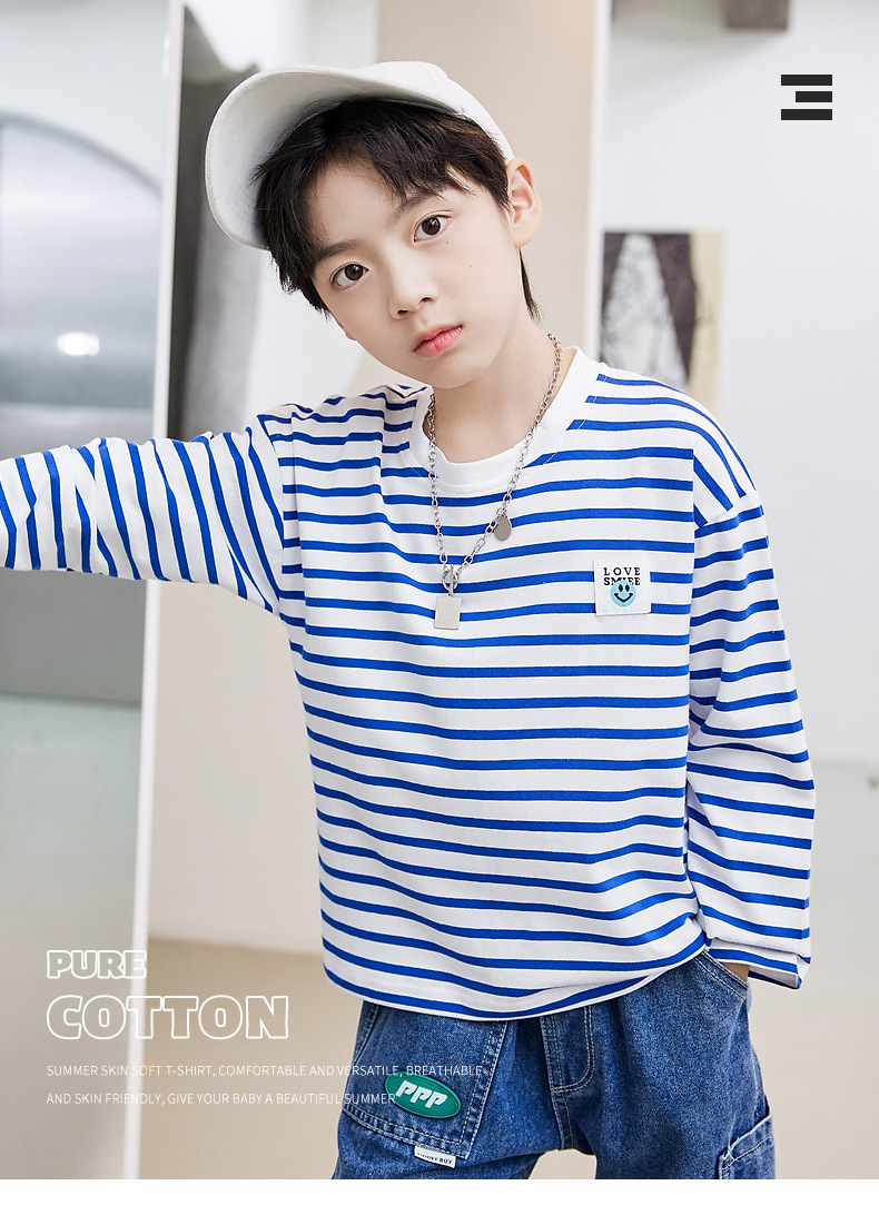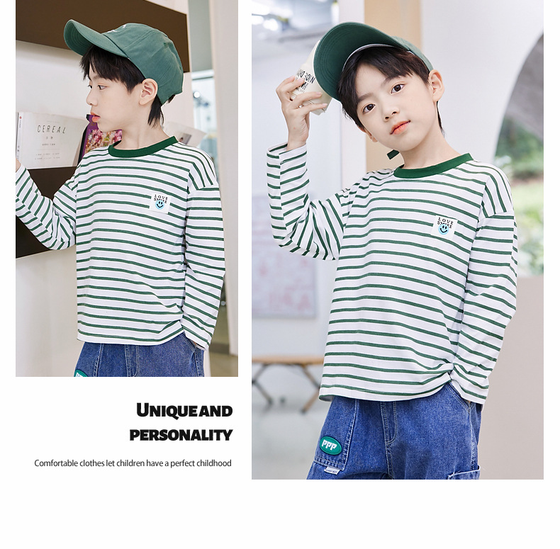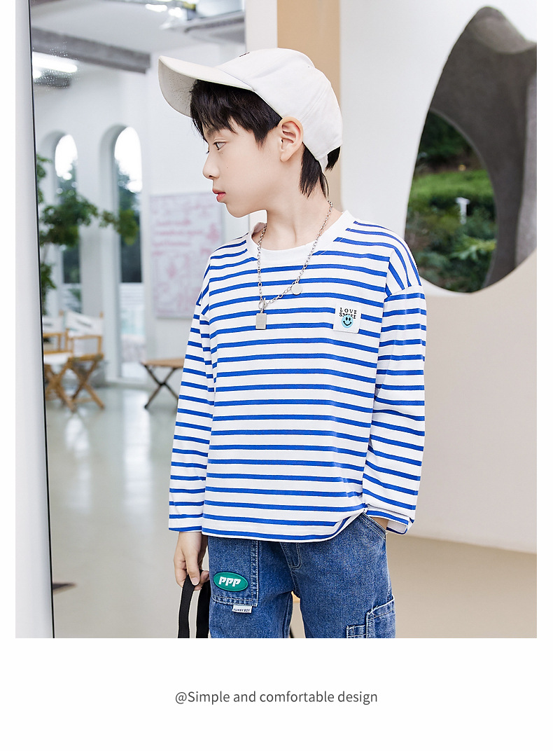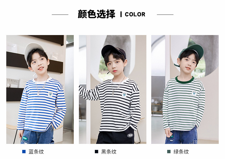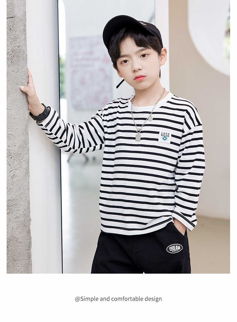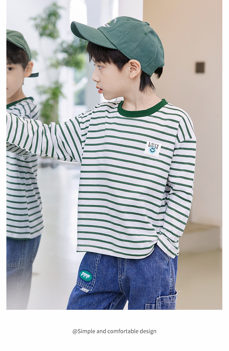 한국판 스트라이프 프린트 아동용 긴팔 티셔츠, 면 100% 라운드넥 남아용 봄 상의, 아동복 공장 직배송스토어 가기