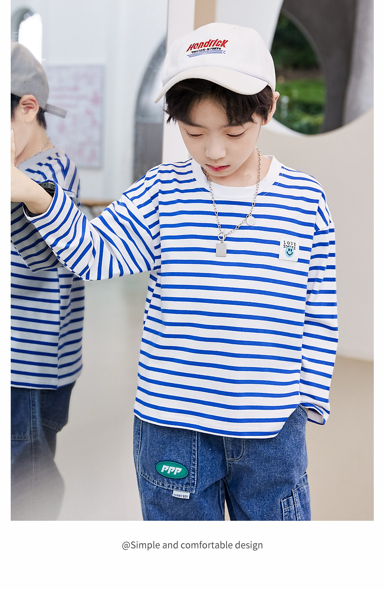 한국판 스트라이프 프린트 아동용 긴팔 티셔츠, 면 100% 라운드넥 남아용 봄 상의, 아동복 공장 직배송