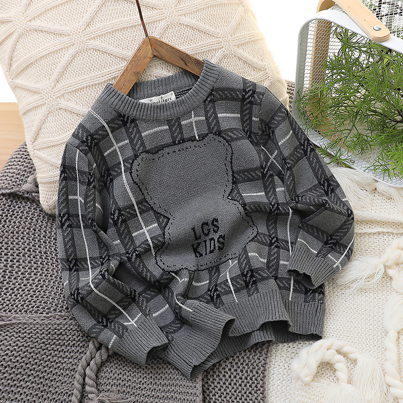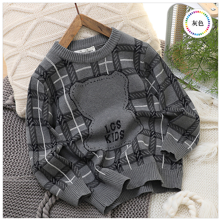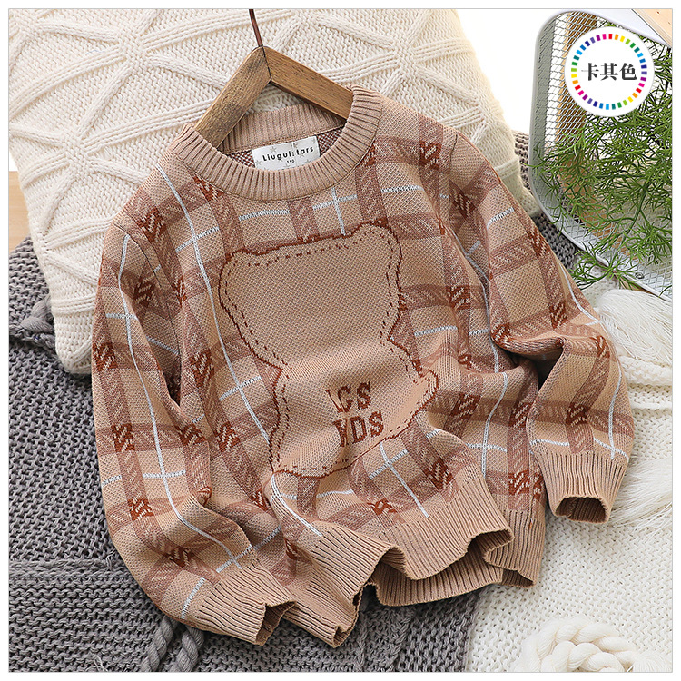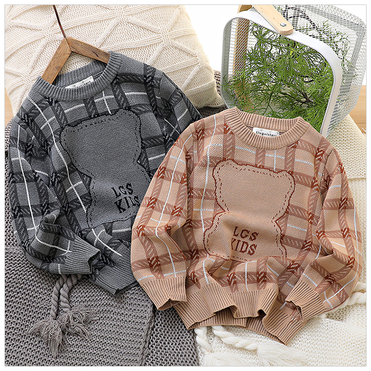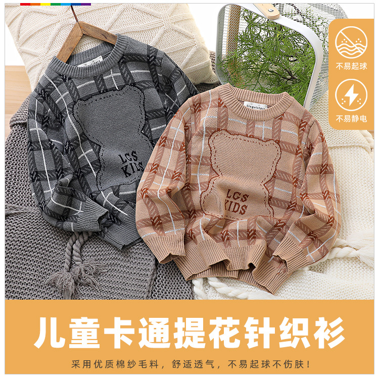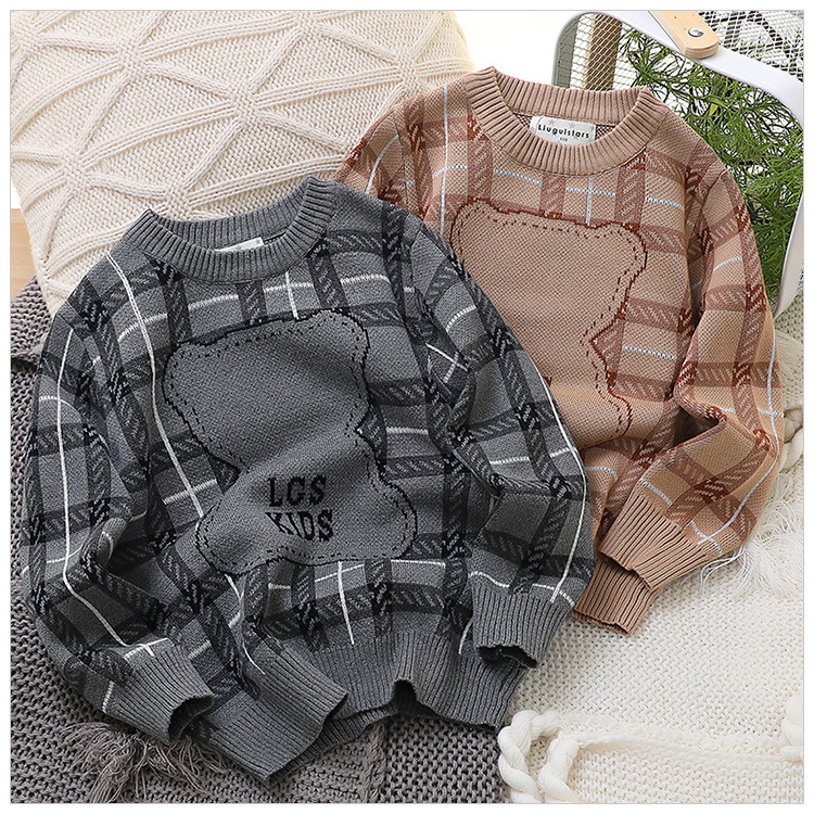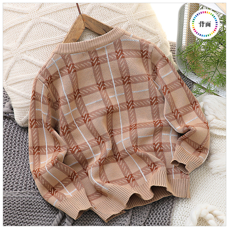 가을 2023 소년의 니트웨어 긴 소매 크루넥 자카드 풀오버 트렌디 격자 무늬 면 대형 어린이 스웨터스토어 가기