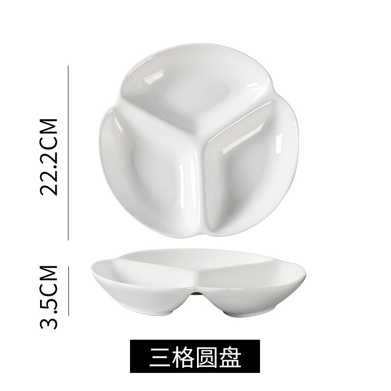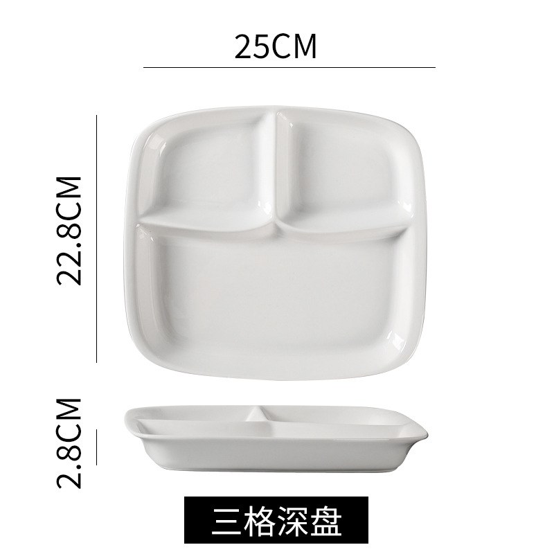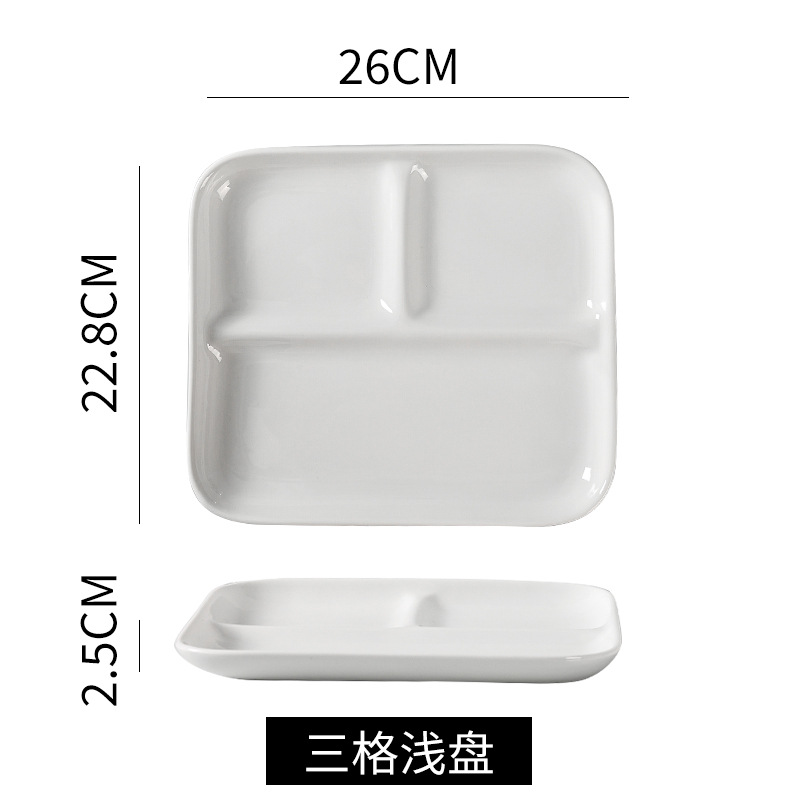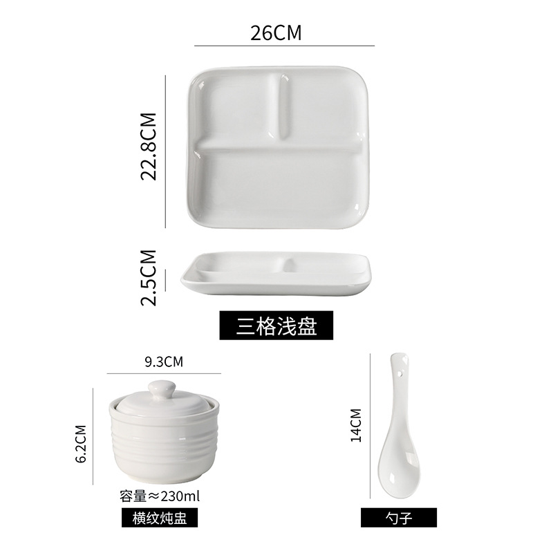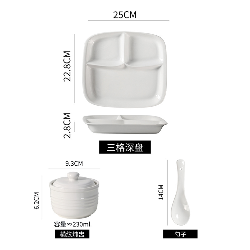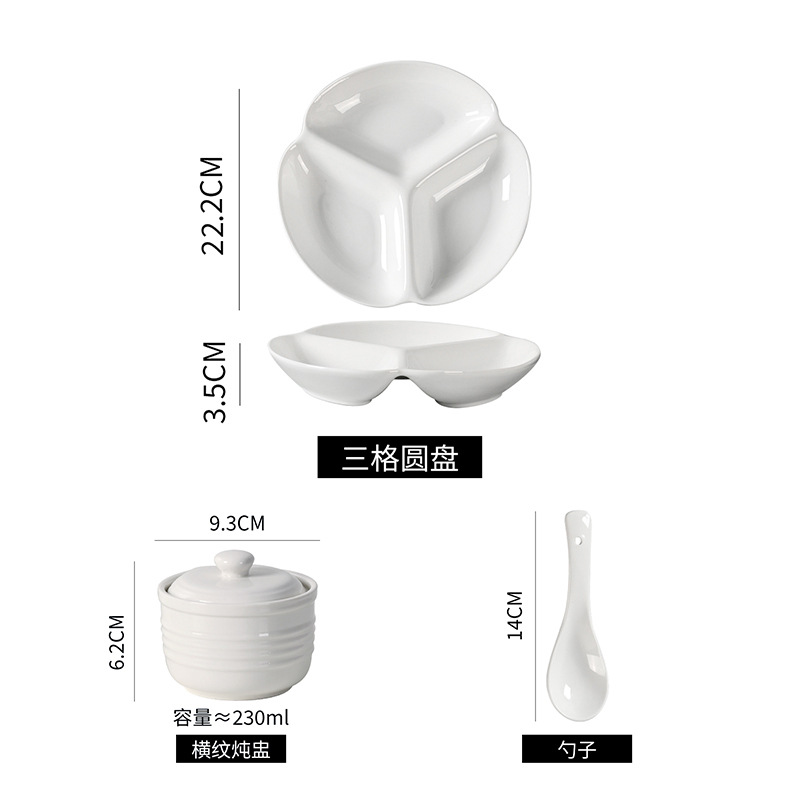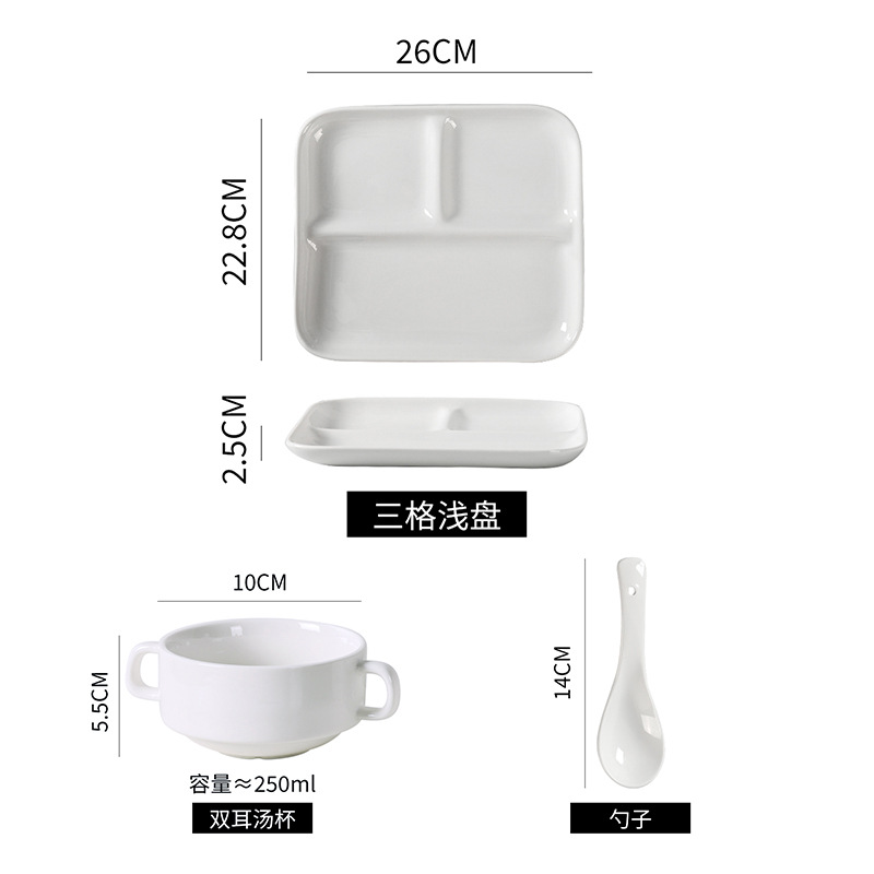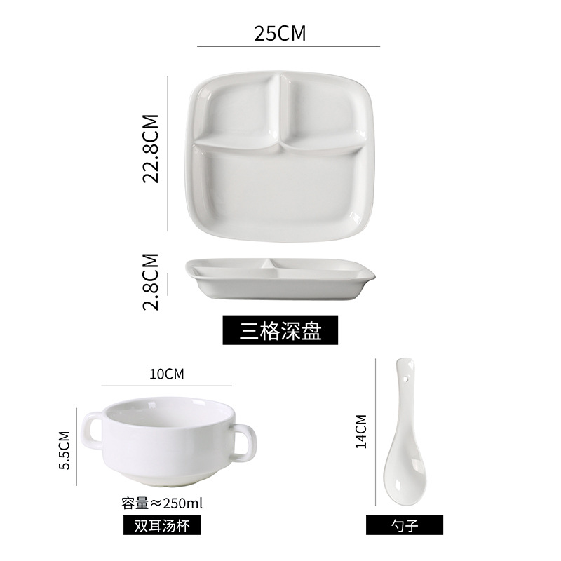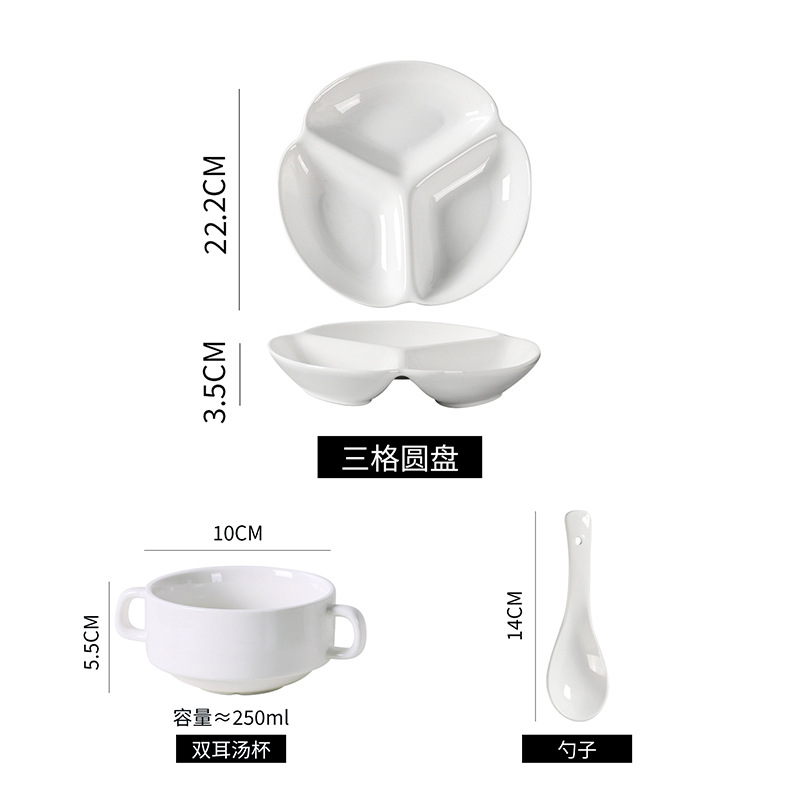 심플한 1인용 식기 세트, 순백색 세라믹 3칸 접시, 구내식당용 밥그릇, 분리형 접시, 작은 국그릇 세트