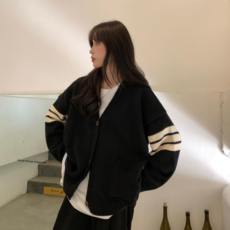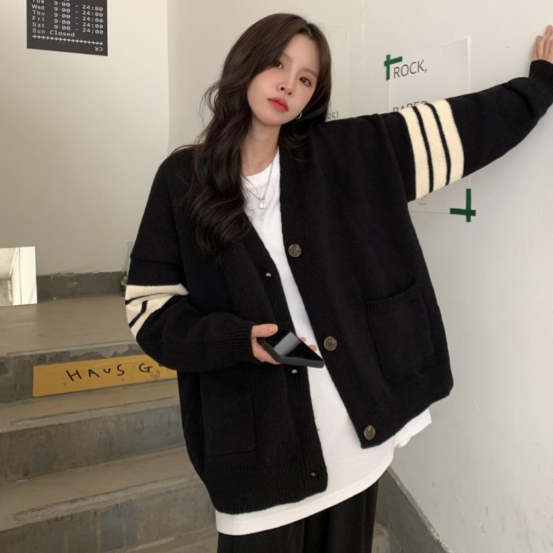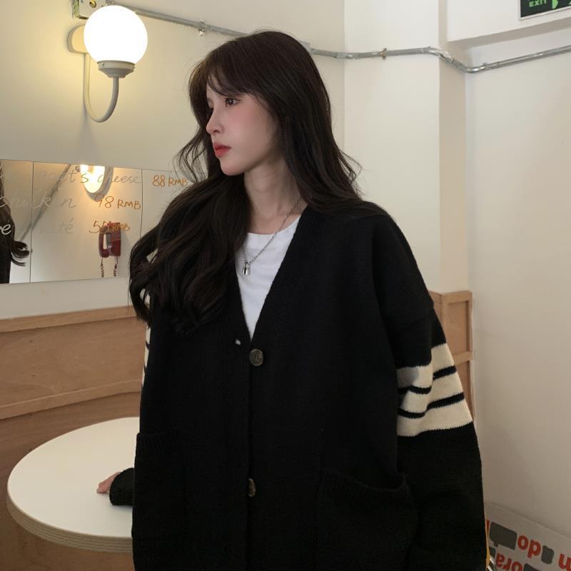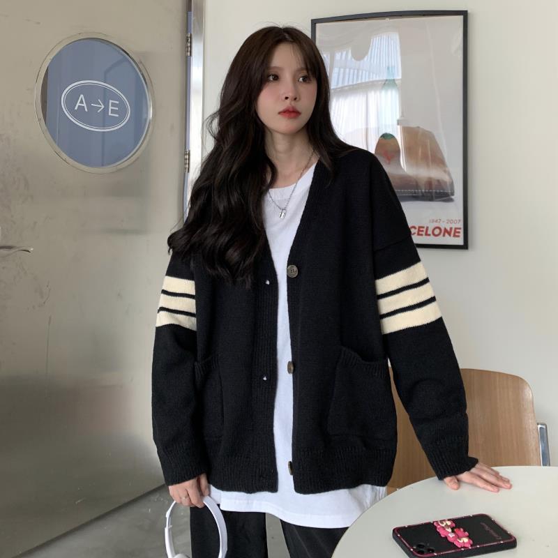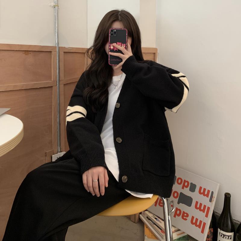 국경 간 eBay2025 가을, 겨울 게으른 스타일 한국 스타일 디자인 여성용 느슨한 V 넥 컬러 차단 니트 스웨터 재킷스토어 가기