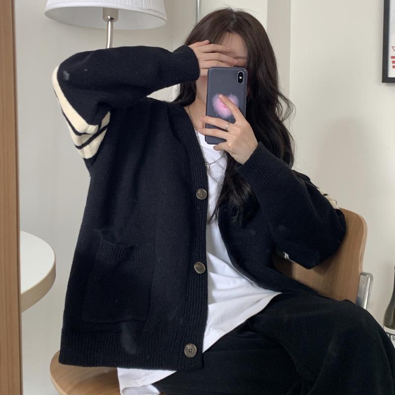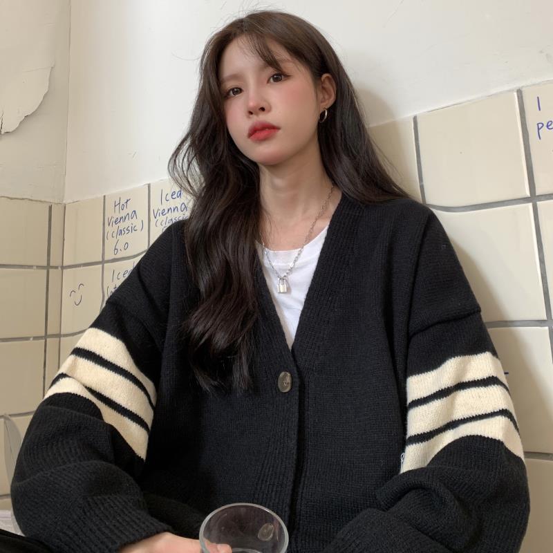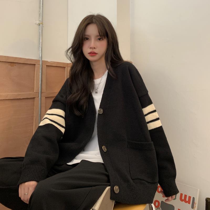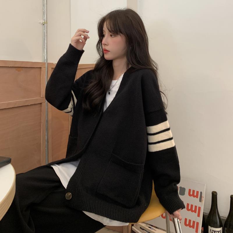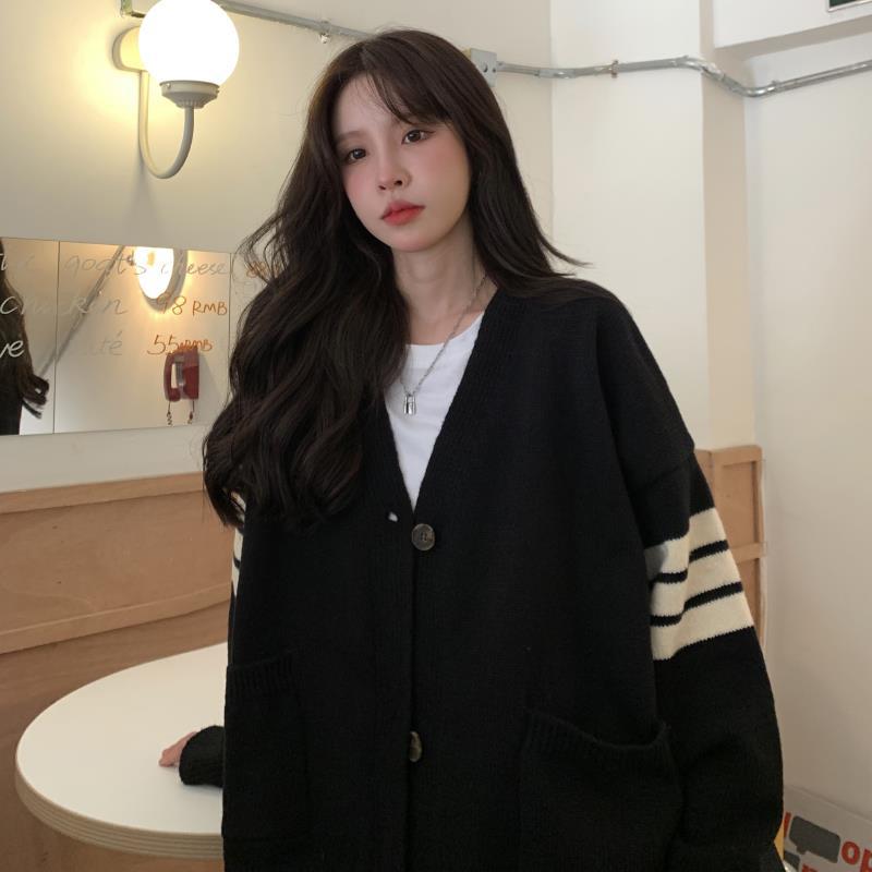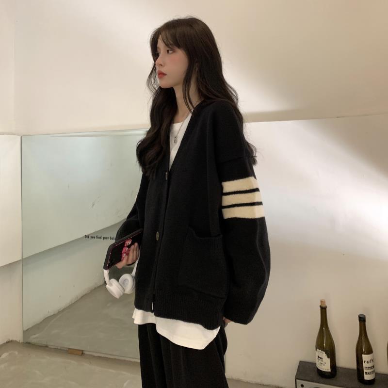 국경 간 eBay2025 가을, 겨울 게으른 스타일 한국 스타일 디자인 여성용 느슨한 V 넥 컬러 차단 니트 스웨터 재킷스토어 가기