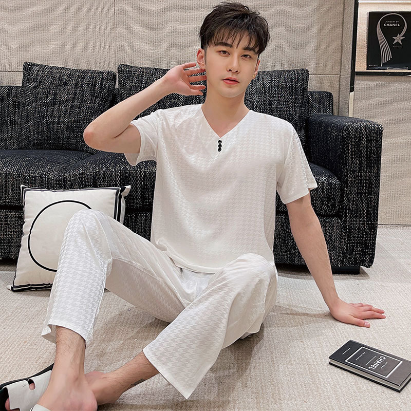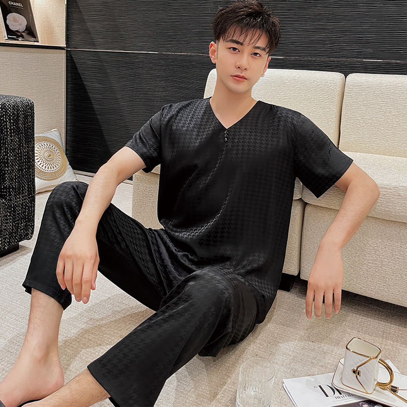 커플 잠옷 여자의 여름 얼음 실크 반팔 Houndstooth 인쇄 세트 봄과 가을 플러스 사이즈 남자의 카디건 가정 옷스토어 가기