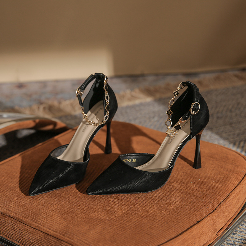 9777-3 기질 여신 심플 체인 하이힐 슈즈 뾰족한 얇은 굽 요정 샌들 여성용 싱글 슈즈 중공 신발