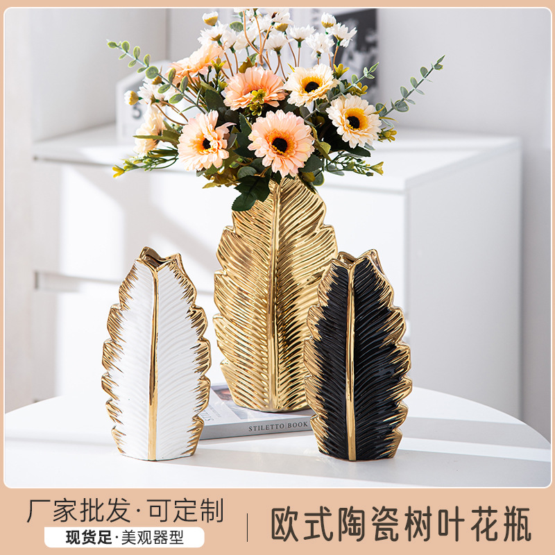 북유럽 블랙 골드 도금 잎 세라믹 꽃병 현대 간단한 홈 거실 TV 캐비닛 장식 장식품 꽃병스토어 가기
