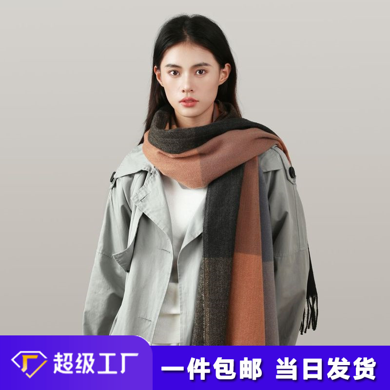 秋冬季新款韩版百搭拼色格子围巾女经典仿羊绒保暖加厚披肩围脖