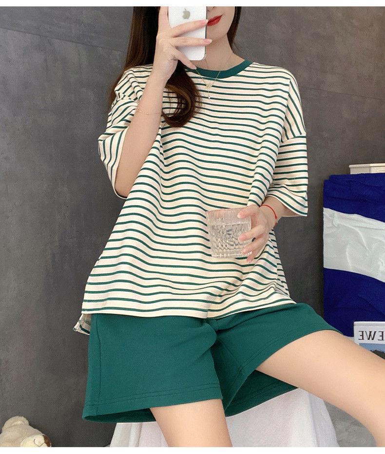 특대 사이즈 내장형 가슴 패드 일체형 잠옷 여성용 루즈핏 스트라이프 학생 캐주얼 여름 홈웨어 세트 반팔
