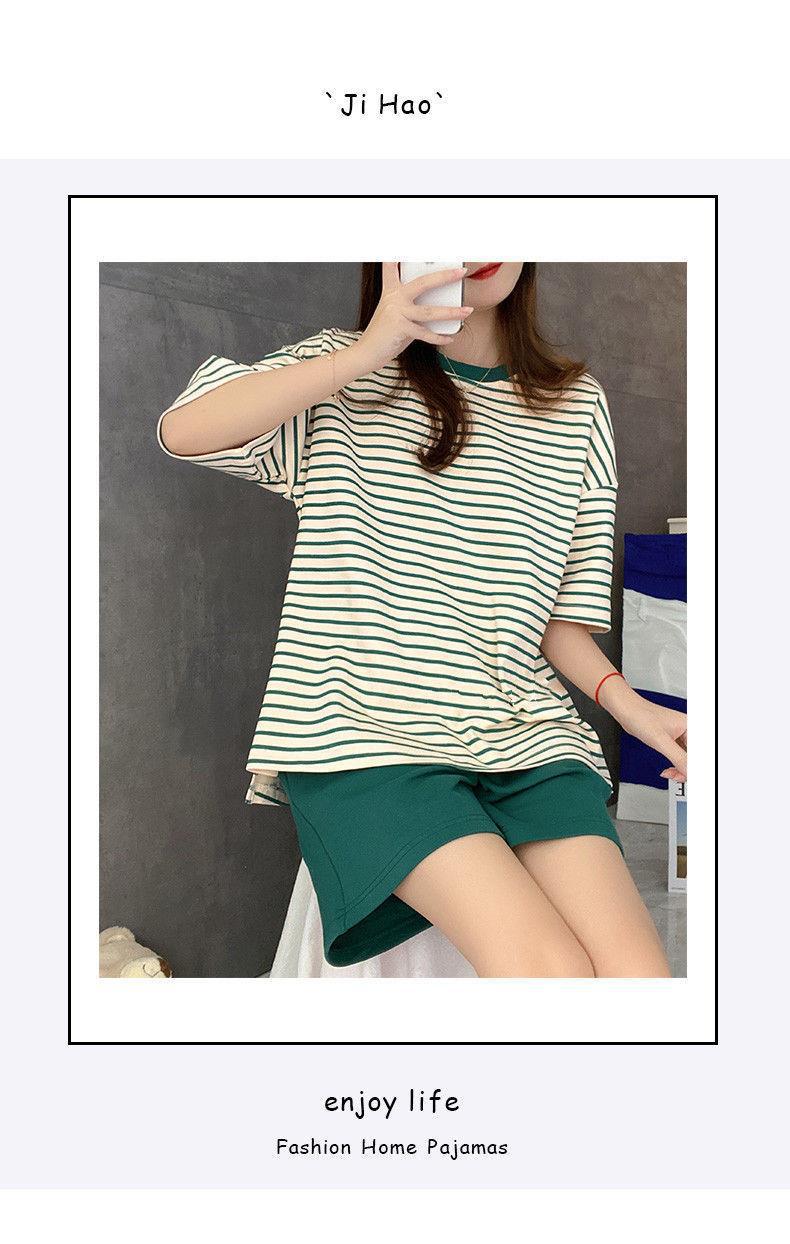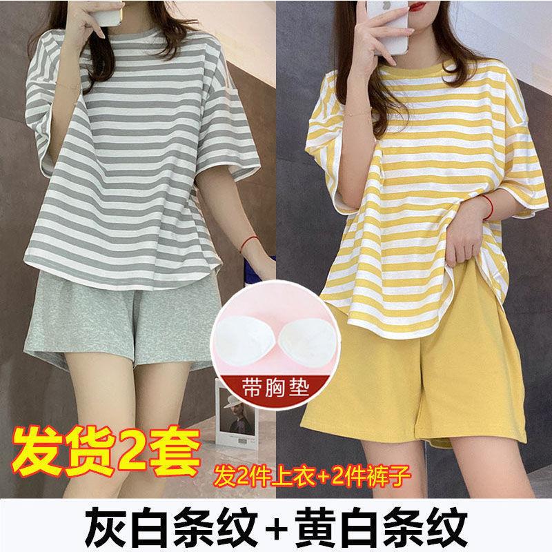 특대 사이즈 내장형 가슴 패드 일체형 잠옷 여성용 루즈핏 스트라이프 학생 캐주얼 여름 홈웨어 세트 반팔스토어 가기