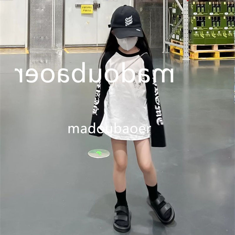 여아 2026 가을 신상 아동 캐주얼 프린트 래글런 슬리브 티셔츠 베이비 한국 스타일 루즈핏 중간 길이 상의