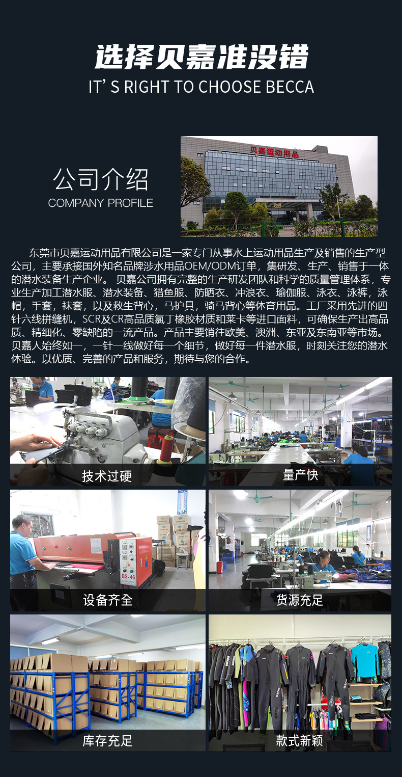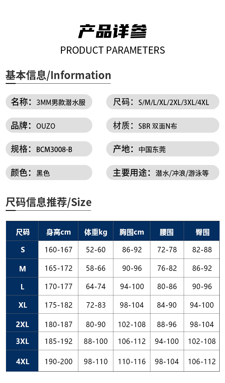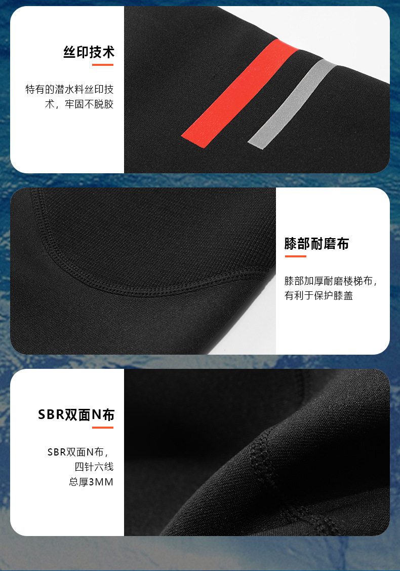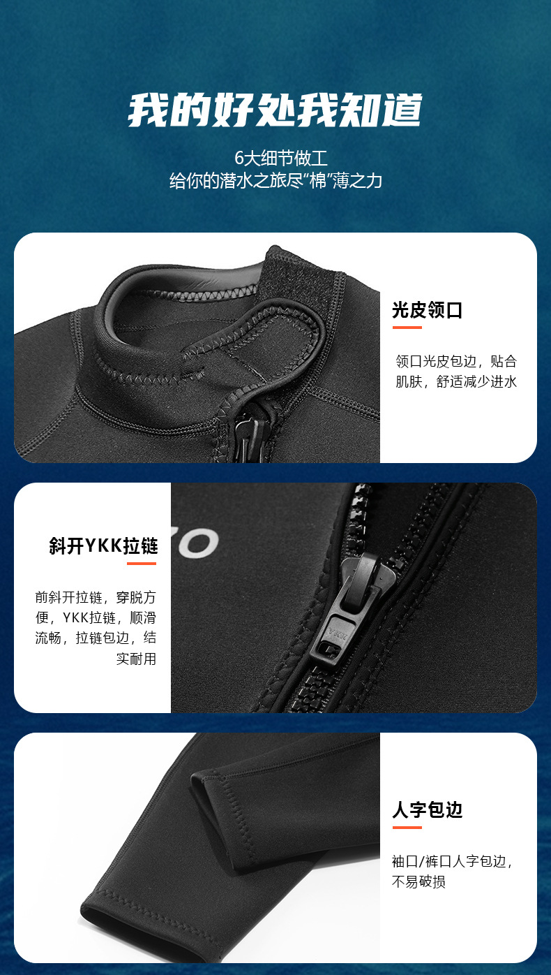 2)后开YKK拉链款,黑灰色,领口包边,袖口/裤口人字卷边,耐磨护膝,SBR双面N布,四针六线,总厚3mm 。
